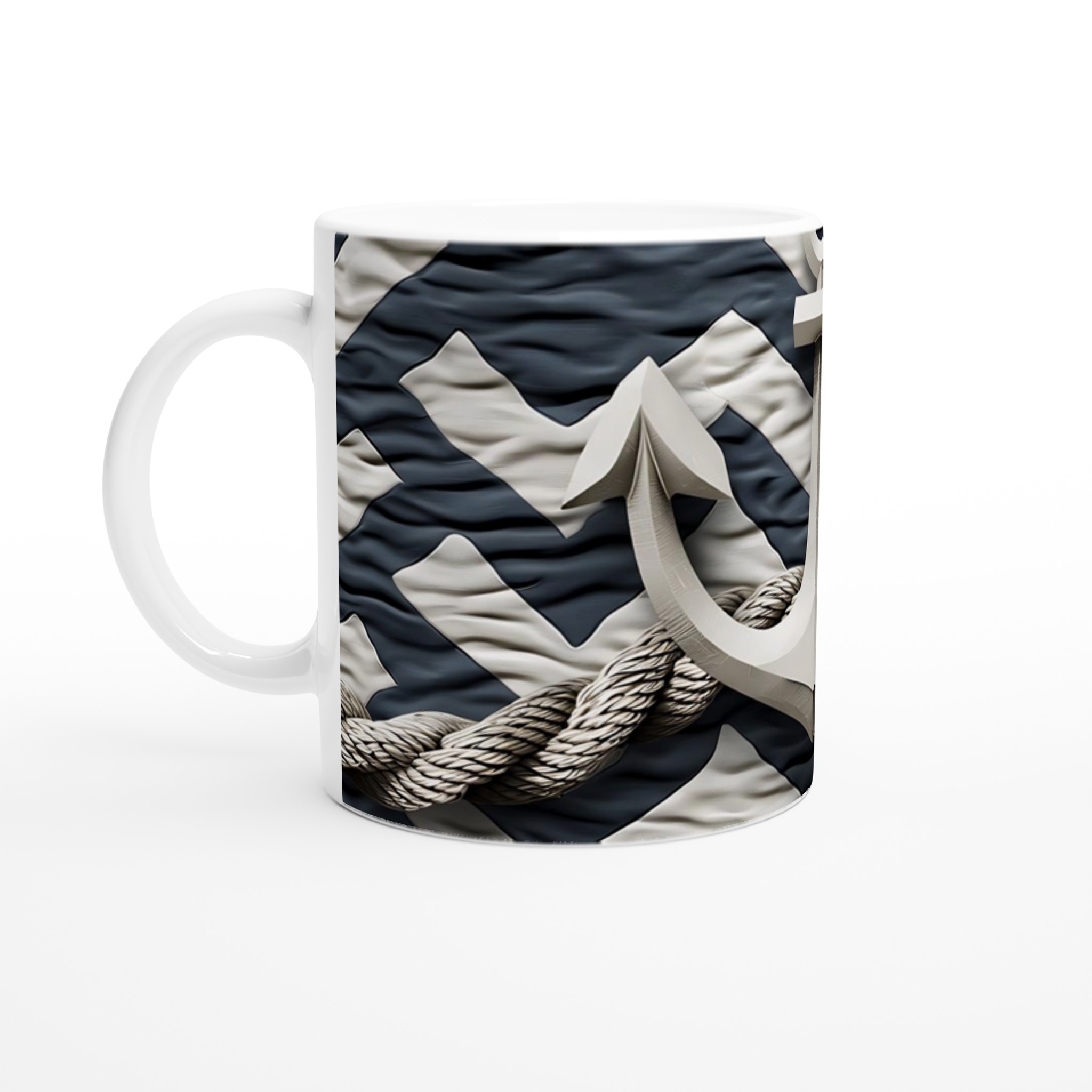 Inspirerad av havets lugn och tidlösa elegans, denna mugg har ett detaljerat tryck av ett ankare omfamnat av robust rep, mot en bakgrund av böljande marinblå och vit sjömansrand. Den blanka ytan ger ett skarpt och levande tryck som verkligen sticker ut, oavsett om det är en personlig design, ett roligt citat eller en present till någon du tycker om.