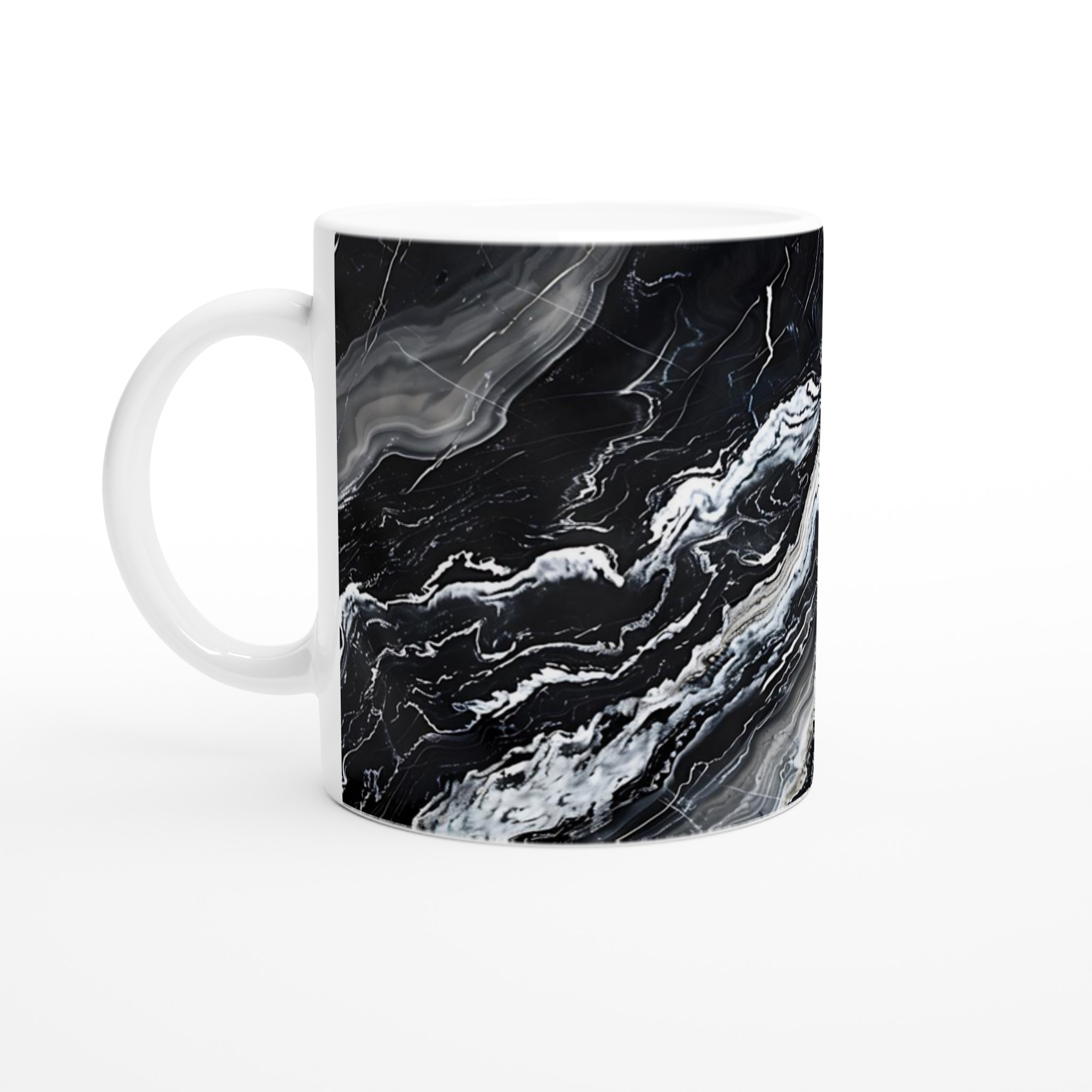 Inspirerad av den tidlösa skönheten hos marmor, fångar denna mugg elegansens essens med sina flytande linjer och dramatiska kontraster i svart, vitt och grått. Den blanka vita ytan ger ett skarpt och levande tryck som verkligen sticker ut, oavsett om det är en personlig design, ett roligt citat eller en present till någon du tycker om.