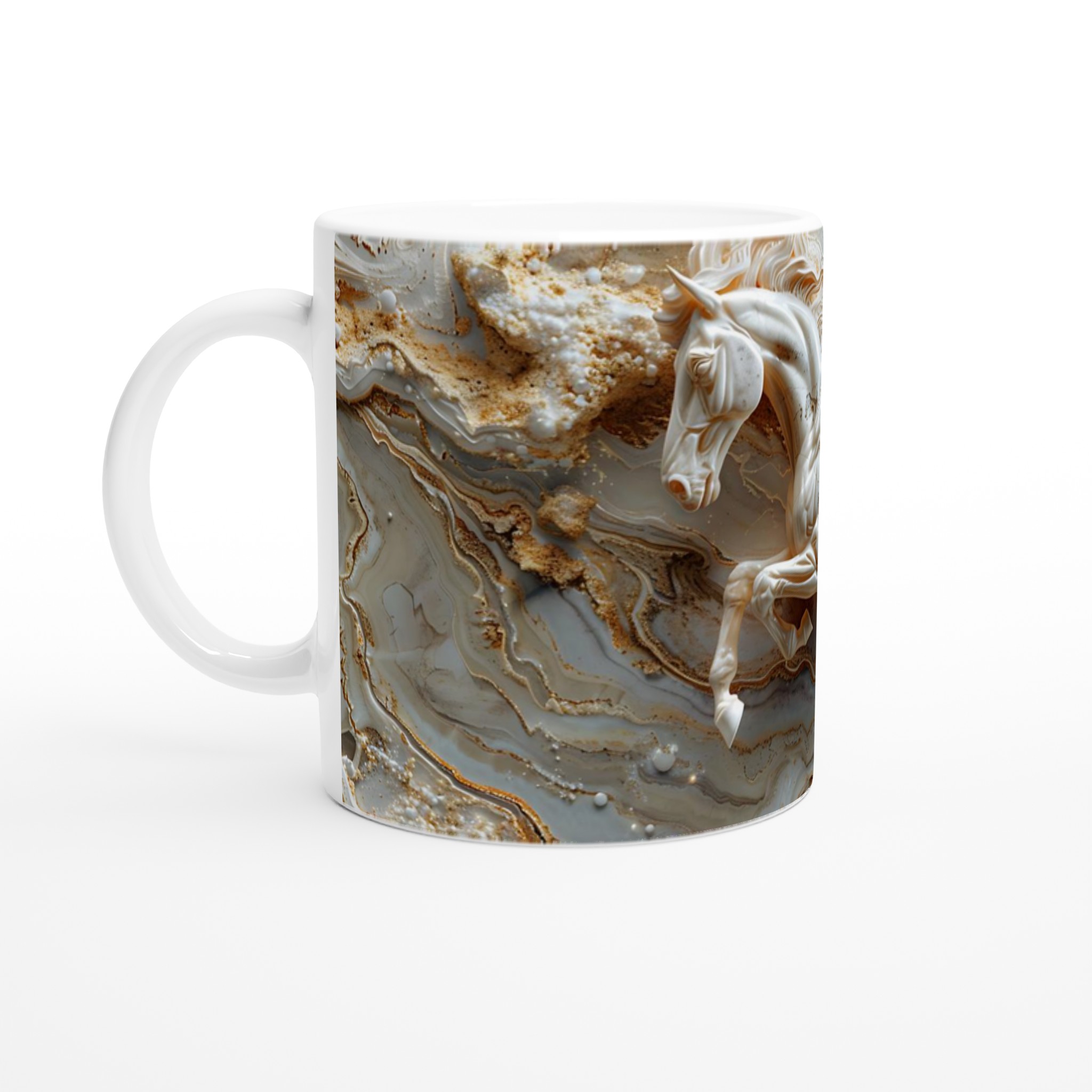 Inspirerad av den majestätiska skönheten hos en marmorerad häst staty, omgiven av flytande guld och krämiga toner, blir denna mugg ett konstverk i din hand. Den blanka vita ytan ger ett skarpt och levande tryck som verkligen sticker ut, oavsett om det är en personlig design, ett roligt citat eller en present till någon du tycker om.