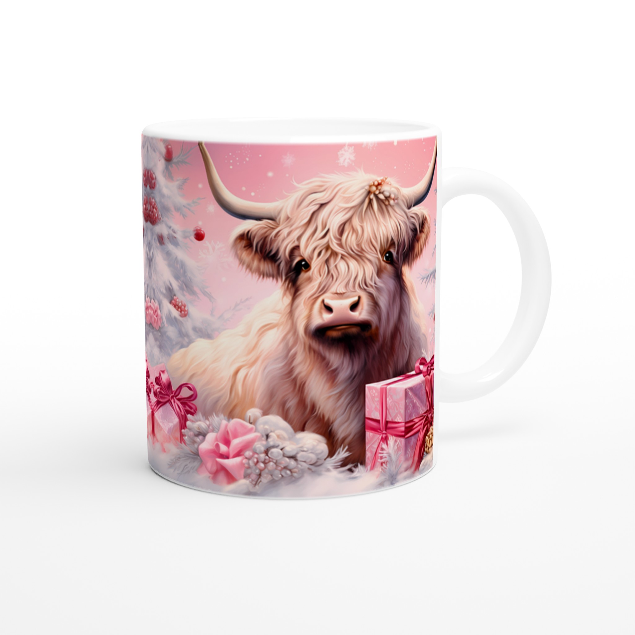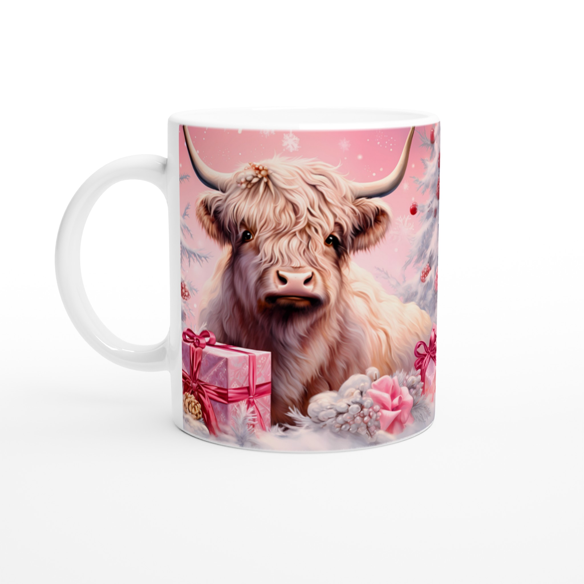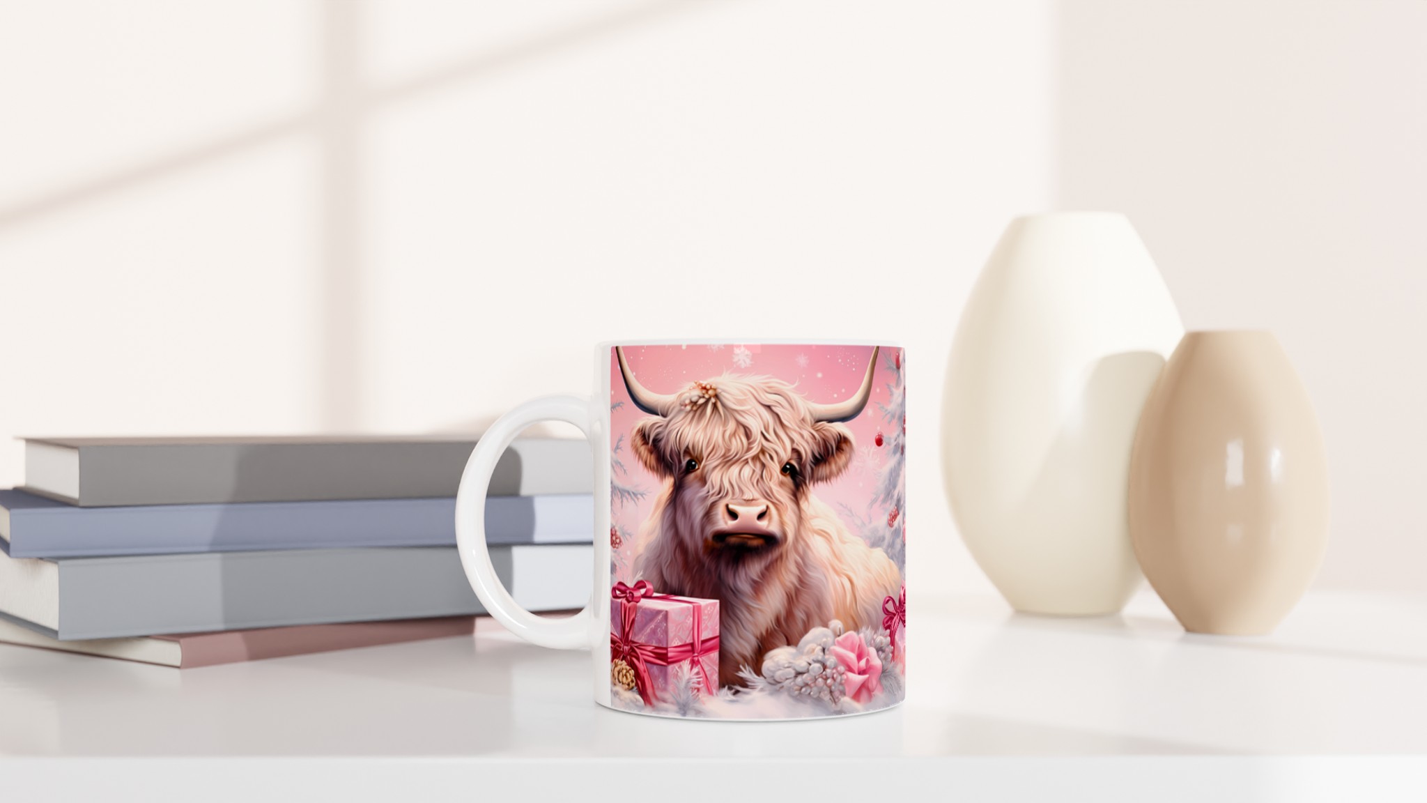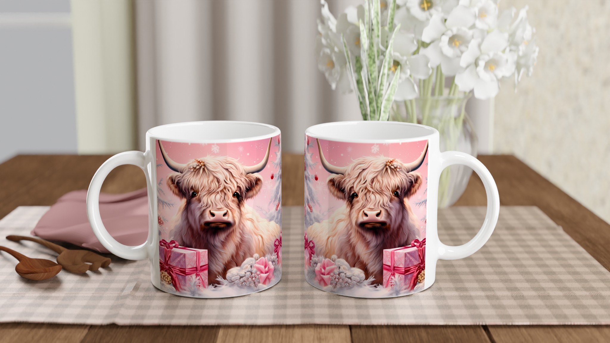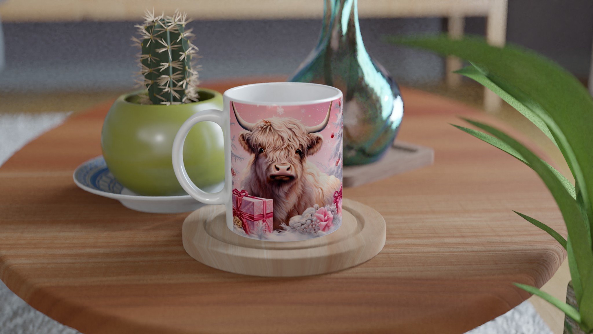 Fånga den mest hjärtevärmande känslan av jul med vår ”Mjuk Julglädje” keramiska mugg. En bedårande, ullig Highland Cattle-ko pryder denna mugg, omgiven av vinterlika rosa och vita dekorationer, inslagna presenter och snöflingor. Denna bild framkallar en känsla av lugn, glädje och den mysiga atmosfären av en julafton, perfekt för alla som älskar djur och den magiska högtiden.