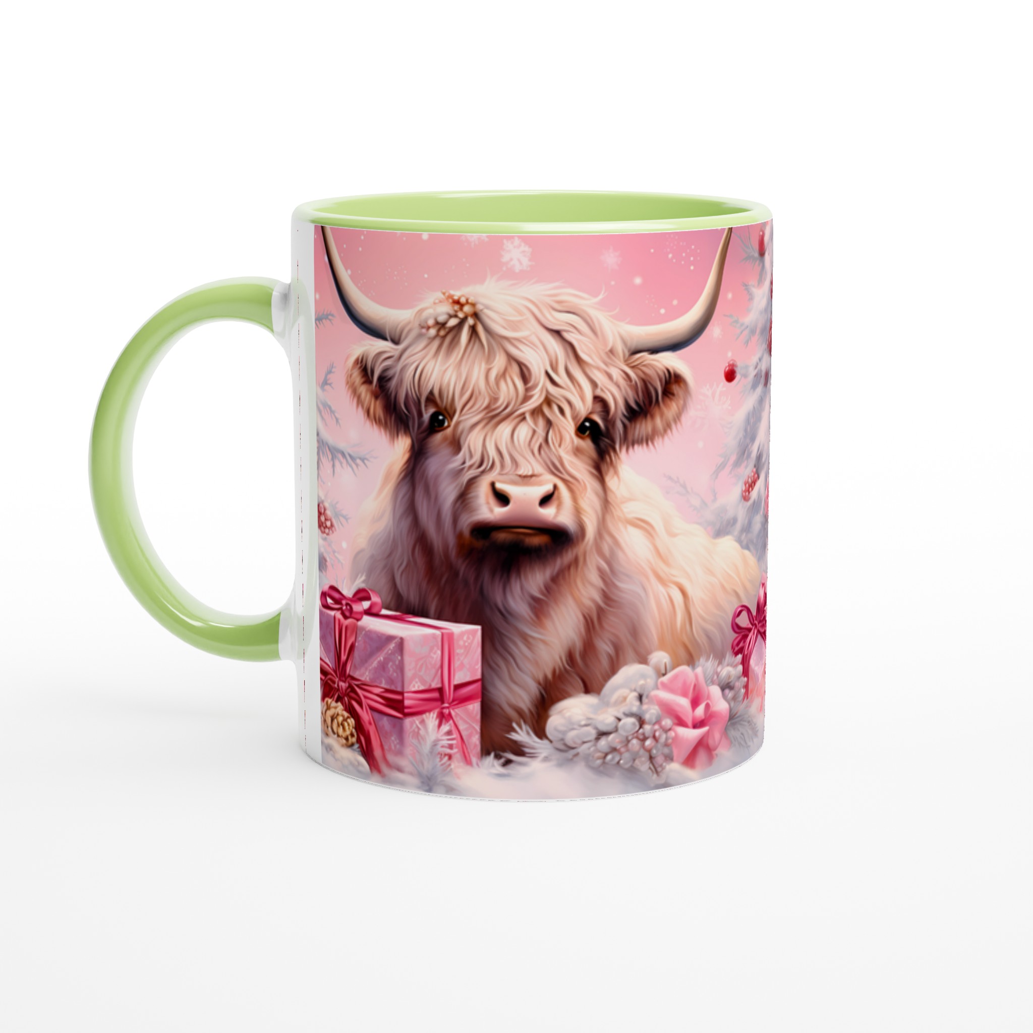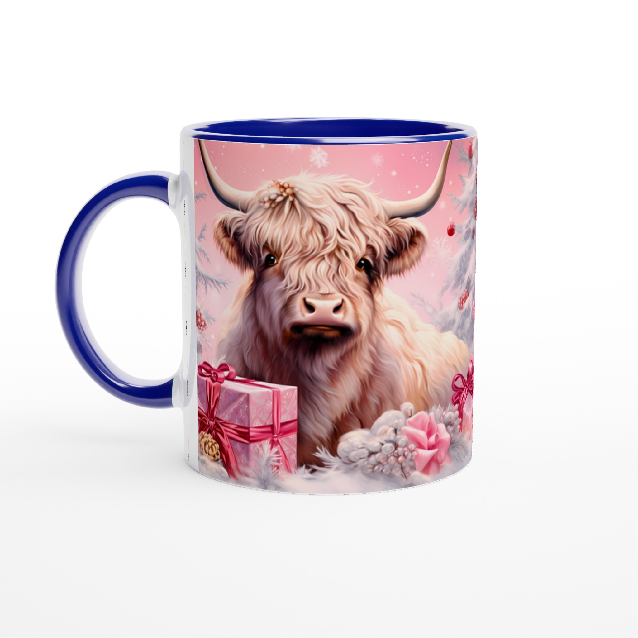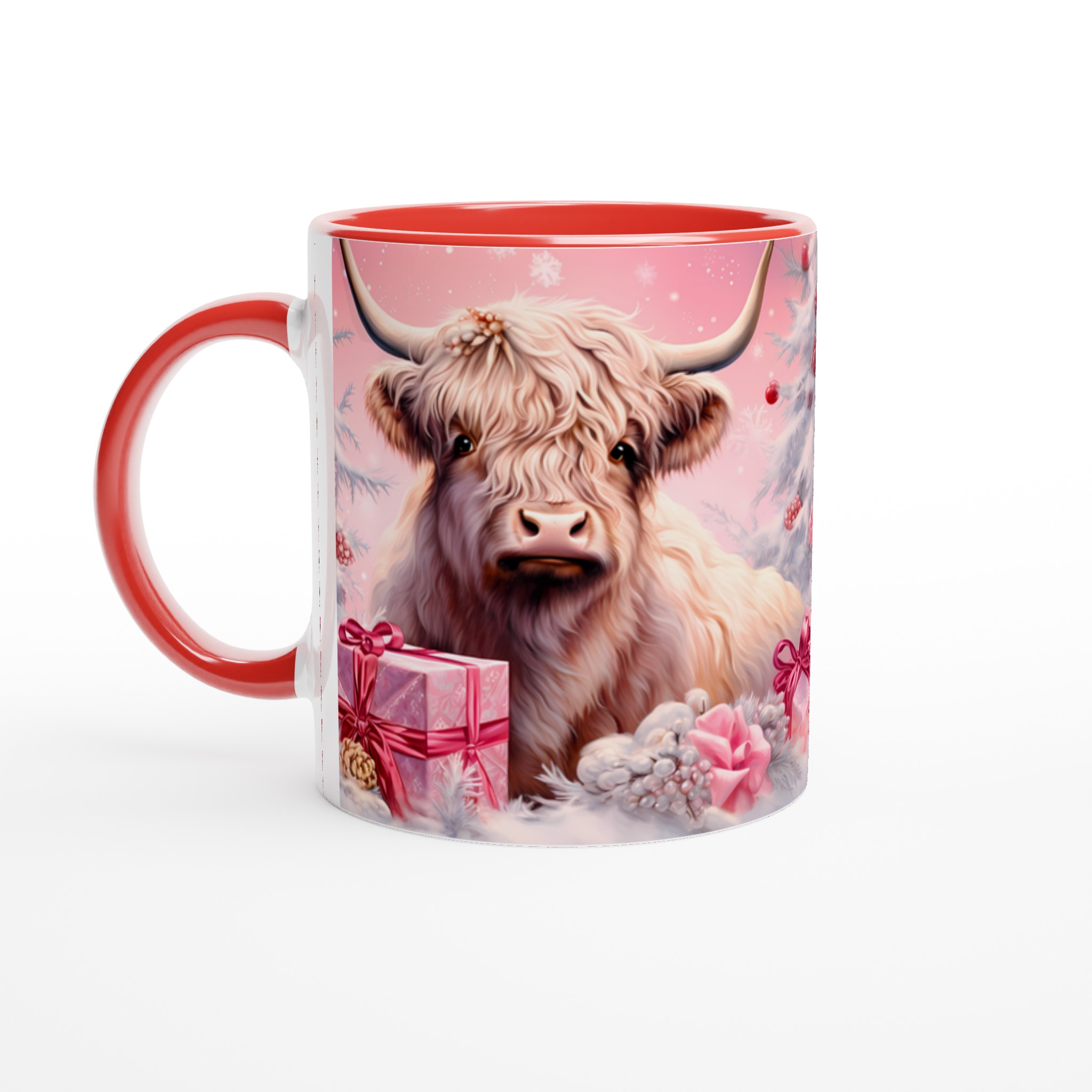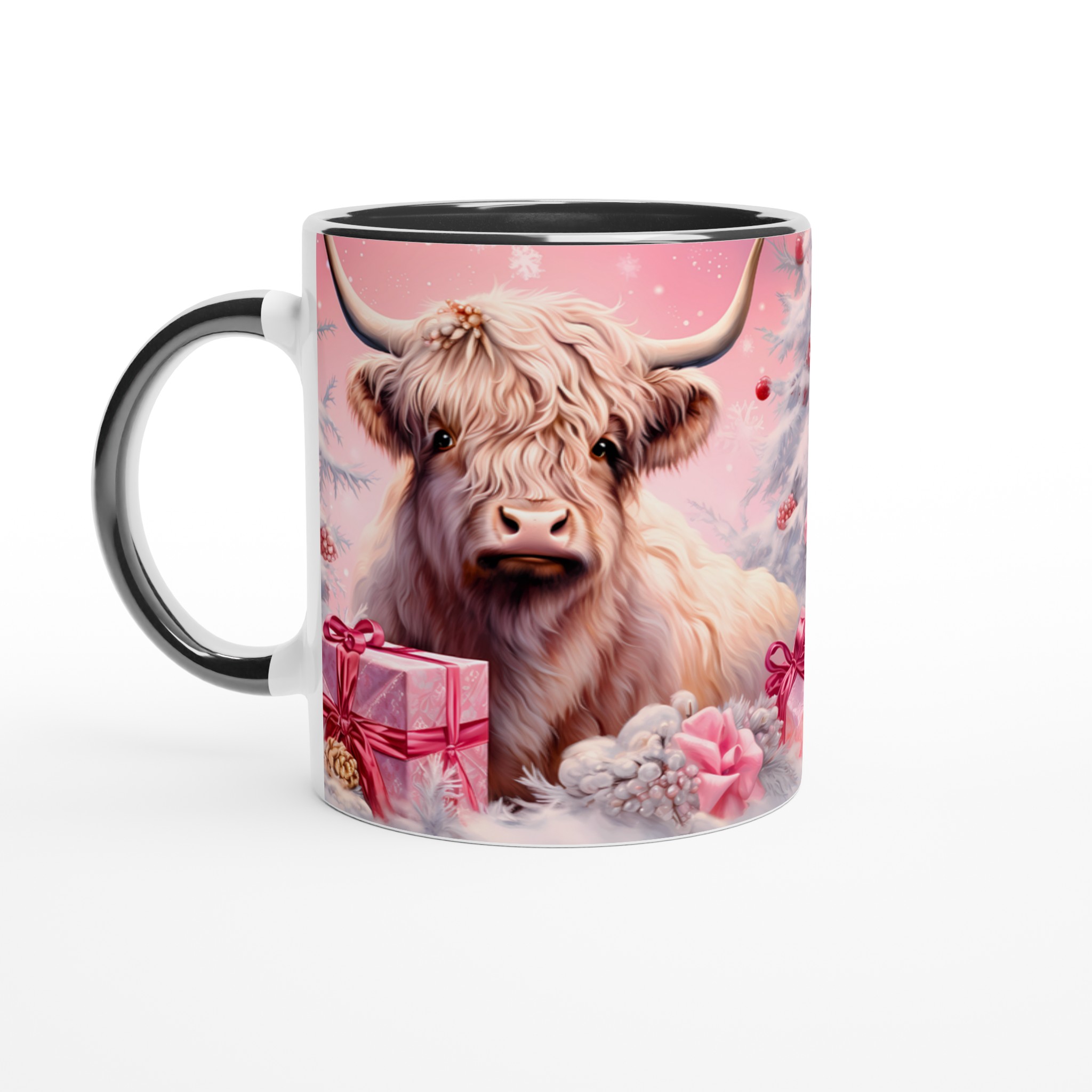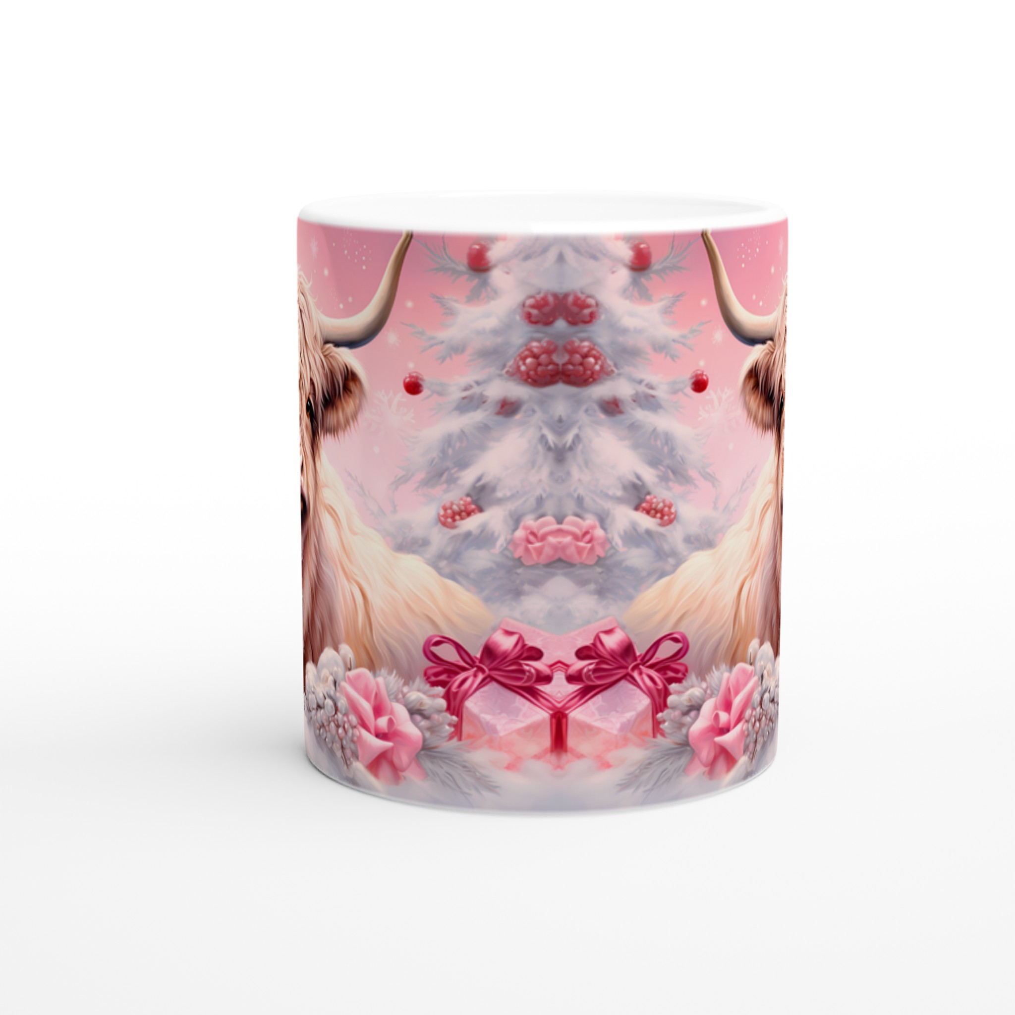 Fånga den mest hjärtevärmande känslan av jul med vår ”Mjuk Julglädje” keramiska mugg. En bedårande, ullig Highland Cattle-ko pryder denna mugg, omgiven av vinterlika rosa och vita dekorationer, inslagna presenter och snöflingor. Denna bild framkallar en känsla av lugn, glädje och den mysiga atmosfären av en julafton, perfekt för alla som älskar djur och den magiska högtiden.