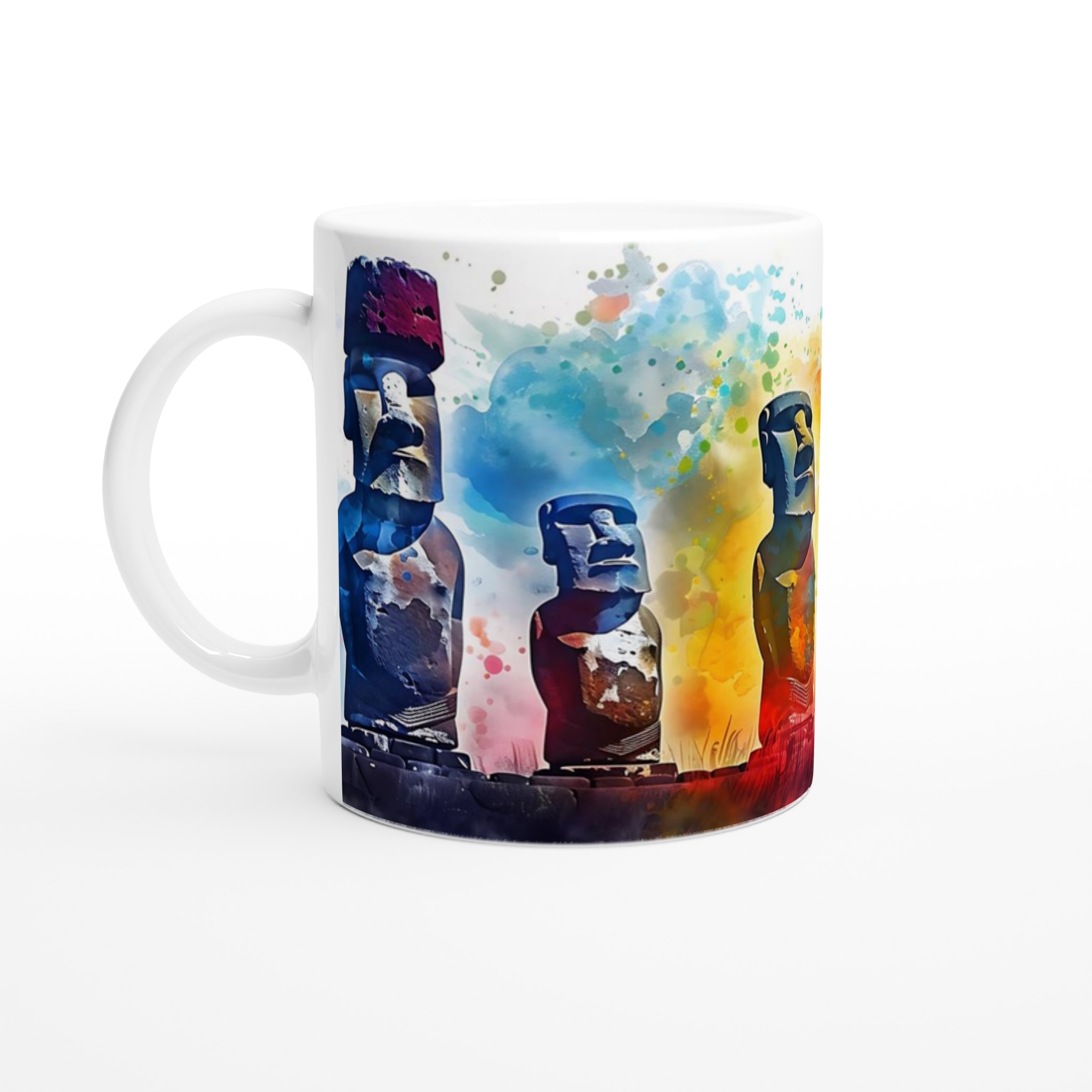 Denna unika mugg fångar den mystiska skönheten hos Moai-statyerna, omgiven av en explosion av akvarellfärger som spänner från djupblått till eldiga röda och soliga gula toner. Den blanka vita ytan ger ett skarpt och levande tryck som verkligen sticker ut, oavsett om det är en personlig design, ett roligt citat eller en present till någon du tycker om.