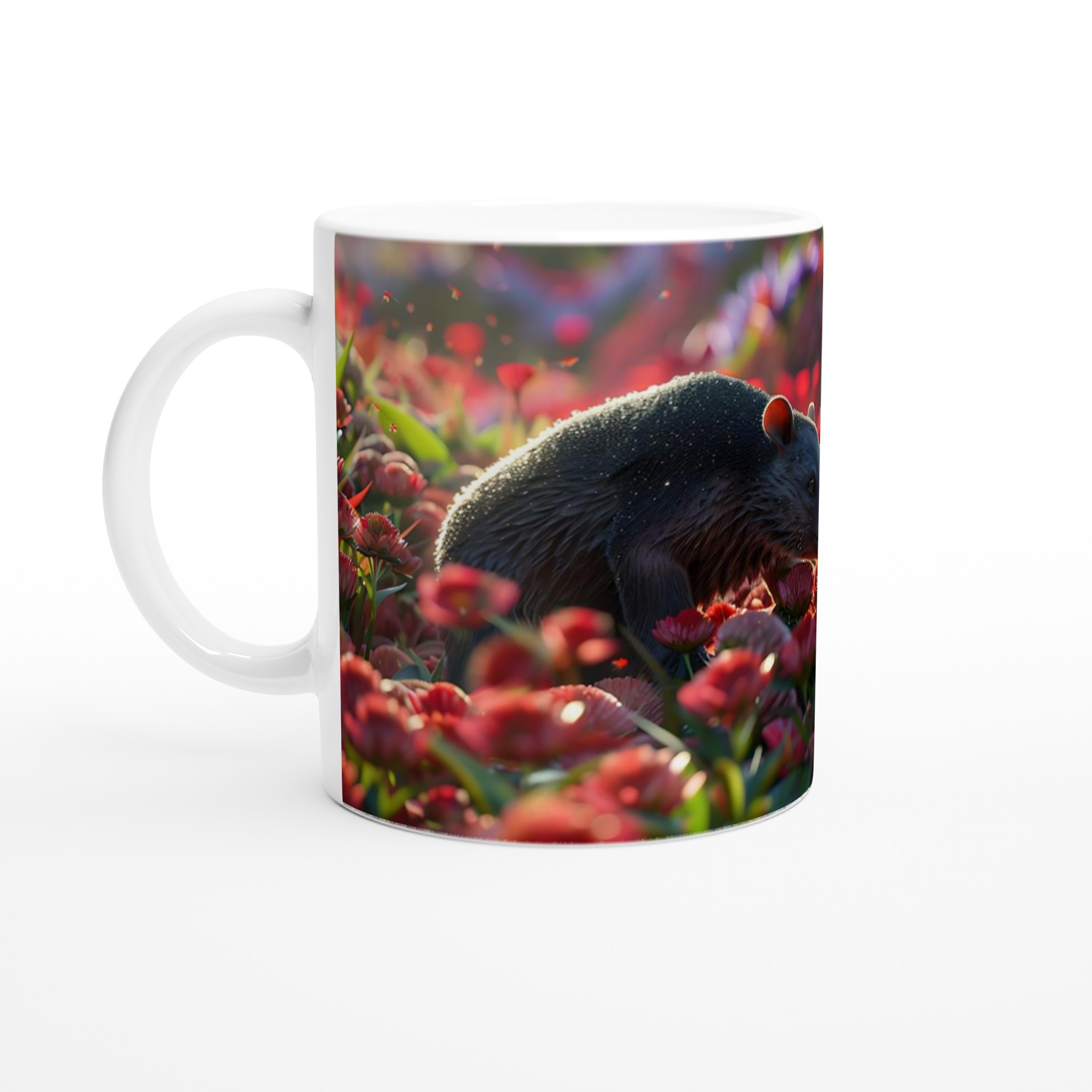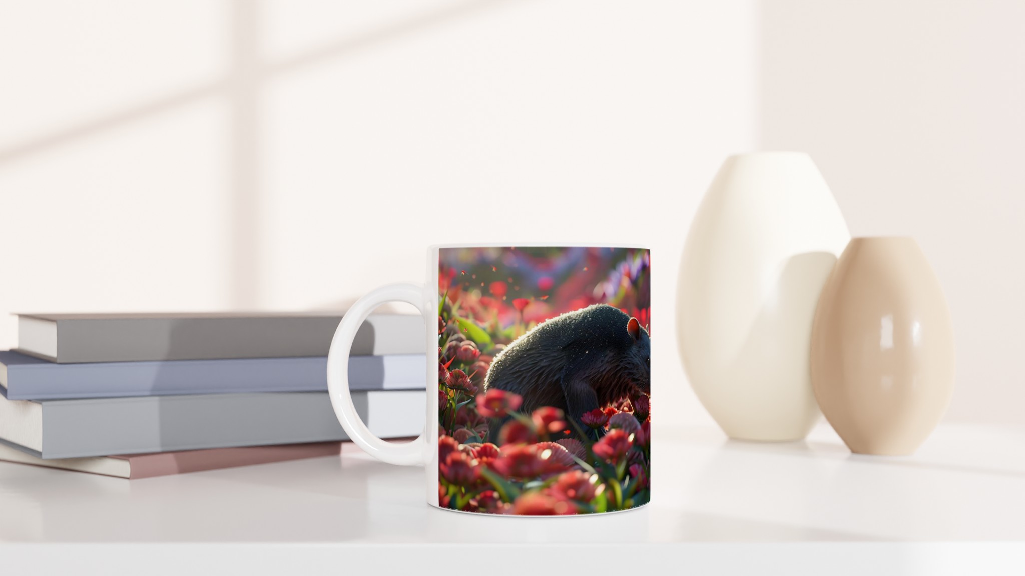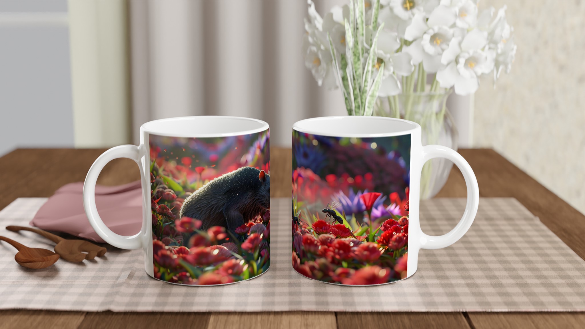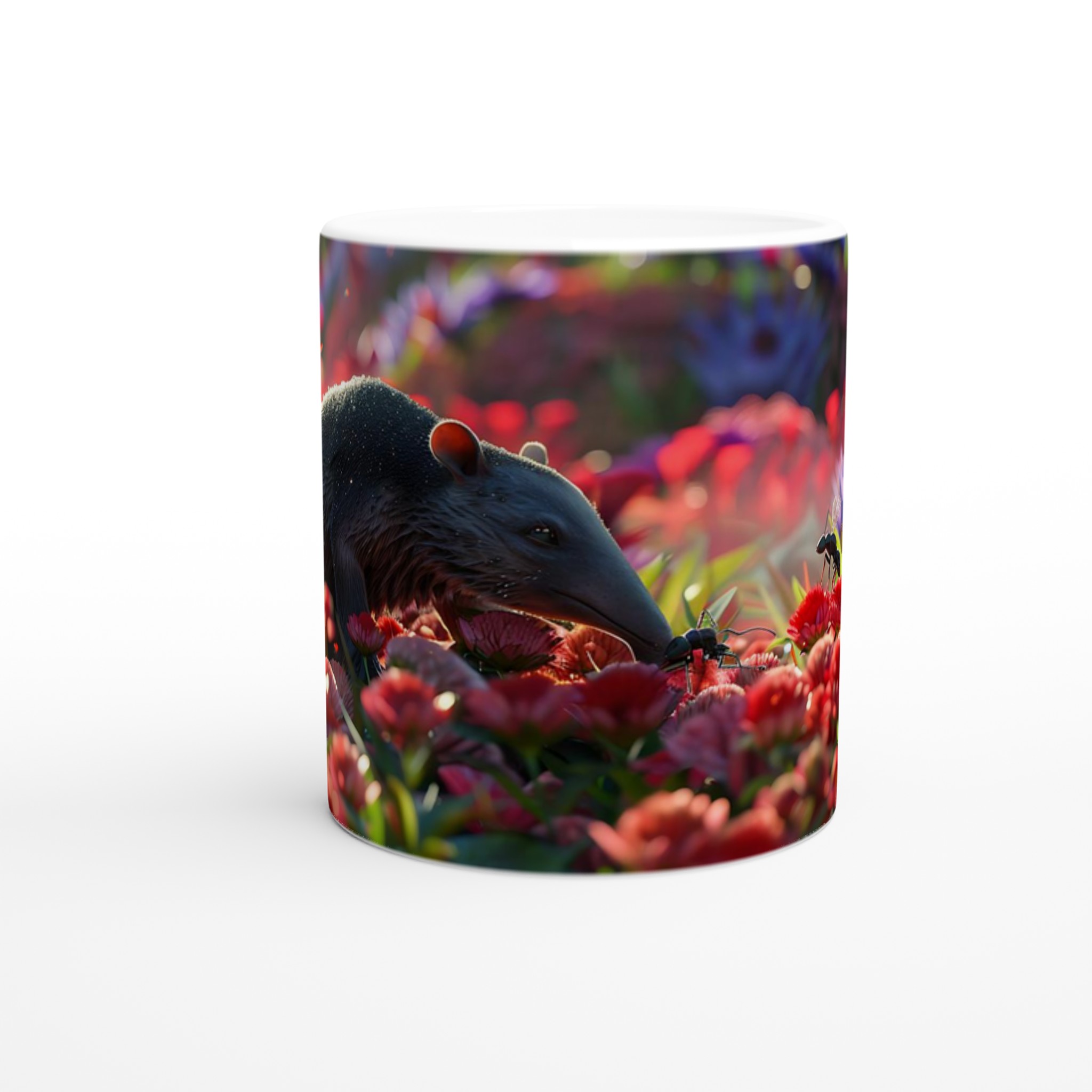 Föreställ dig en lugn morgon, när daggen glimmar och naturen vaknar till liv. Vår ”Morgondagg” keramikmugg fångar den känslan med sitt levande och drömska motiv av en liten tapir bland daggfriska blommor, insekter och en blommande äng i fantastiska, dämpade färger. Den här stilrena keramiska muggen blir snabbt en vardagsfavorit. Perfekt för morgonkaffet, kvällens varma choklad eller när du bara vill njuta av en kopp te. Den blanka ytan framhäver trycken med klara och levande färger, som håller sig fina även efter många turer i mikron och diskmaskinen.