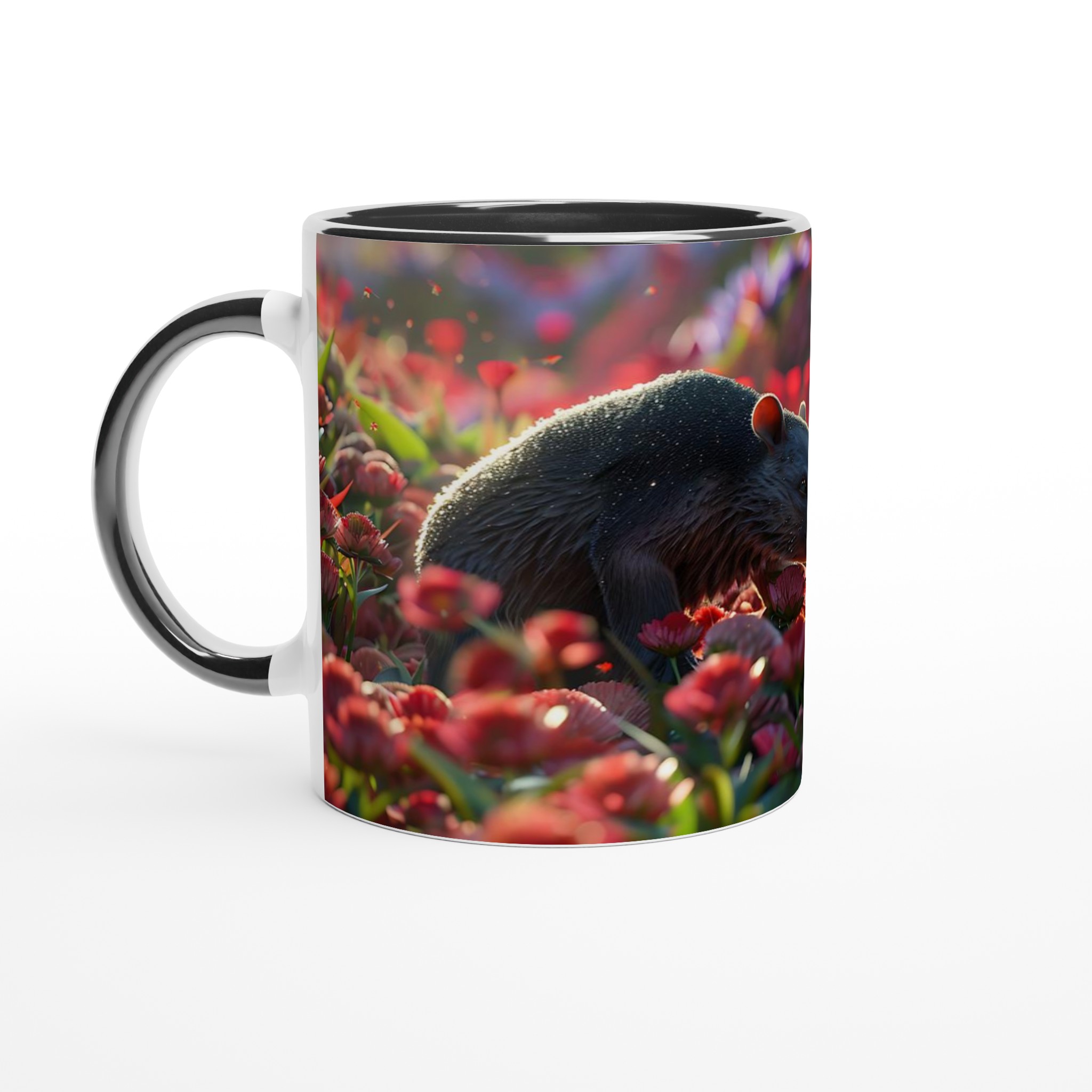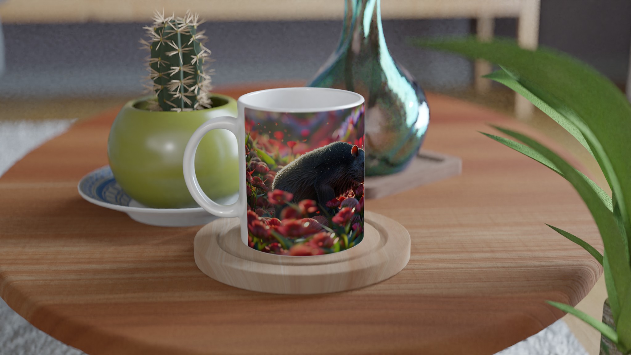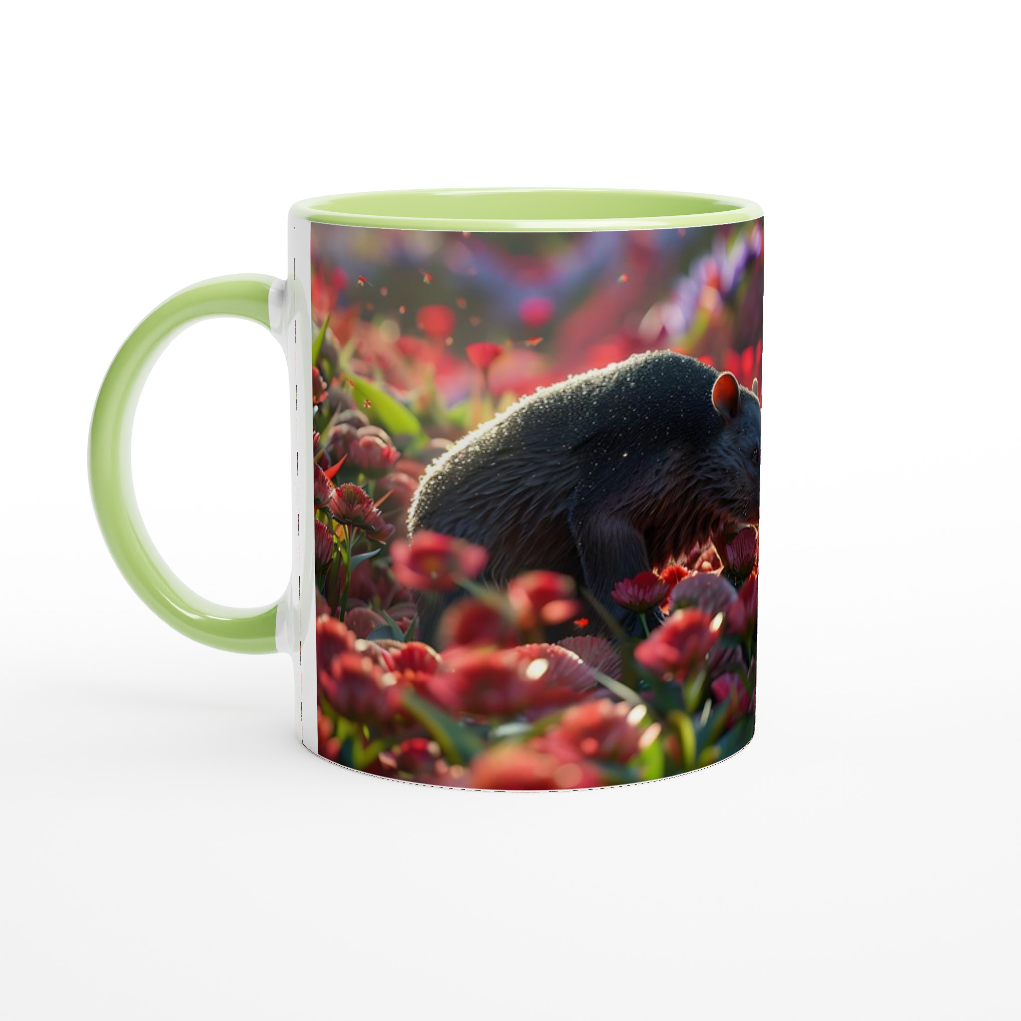 Föreställ dig en lugn morgon, när daggen glimmar och naturen vaknar till liv. Vår ”Morgondagg” keramikmugg fångar den känslan med sitt levande och drömska motiv av en liten tapir bland daggfriska blommor, insekter och en blommande äng i fantastiska, dämpade färger. Den här stilrena keramiska muggen blir snabbt en vardagsfavorit. Perfekt för morgonkaffet, kvällens varma choklad eller när du bara vill njuta av en kopp te. Den blanka ytan framhäver trycken med klara och levande färger, som håller sig fina även efter många turer i mikron och diskmaskinen.