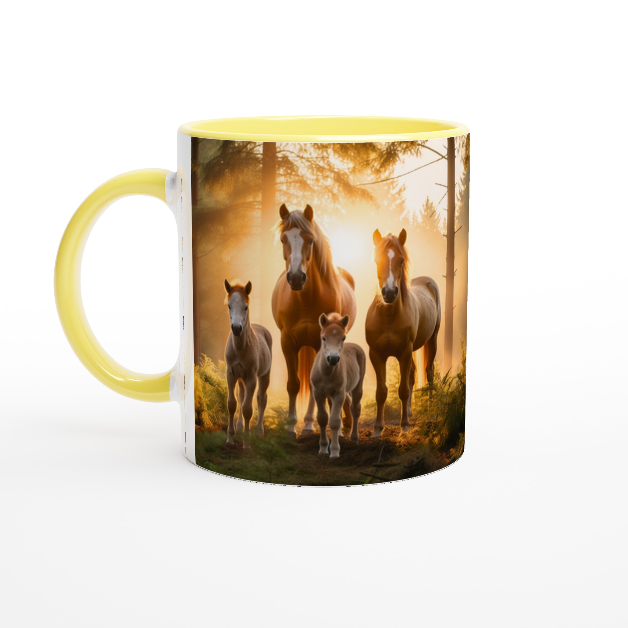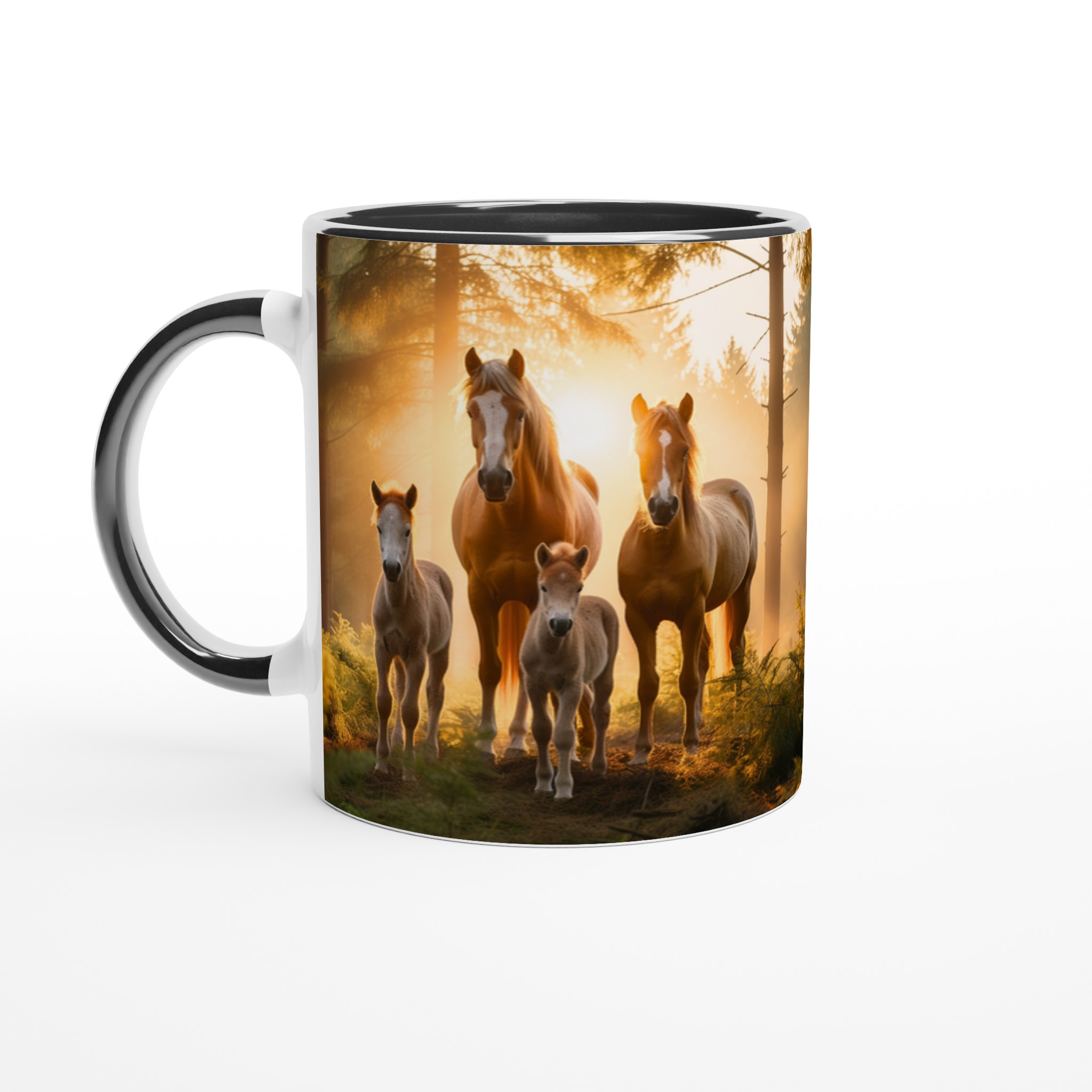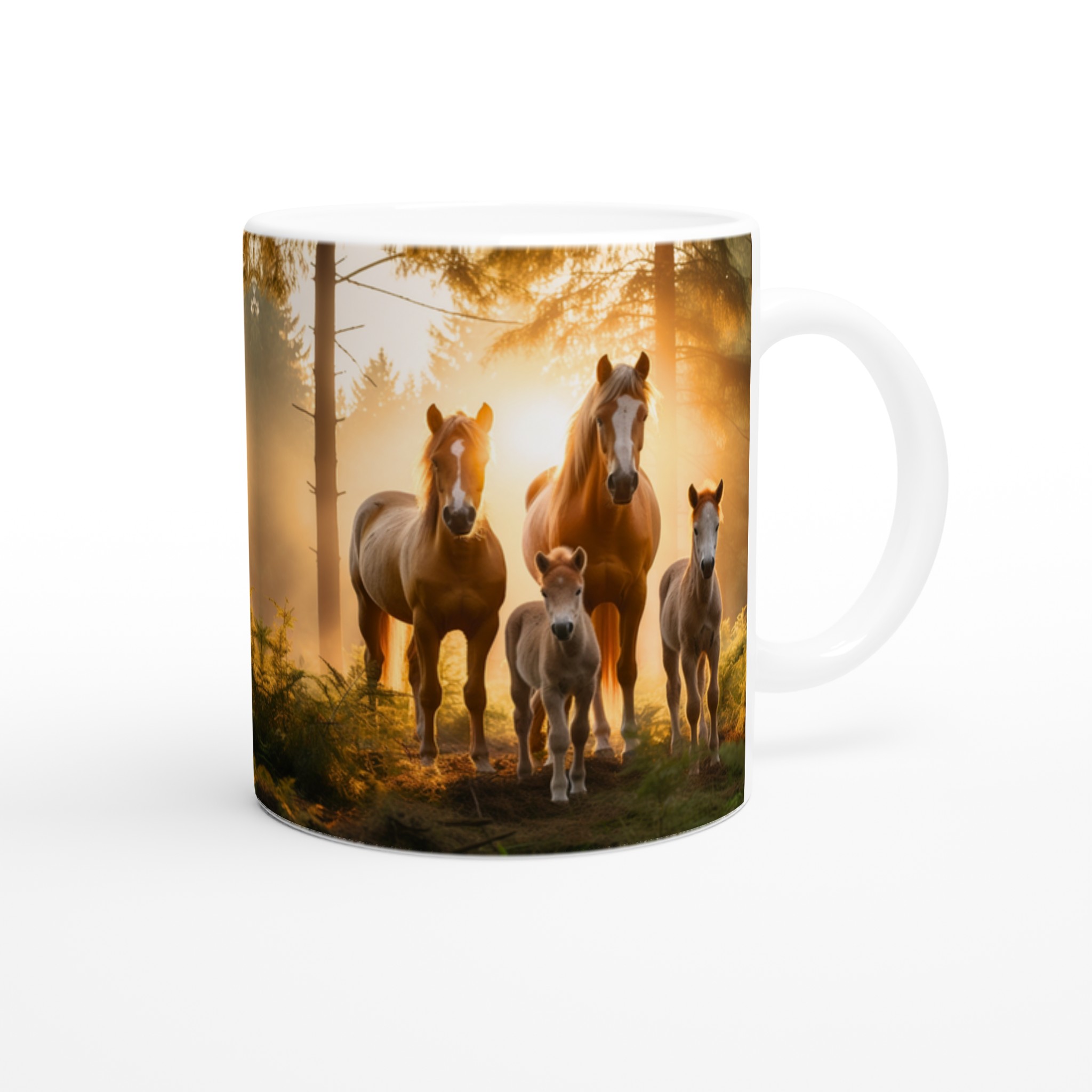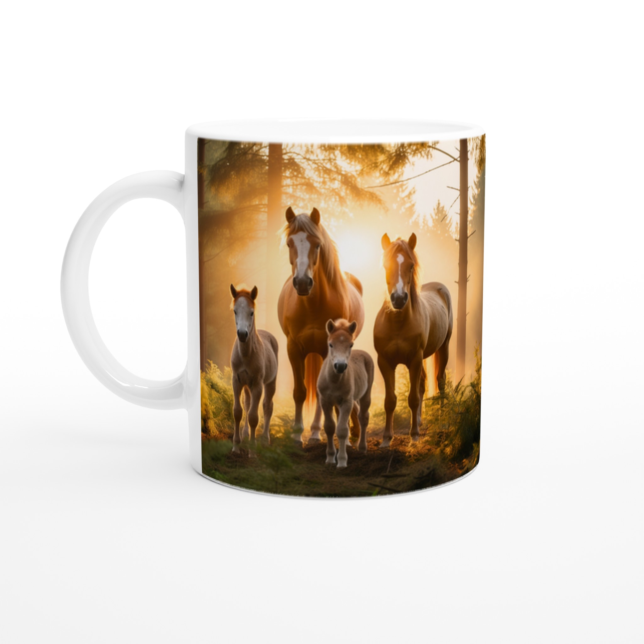Föreställ dig att vakna till en disig morgon, där solens första strålar bryter igenom skogen och möter en majestätisk hästfamilj. Den här stilrena keramiska muggen fångar den magiska känslan av en fridfull soluppgång, med en scen som inspirerar till lugn och styrka varje gång du tar en klunk.