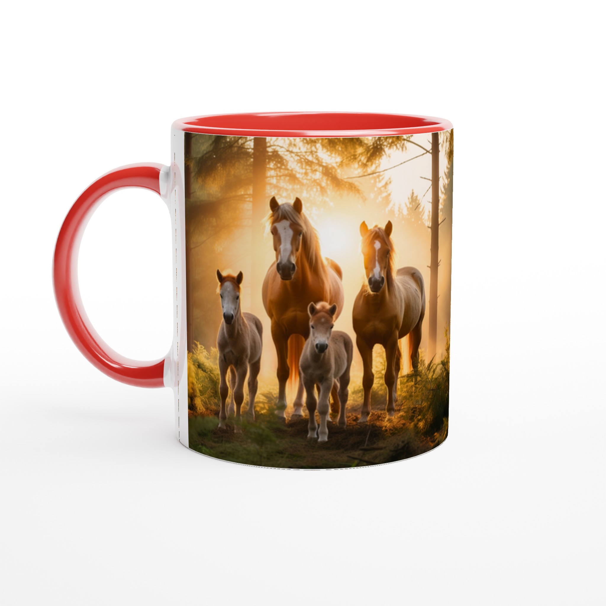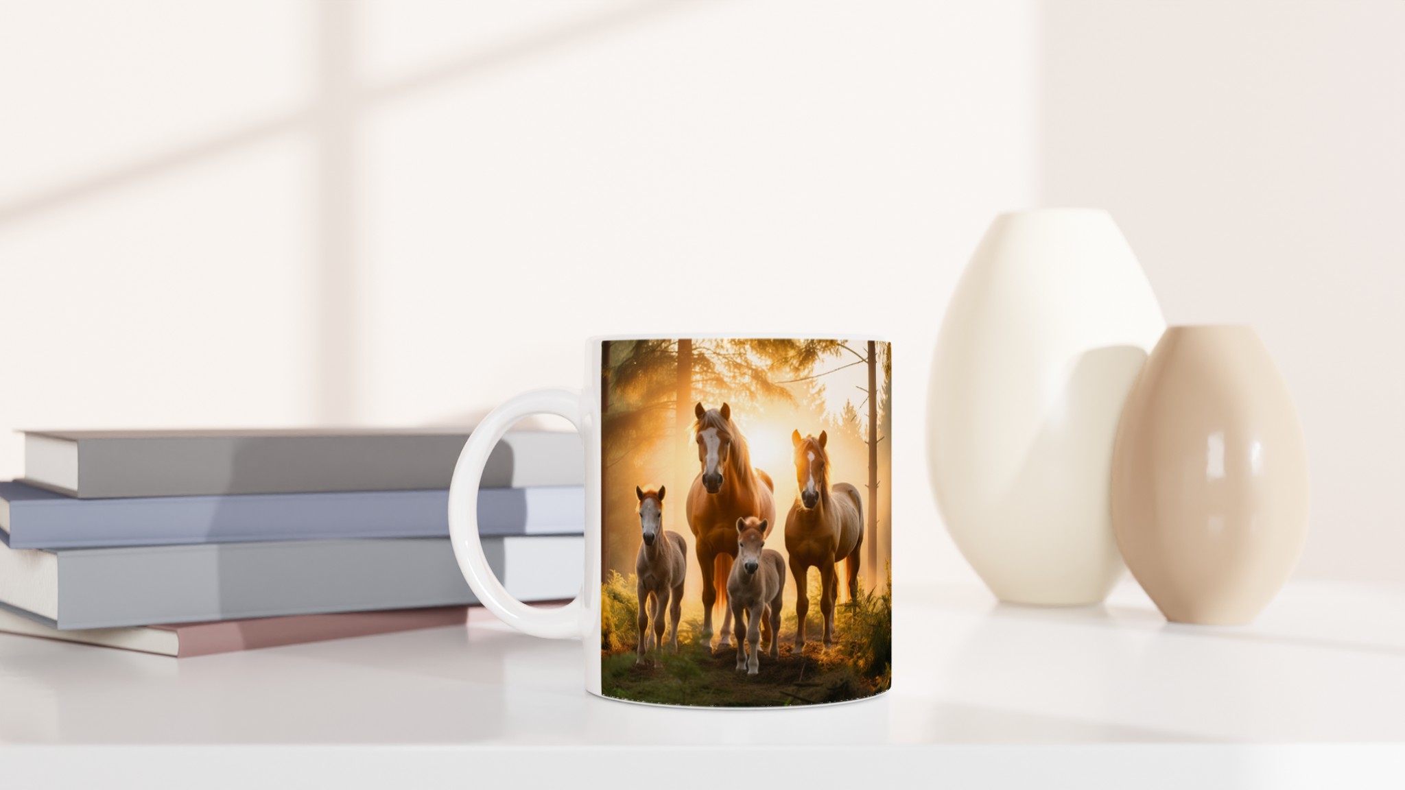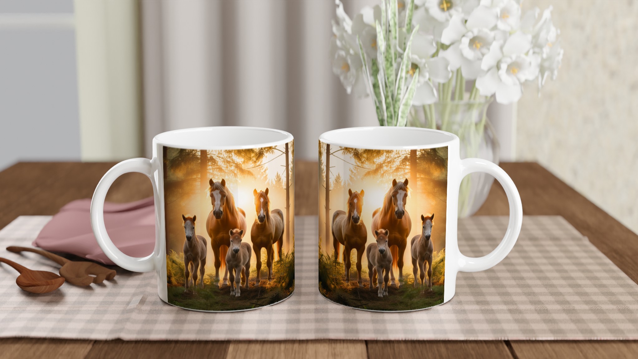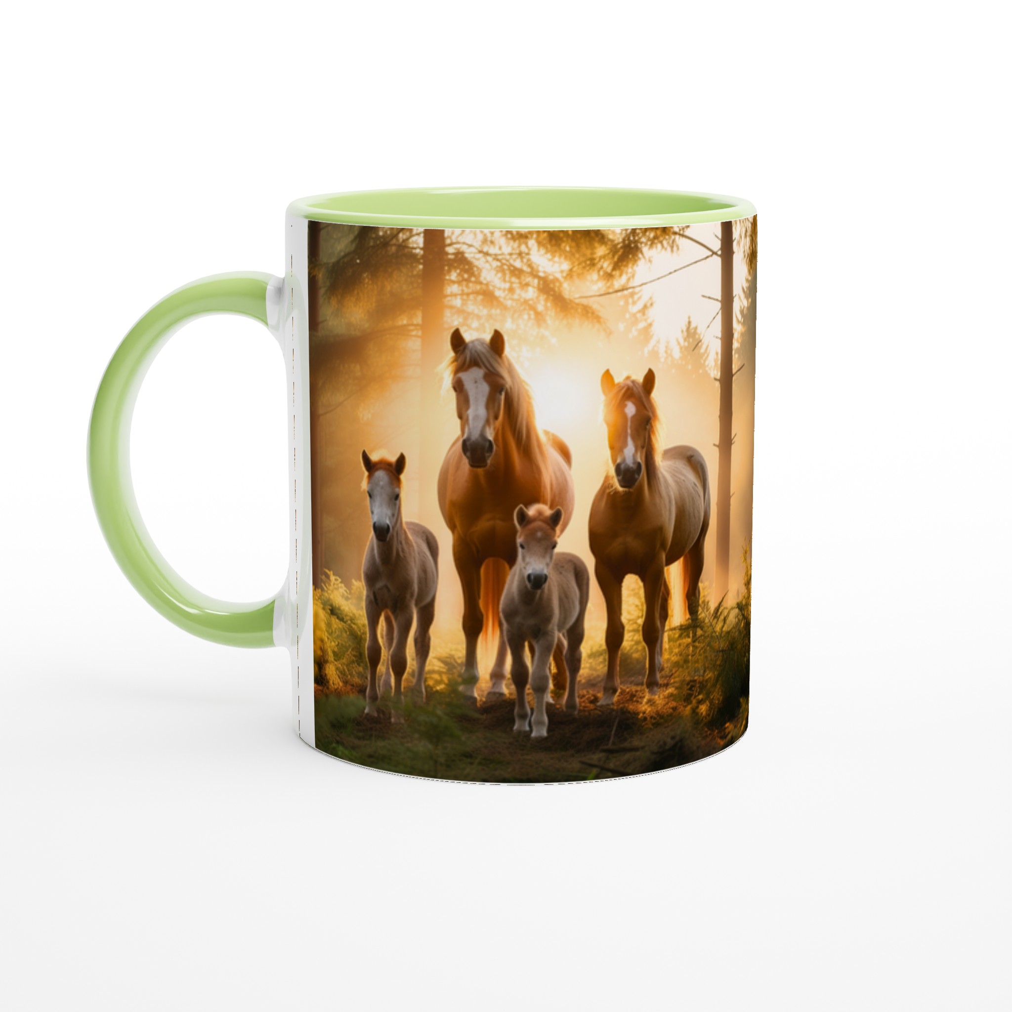 Föreställ dig att vakna till en disig morgon, där solens första strålar bryter igenom skogen och möter en majestätisk hästfamilj. Den här stilrena keramiska muggen fångar den magiska känslan av en fridfull soluppgång, med en scen som inspirerar till lugn och styrka varje gång du tar en klunk.