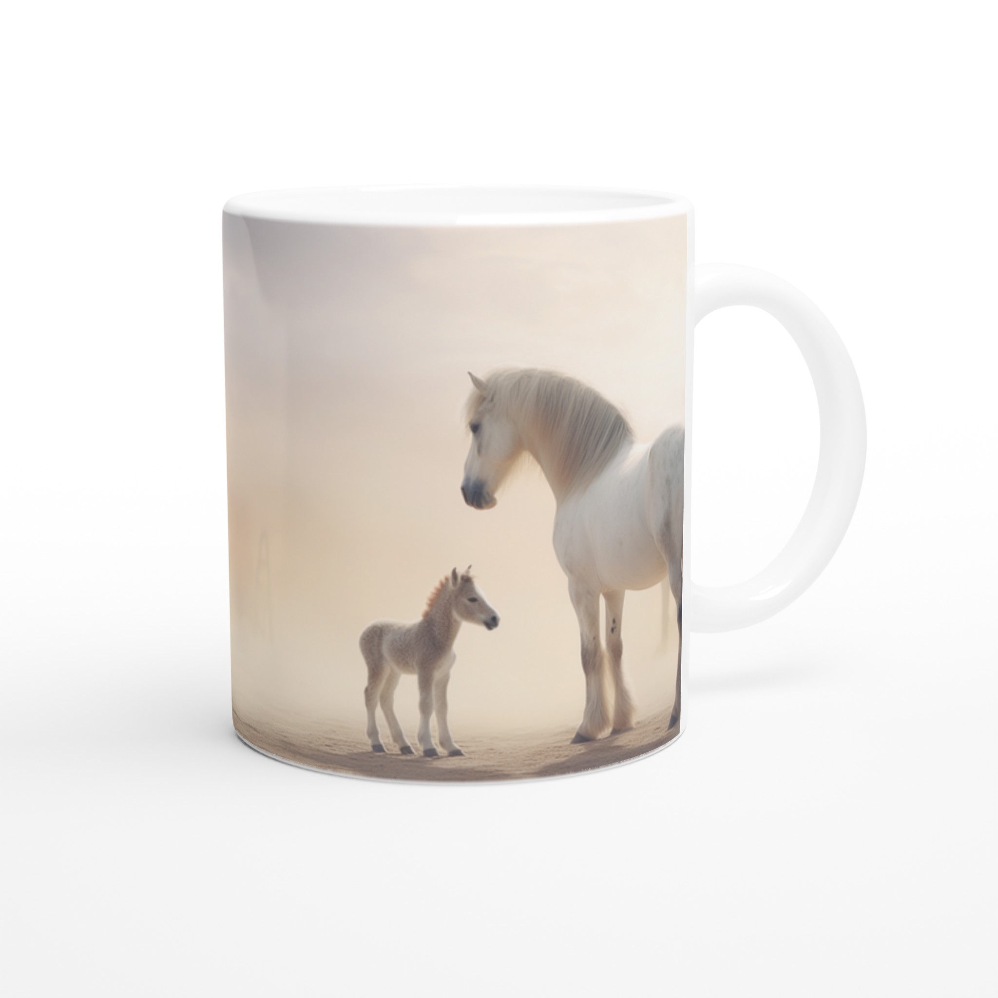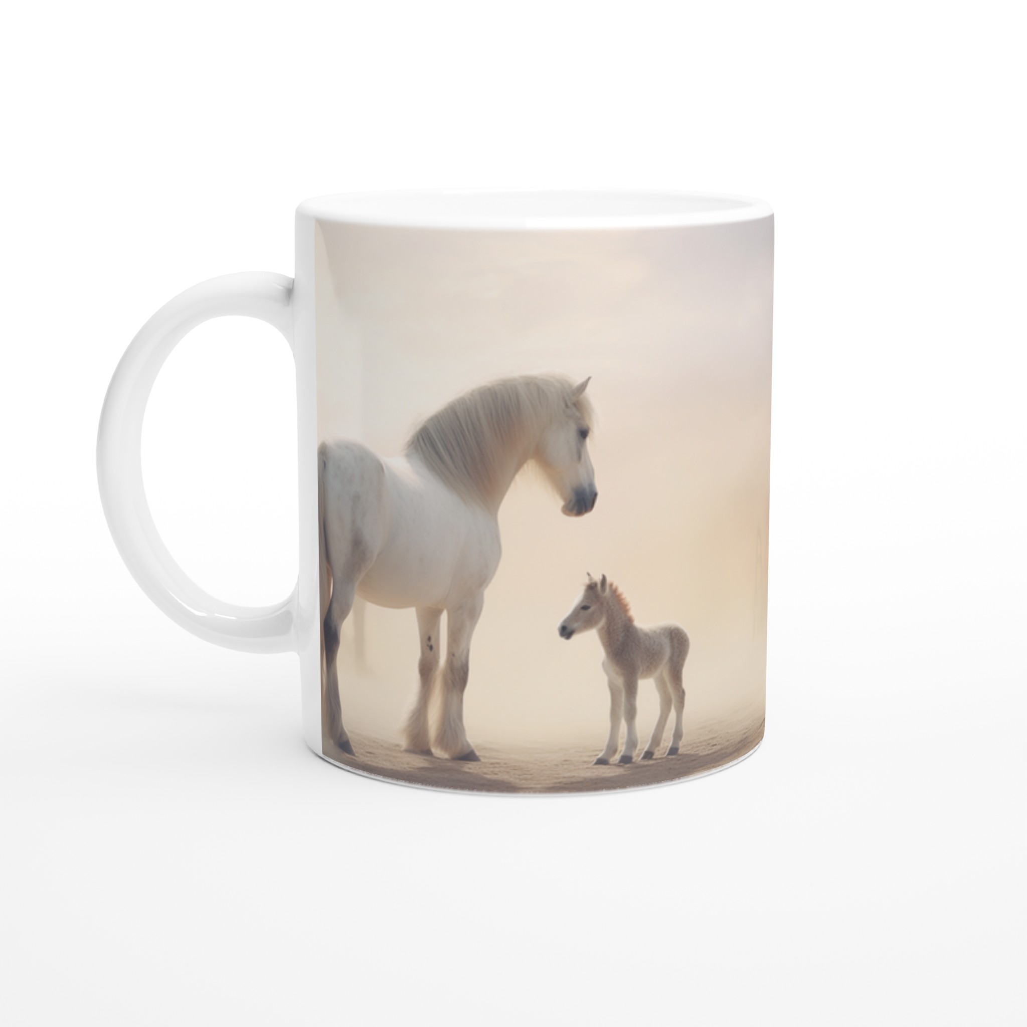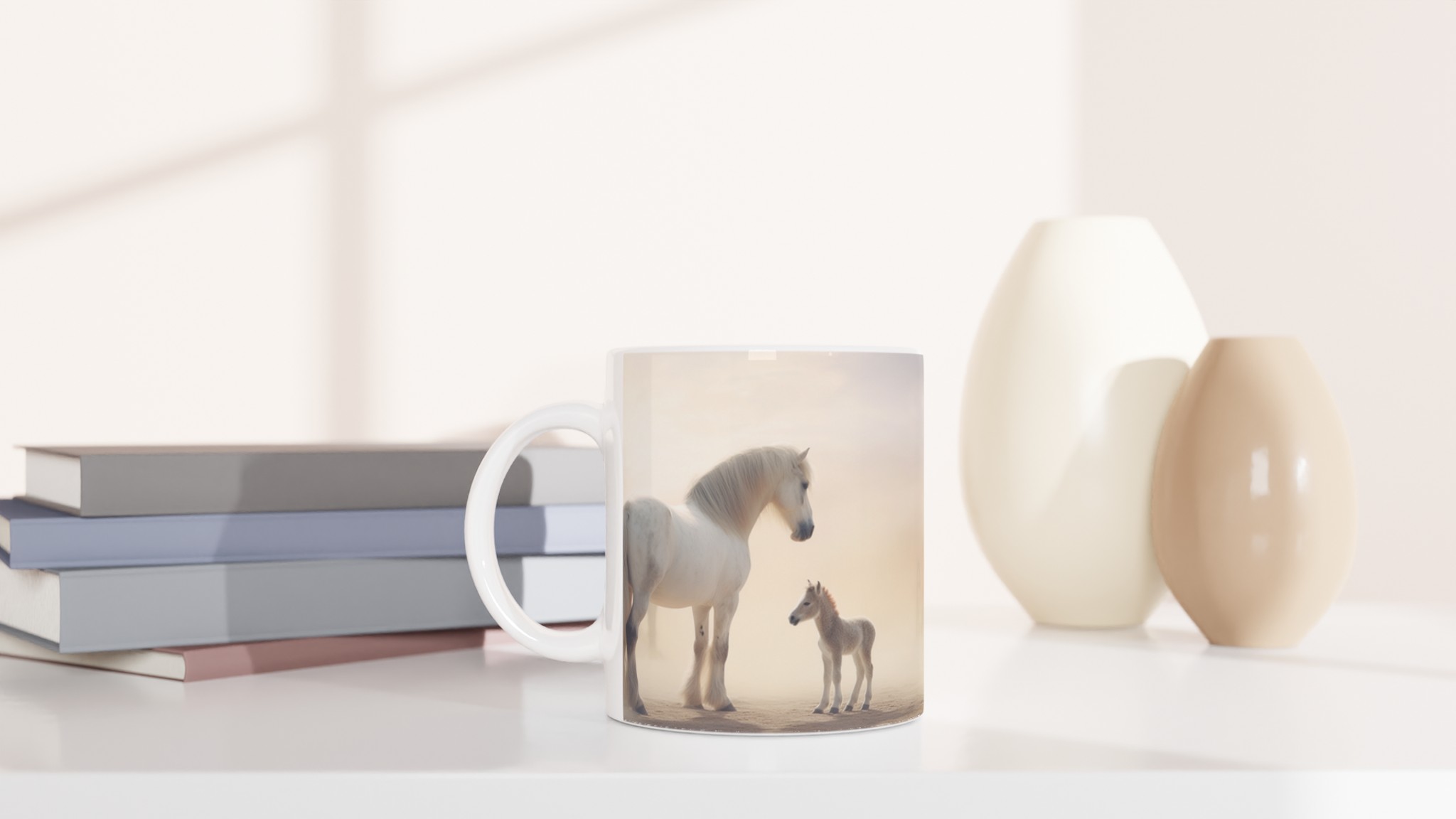 Fånga den lugna skönheten från morgonljuset med denna keramiska mugg, prydd med ett förtrollande motiv av en majestätisk vit häst och dess bedårande föl. Den mjuka, drömska atmosfären och de varma, jordnära tonerna skapar en känsla av ro och harmoni – perfekt för att starta dagen med.