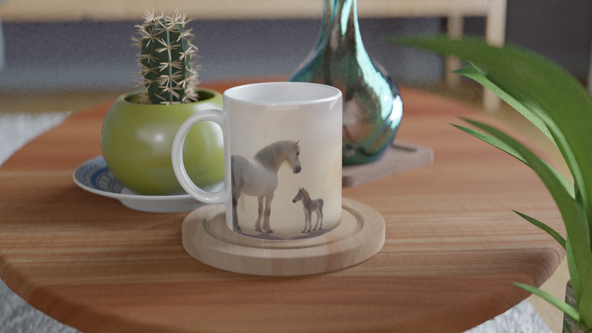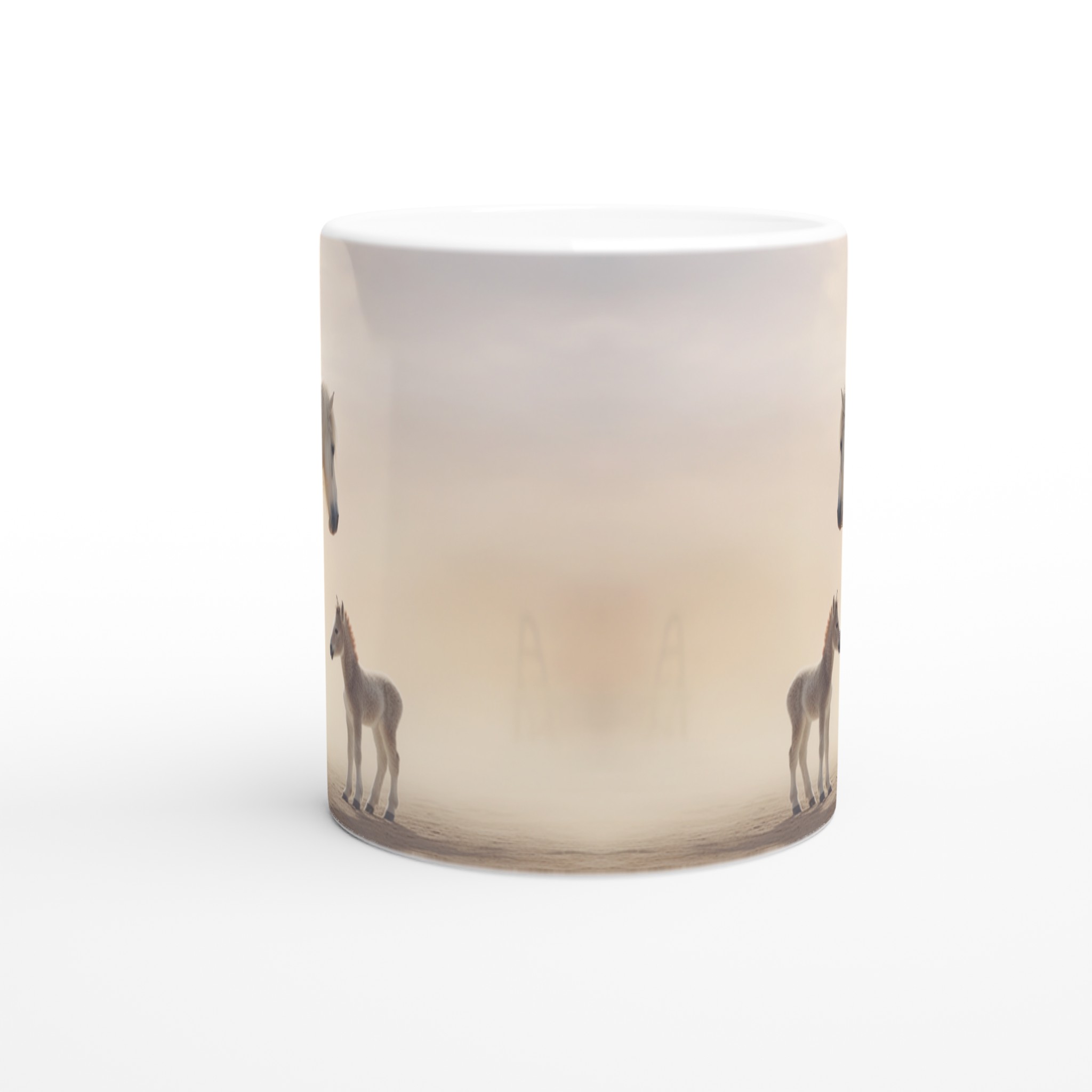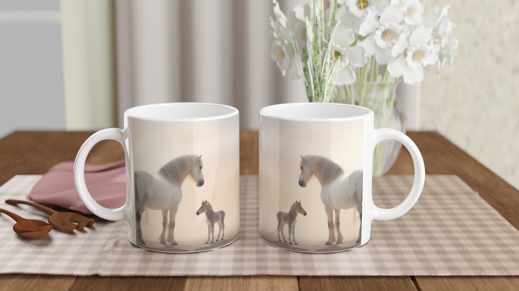 Fånga den lugna skönheten från morgonljuset med denna keramiska mugg, prydd med ett förtrollande motiv av en majestätisk vit häst och dess bedårande föl. Den mjuka, drömska atmosfären och de varma, jordnära tonerna skapar en känsla av ro och harmoni – perfekt för att starta dagen med.