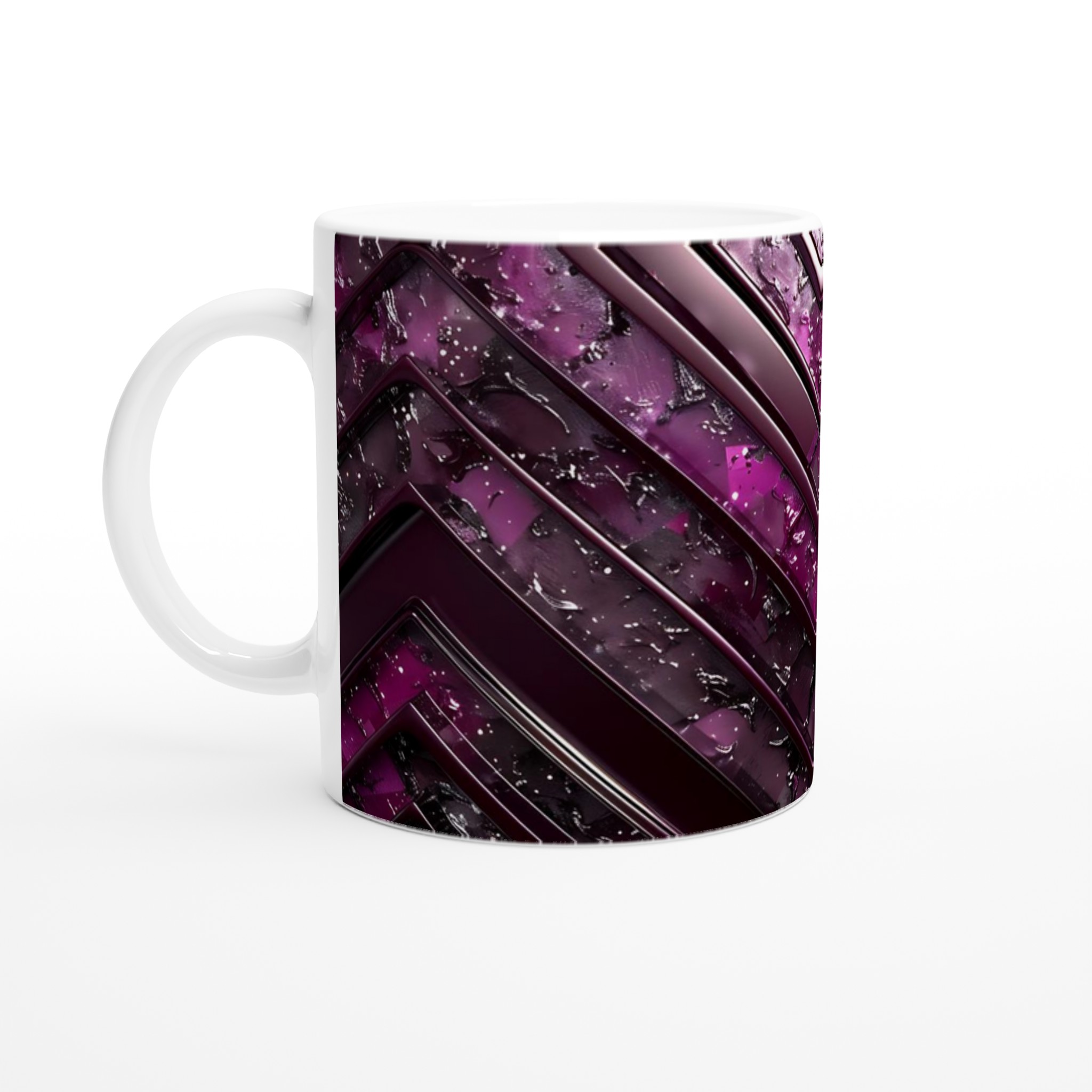 Denna förtrollande mörklila mugg med sitt abstrakta och glittriga mönster fångar ögat och bjuder in till en stund av reflektion. Det unika trycket, inspirerat av kosmiska nyanser och skimmer, ger varje fika en känsla av lyx och mystik. Den blanka vita ytan ger ett skarpt och levande tryck som verkligen sticker ut, oavsett om det är en personlig design, ett roligt citat eller en present till någon du tycker om.