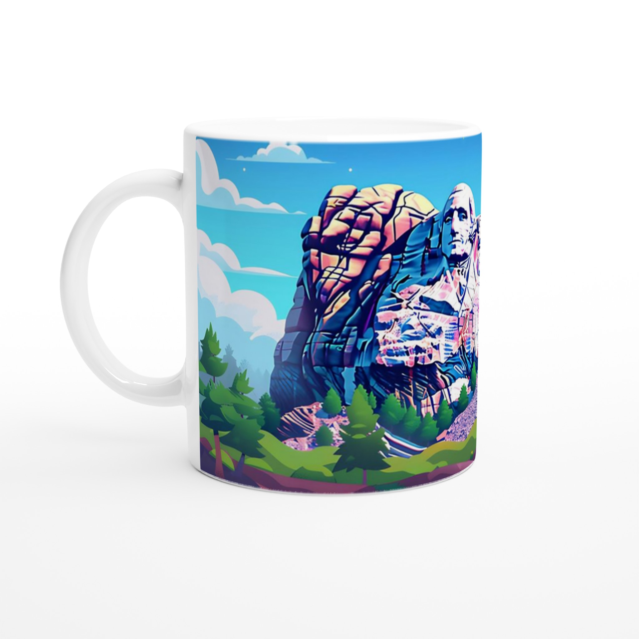 Inspirerad av den ikoniska Mount Rushmore i en dynamisk popkonststil, fångar denna mugg blicken med sina livfulla blå, rosa och gröna toner. Den blanka vita ytan ger ett skarpt och levande tryck som verkligen sticker ut, oavsett om det är en personlig design, ett roligt citat eller en present till någon du tycker om.