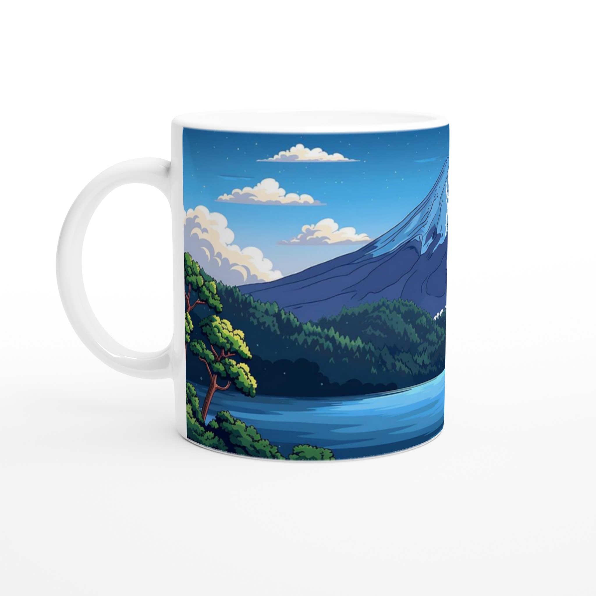 Lyft varje kaffestund med vår premium keramikmugg – stilren, hållbar och skapad för att låta ditt motiv glänsa. Denna mugg fångar den lugna skönheten hos det ikoniska berget Fuji, med dess snöklädda topp, frodiga skogar och en stilla sjö under en stjärnklar himmel. Den livfulla, drömlika illustrationen i klara blå och gröna toner bjuder in till ett ögonblick av frid vid varje användning.