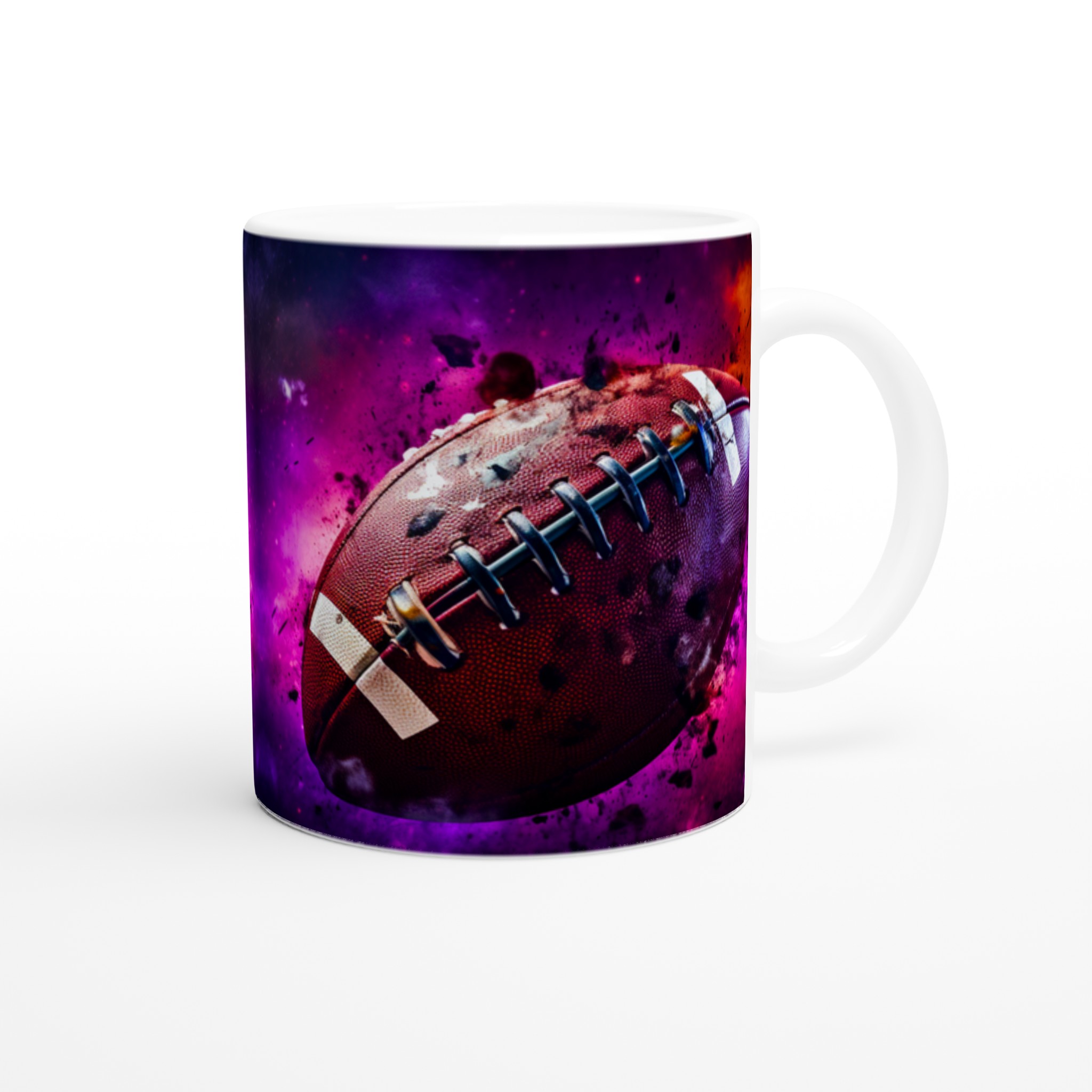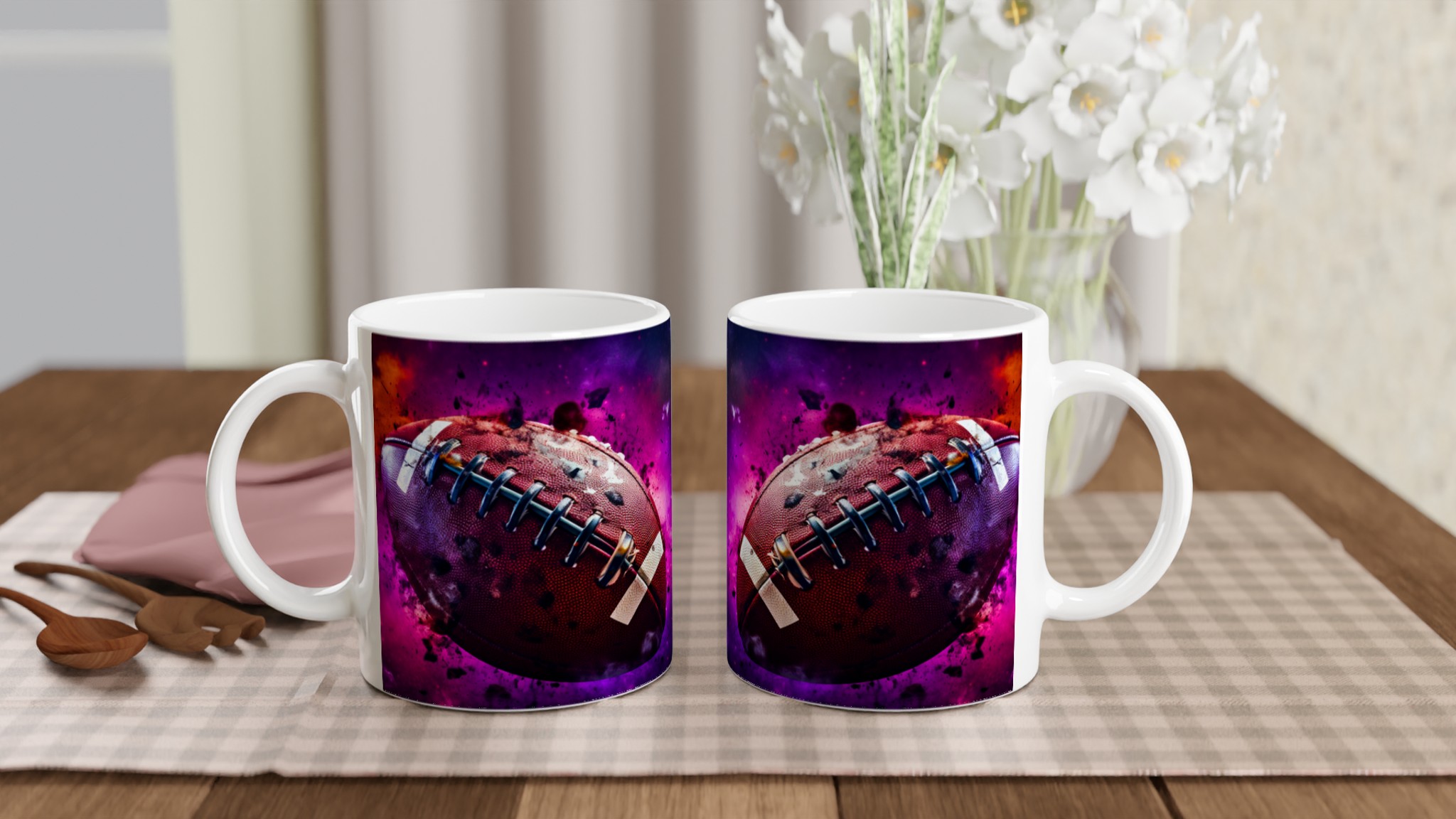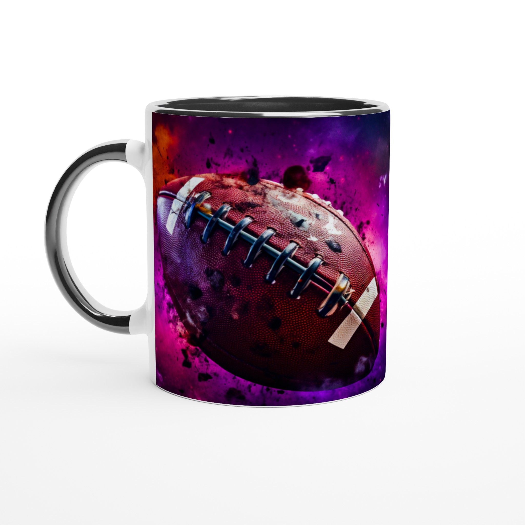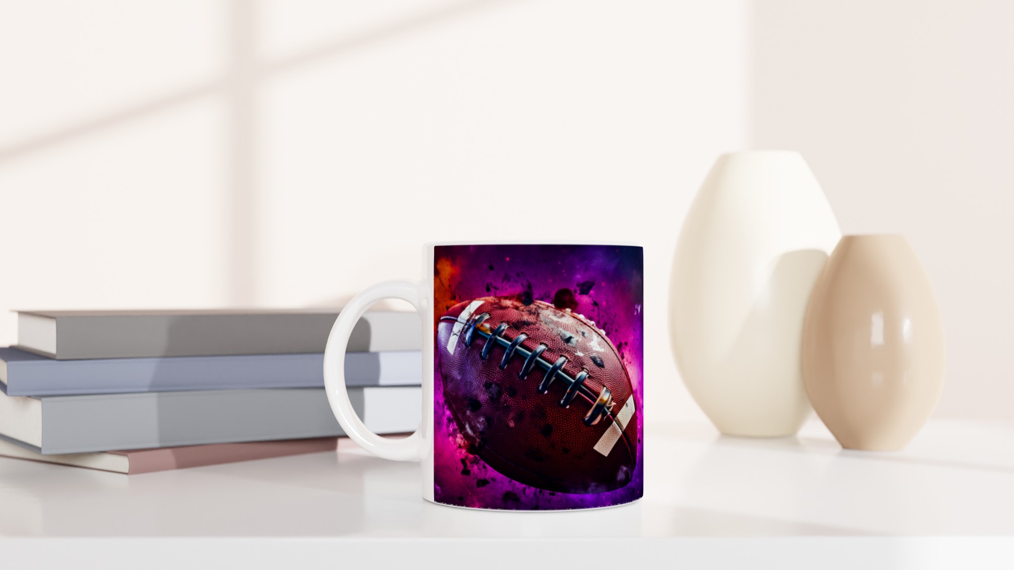 Lyft din spelkväll eller morgonrutin med vår dynamiska ”Game On” keramiska mugg. Dess design fångar energin från sportens värld med en suggestiv bakgrund av djuplila och rökiga toner, som framhäver det klassiska trycket av en amerikansk fotboll. Den här muggen blir snabbt en vardagsfavorit, perfekt för morgonkaffet, kvällens varma choklad eller när du bara vill njuta av en kopp te.