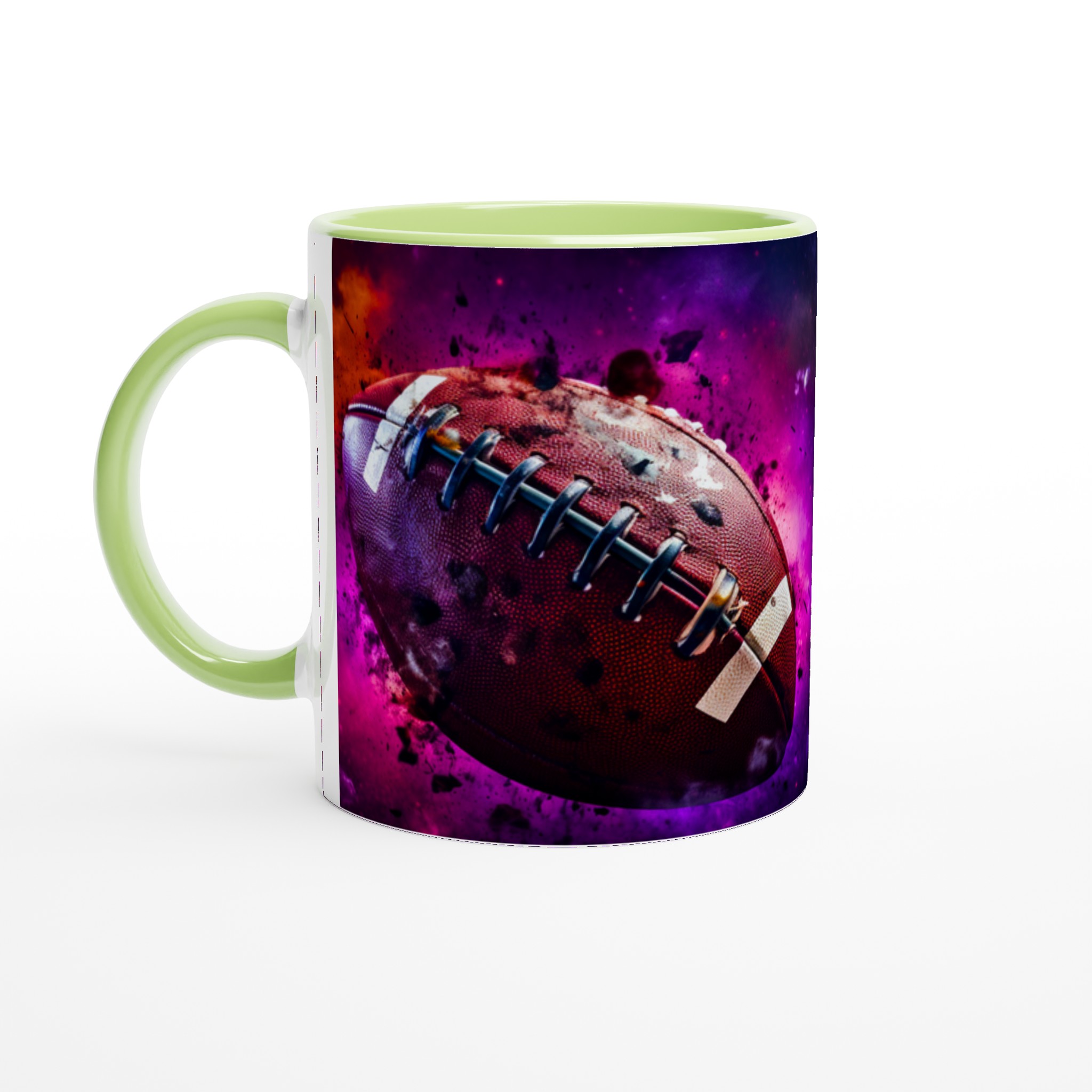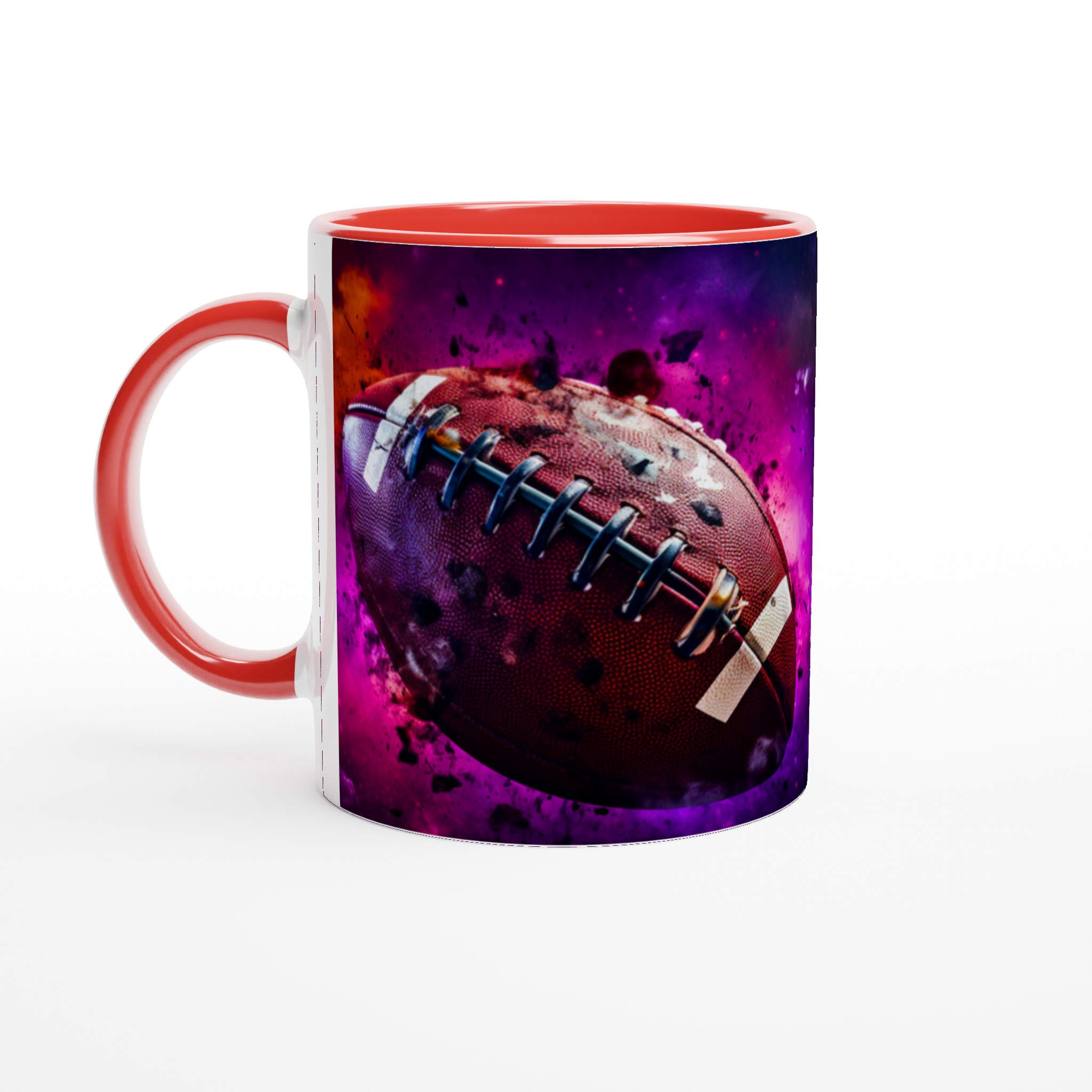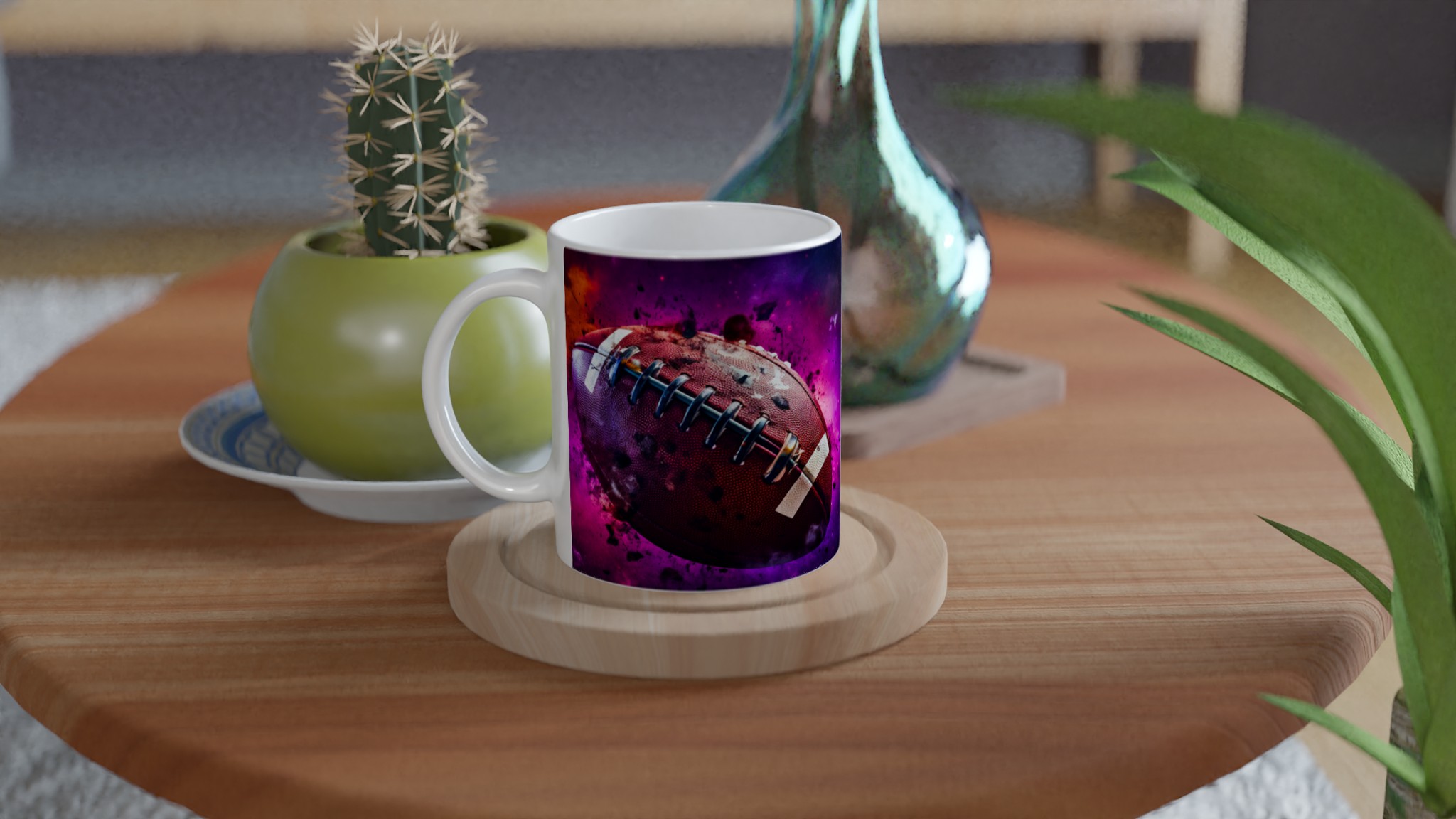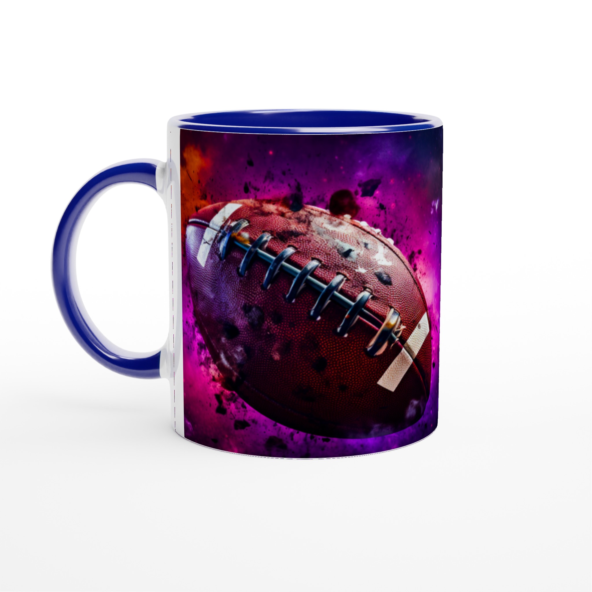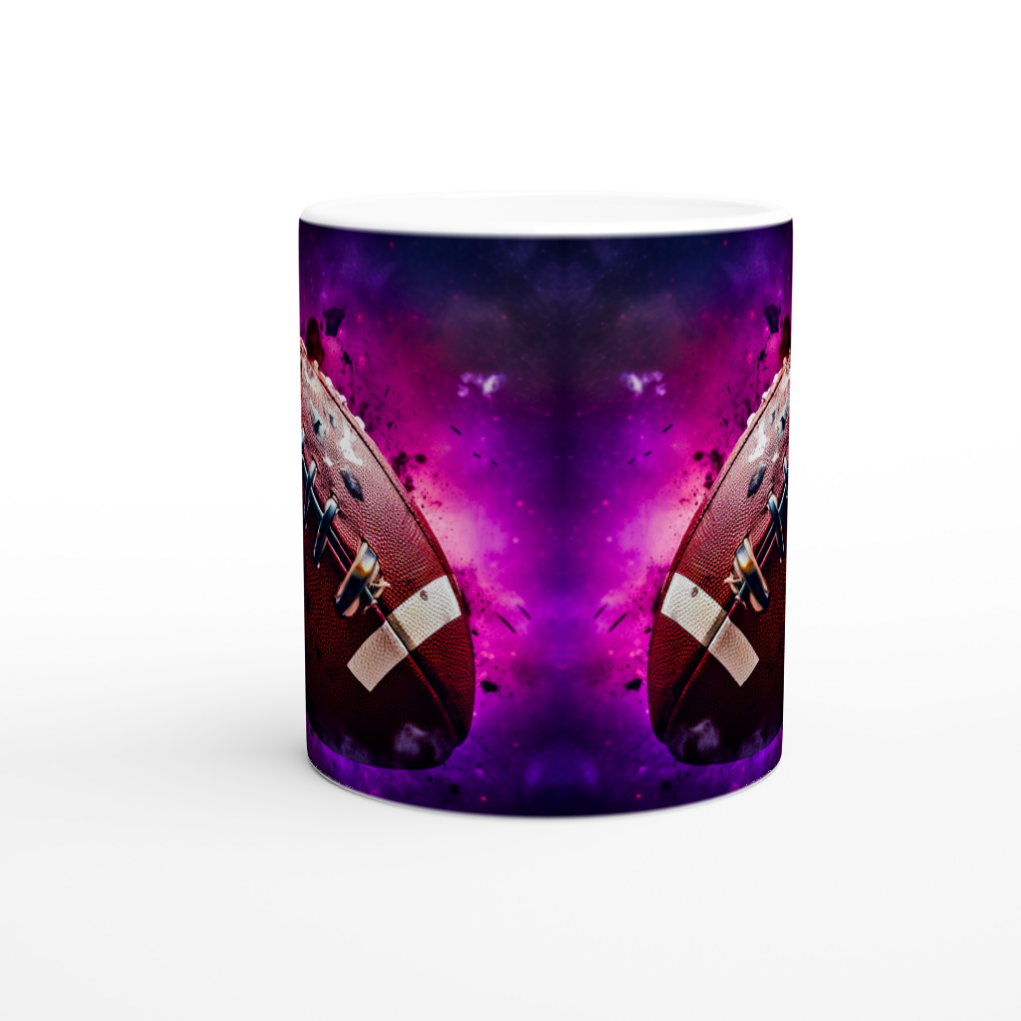 Lyft din spelkväll eller morgonrutin med vår dynamiska ”Game On” keramiska mugg. Dess design fångar energin från sportens värld med en suggestiv bakgrund av djuplila och rökiga toner, som framhäver det klassiska trycket av en amerikansk fotboll. Den här muggen blir snabbt en vardagsfavorit, perfekt för morgonkaffet, kvällens varma choklad eller när du bara vill njuta av en kopp te.