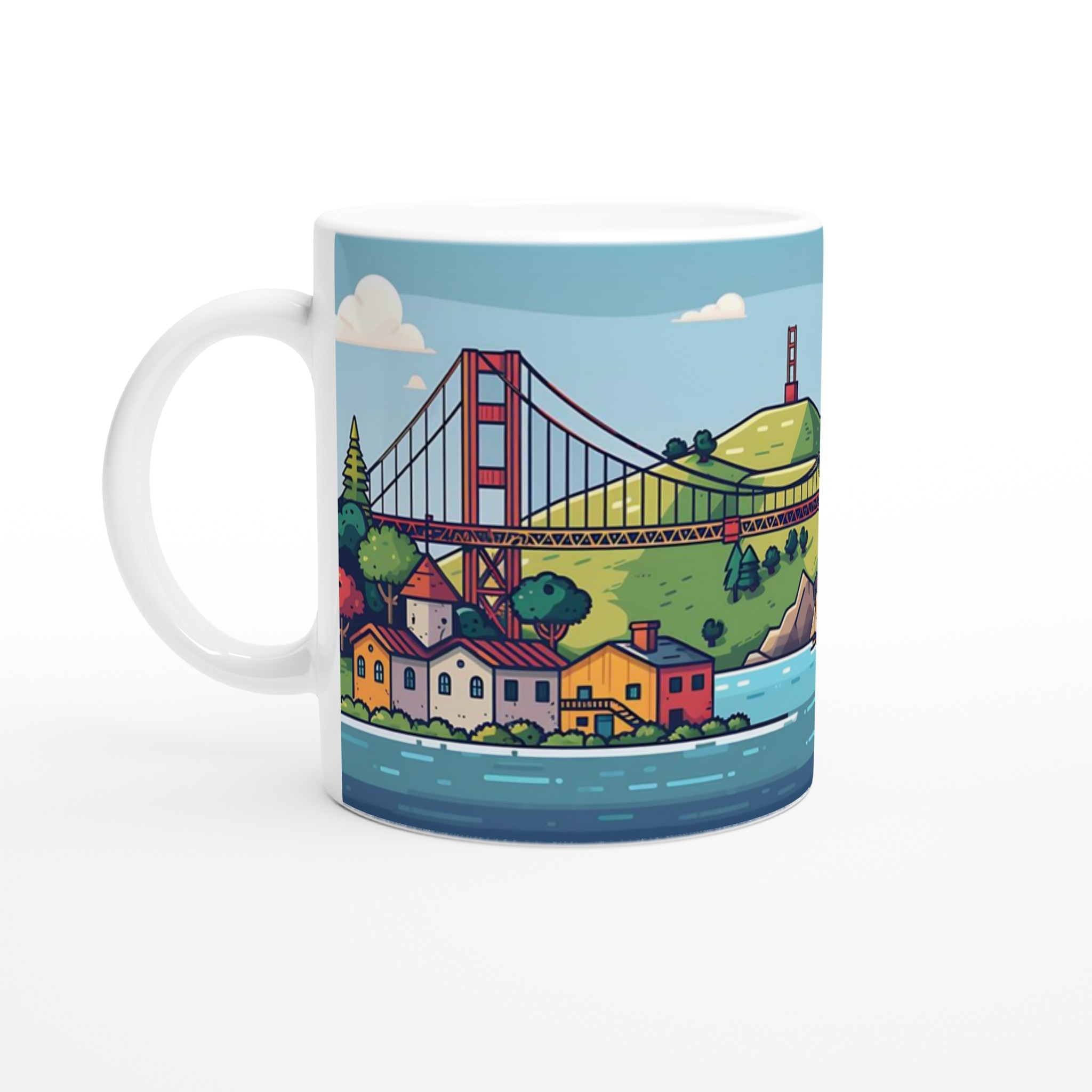 Inspirerad av den ikoniska Golden Gate-bron, fångar denna mugg den livliga charmen av San Francisco i en färgstark, handritad stil. Den blanka vita ytan ger ett skarpt och levande tryck som verkligen sticker ut, oavsett om det är en personlig design, ett roligt citat eller en present till någon du tycker om.