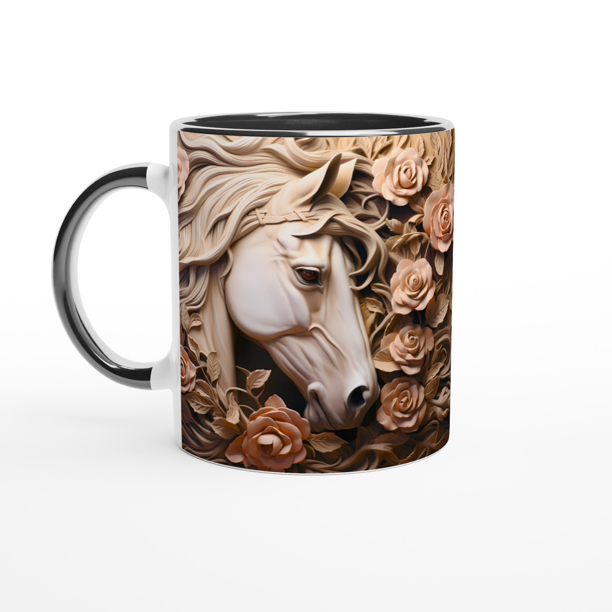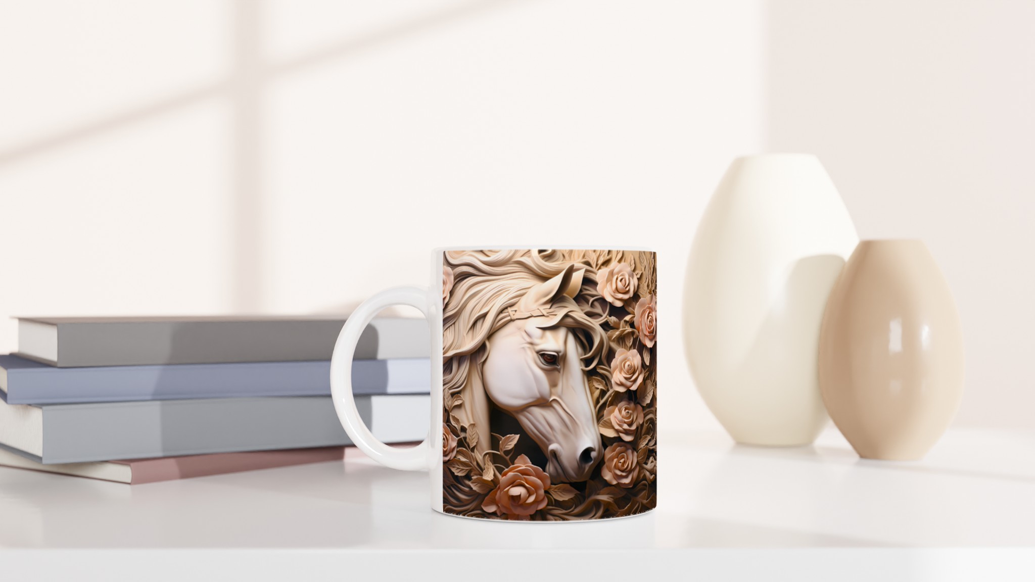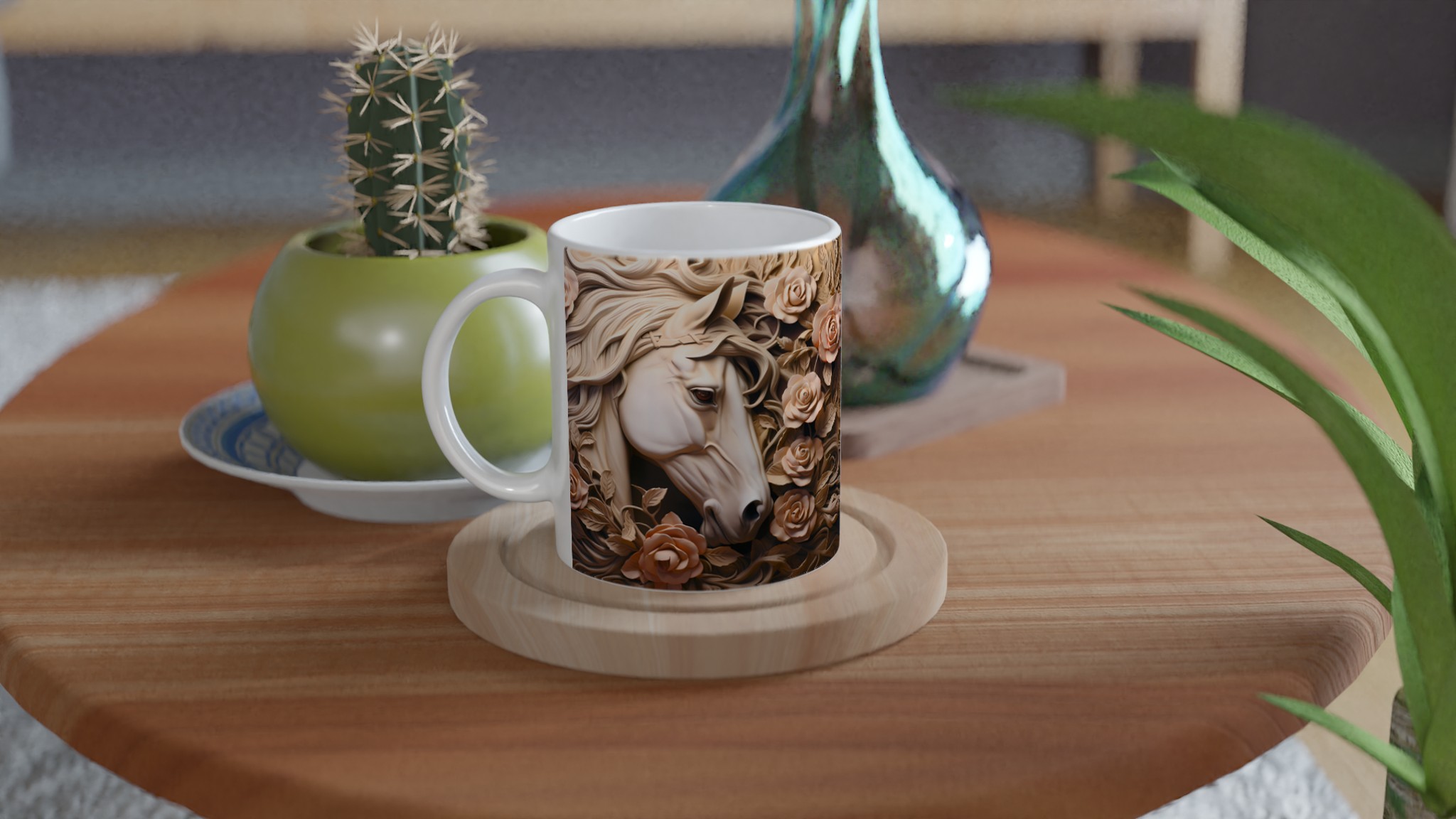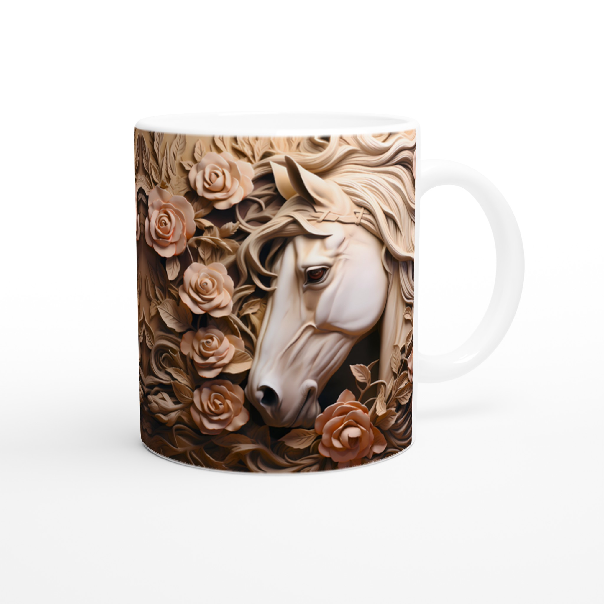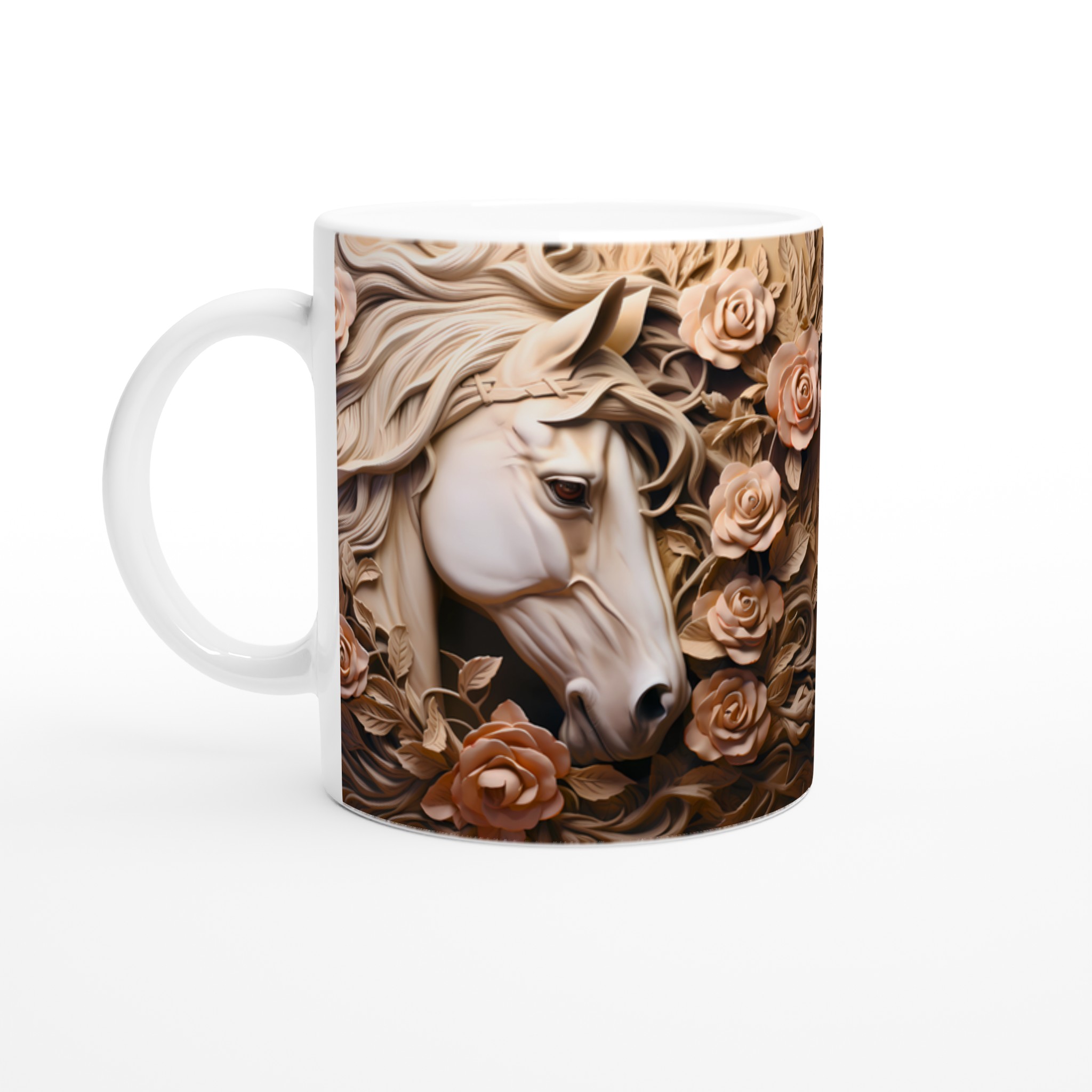 Lyft din fikastund till en konstupplevelse med denna gudomligt vackra keramiska mugg, inspirerad av den lugnande skönheten hos marmorskulpturer och rosenträdgårdar. Den mjuka paletten av neutrala toner och den intrikata designen av hästhuvuden och blommor skapar en känsla av tidlös elegans som kompletterar varje hem eller kontor.