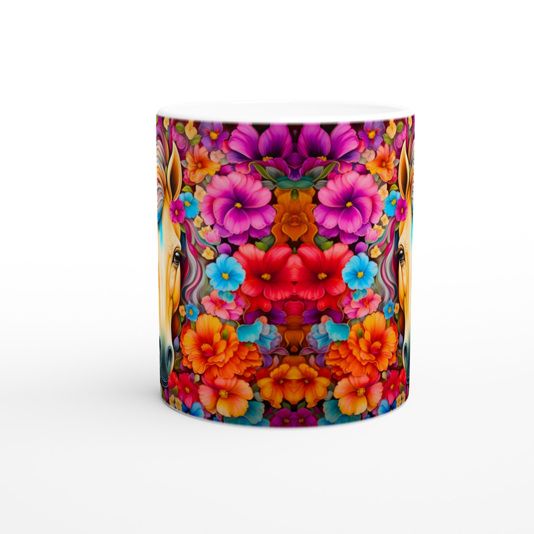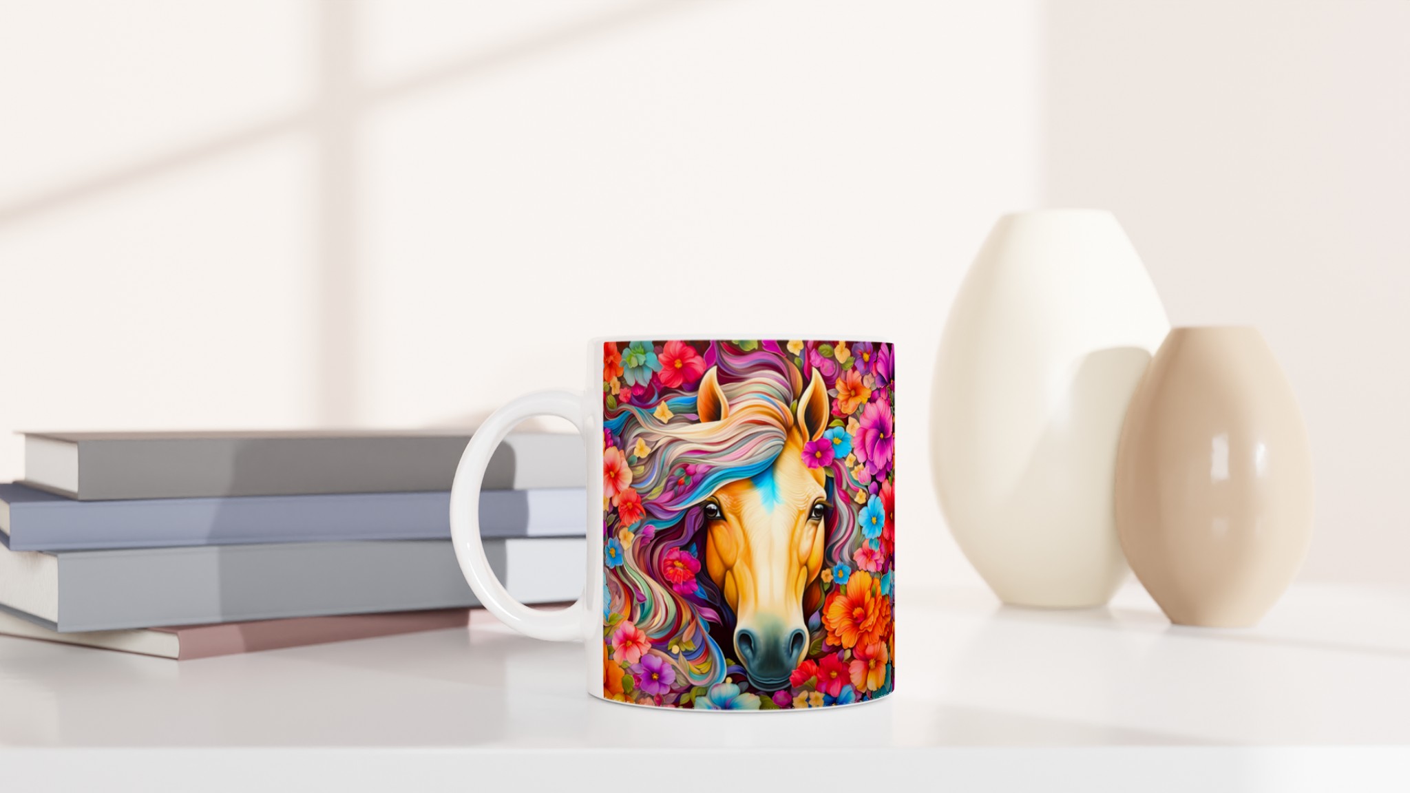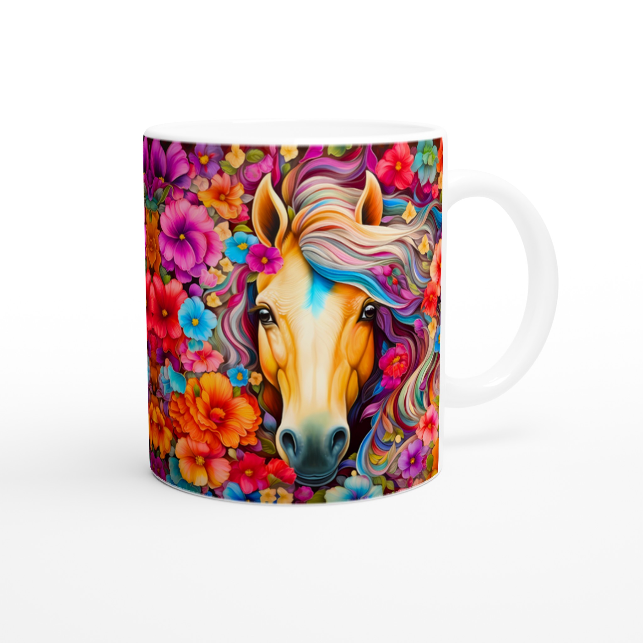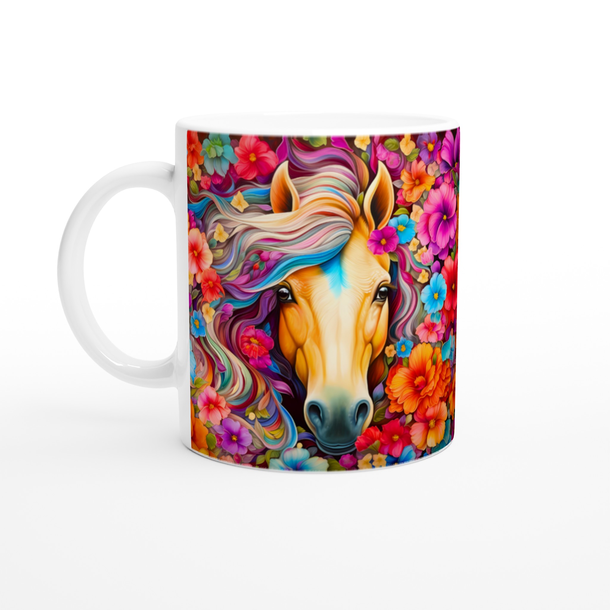 Låt varje klunk bli en resa in i en värld av färg och fantasi med denna förtrollande keramiska mugg. Smyckad med en drömlik illustration av vackra hästar omgivna av en överdådig blomsterprakt i en explosion av livfulla färger, är denna mugg mer än bara en dryckesbehållare – den är ett konstverk. Den blanka vita ytan ser till att trycken framhävs med klara och levande färger, som håller sig fina även efter många turer i mikron och diskmaskinen.