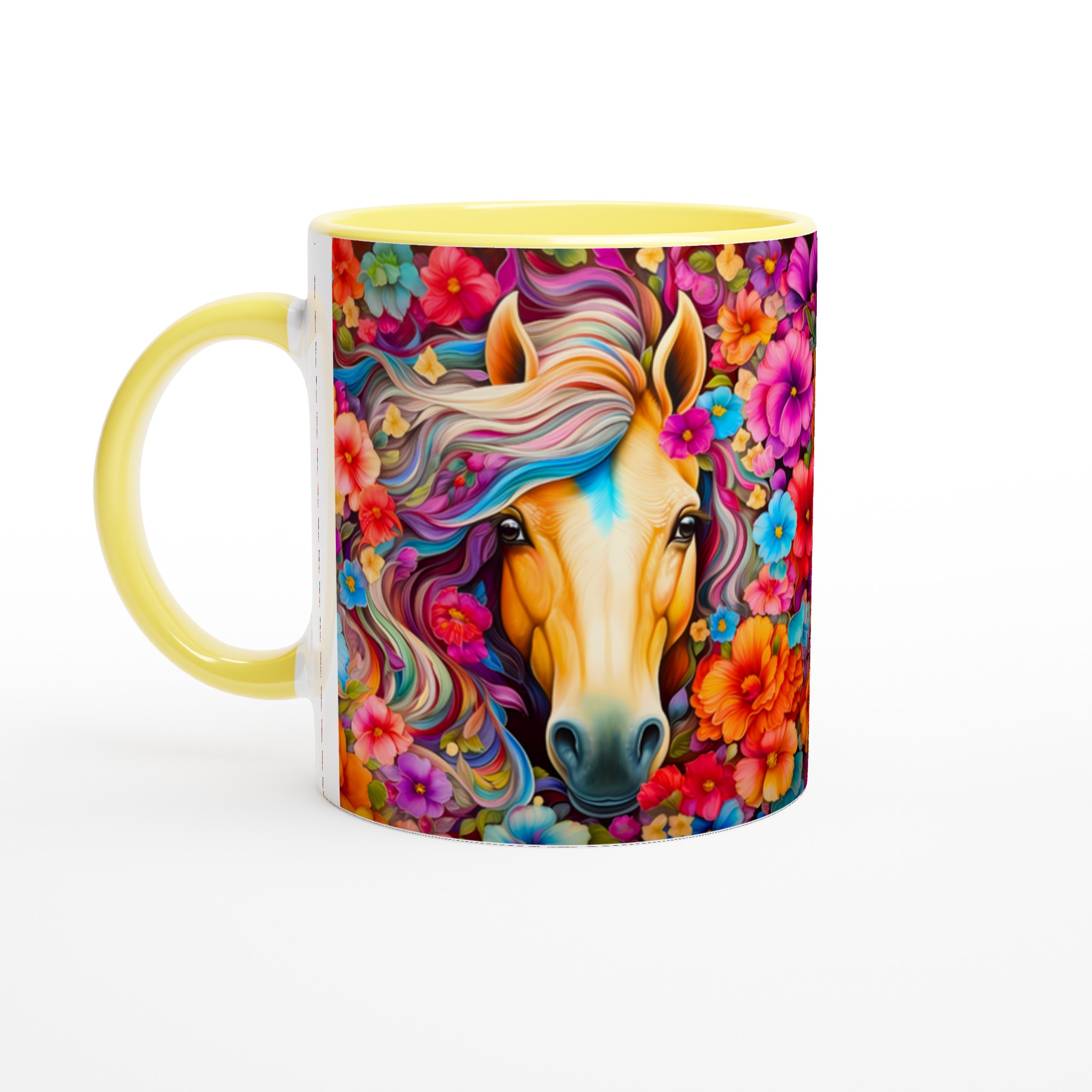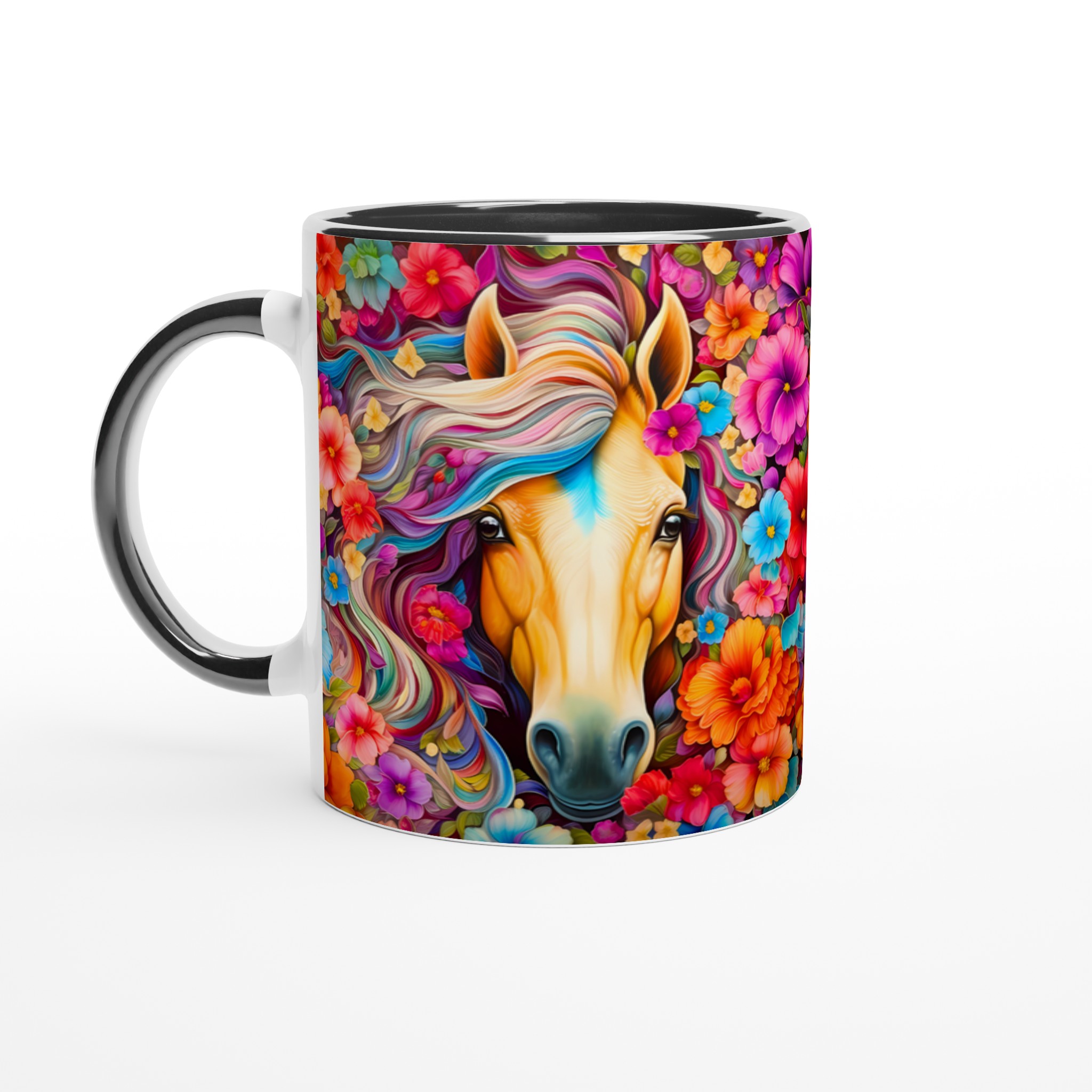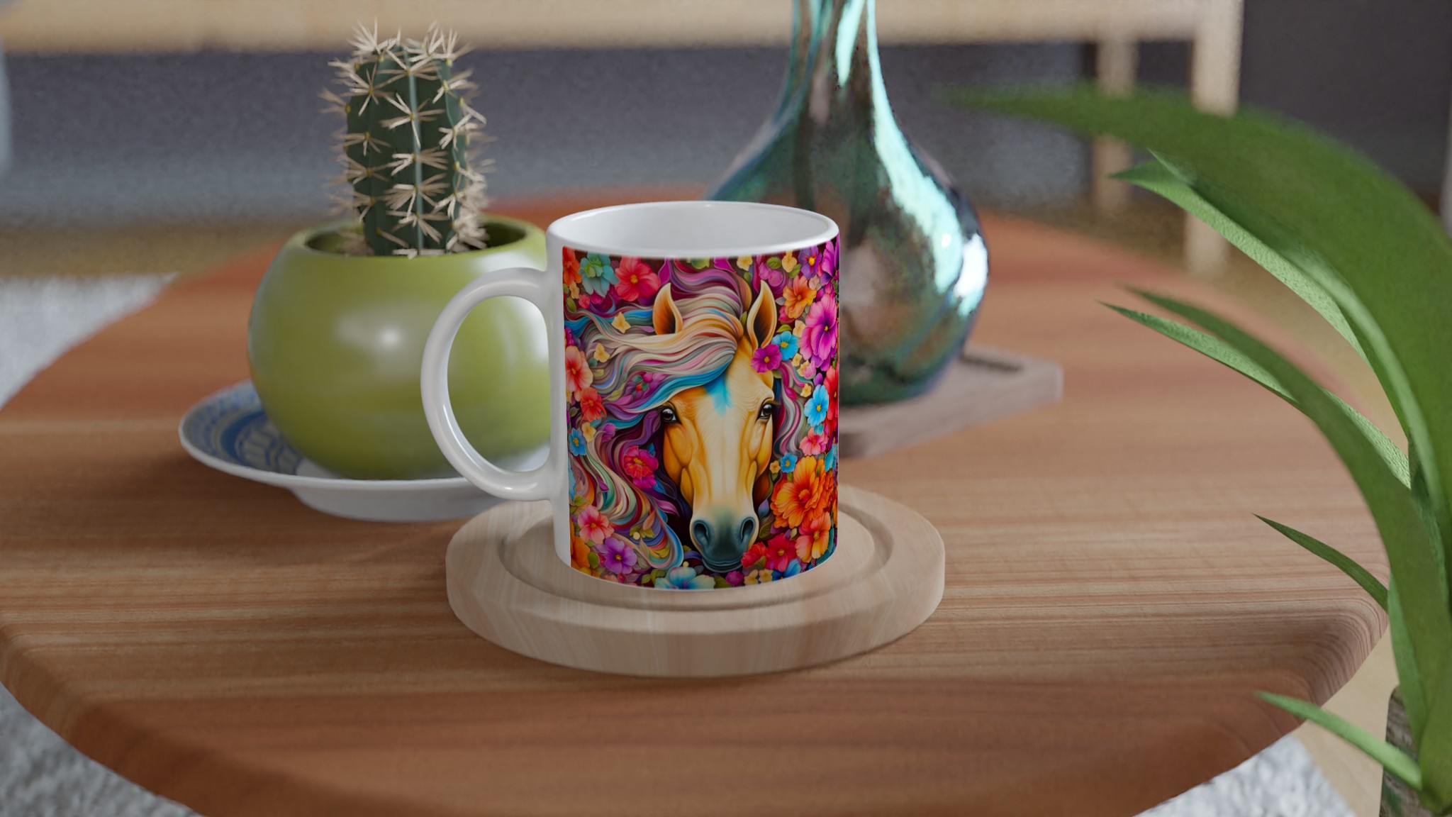 Låt varje klunk bli en resa in i en värld av färg och fantasi med denna förtrollande keramiska mugg. Smyckad med en drömlik illustration av vackra hästar omgivna av en överdådig blomsterprakt i en explosion av livfulla färger, är denna mugg mer än bara en dryckesbehållare – den är ett konstverk. Den blanka vita ytan ser till att trycken framhävs med klara och levande färger, som håller sig fina även efter många turer i mikron och diskmaskinen.