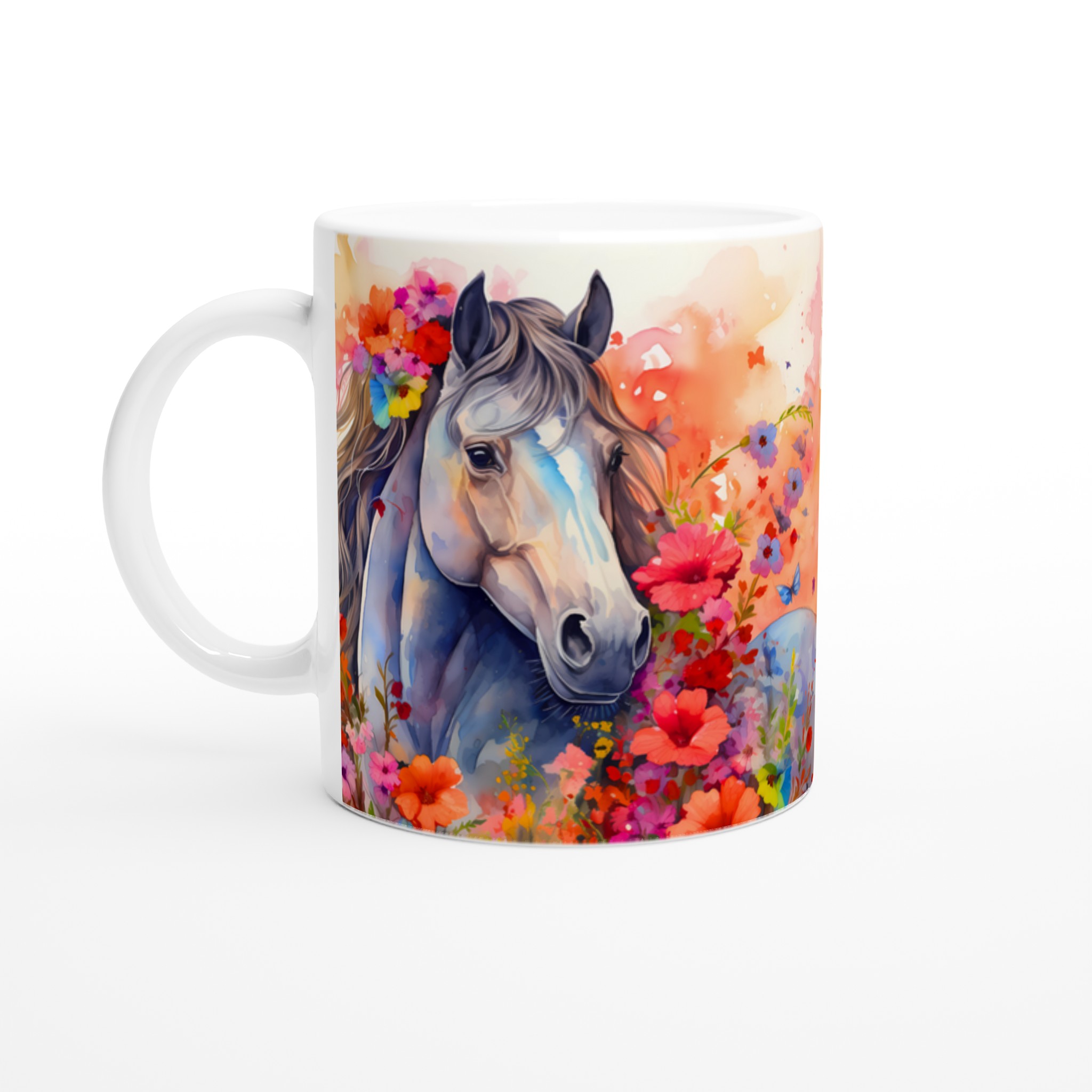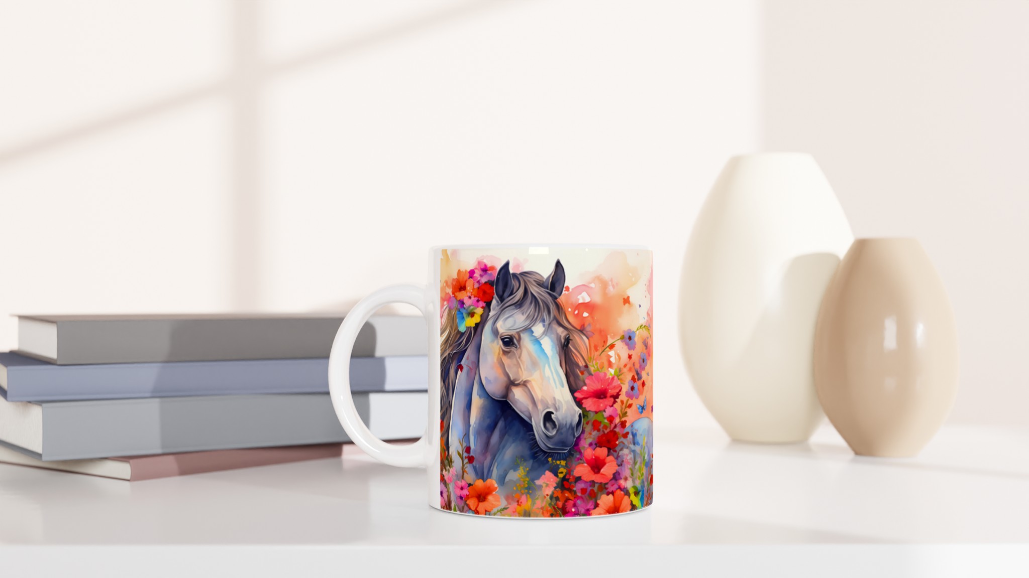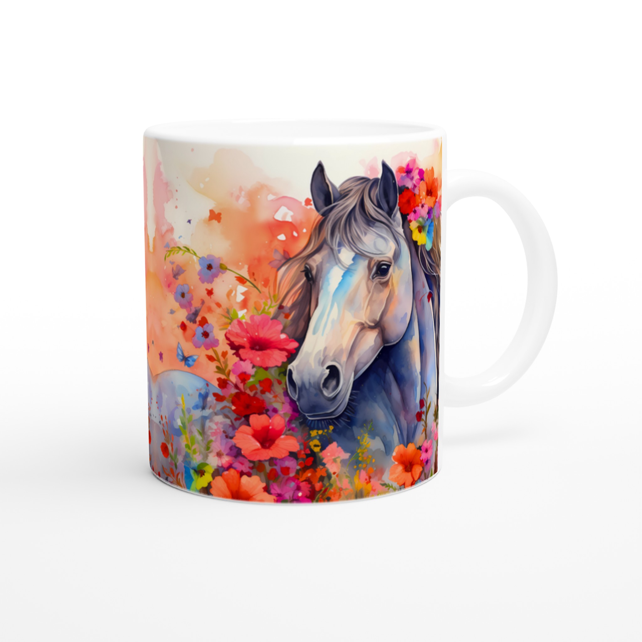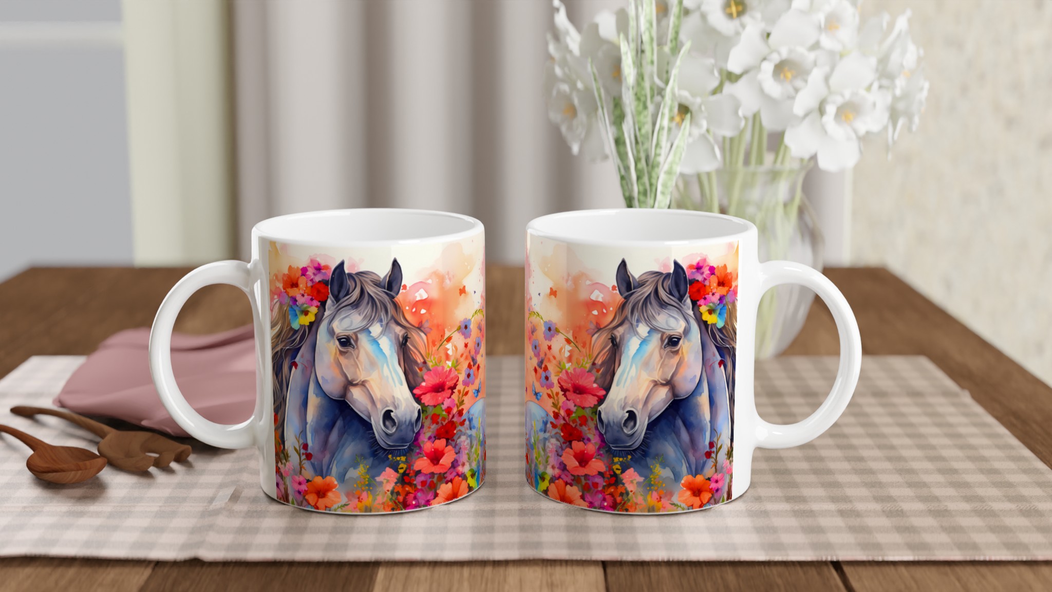 Den blanka ytan lyfter fram de klara och levande färgerna i detta konstverk, och du kan vara säker på att trycket håller sig vackert även efter otaliga turer i mikron och diskmaskinen. Välj mellan en regnbåge av färger – Ceramic White, Ceramic Yellow, Ceramic Pink, Ceramic Green, Ceramic Red, Ceramic Black eller Ceramic Blue – för att hitta den perfekta matchningen för din personliga stil eller som en genomtänkt present till någon du håller kär. Det är den idealiska gåvan för alla som älskar hästar, blommor, eller helt enkelt vackra och funktionella föremål.