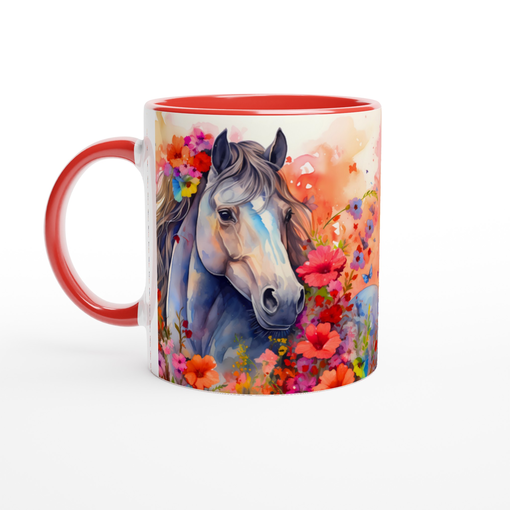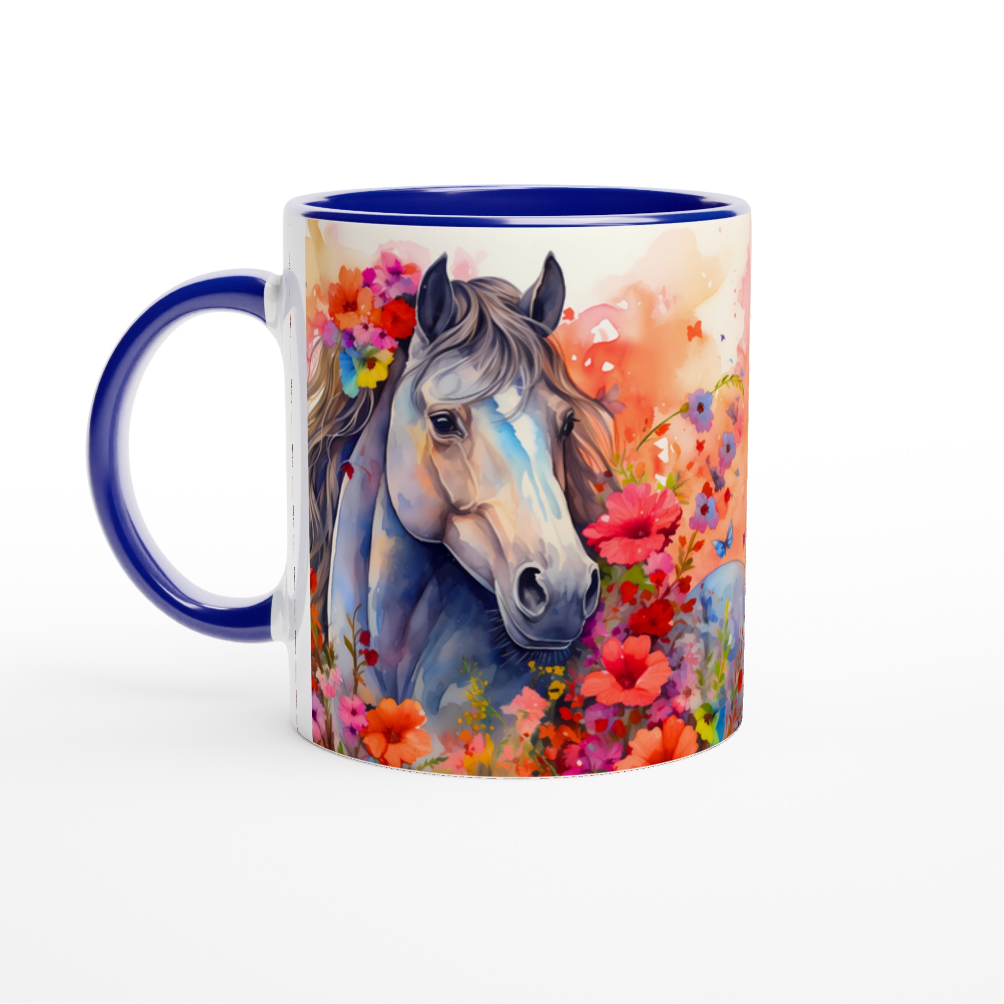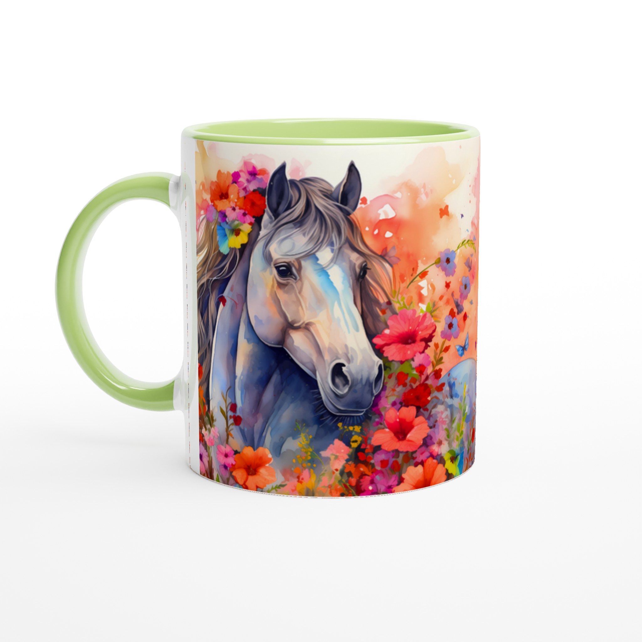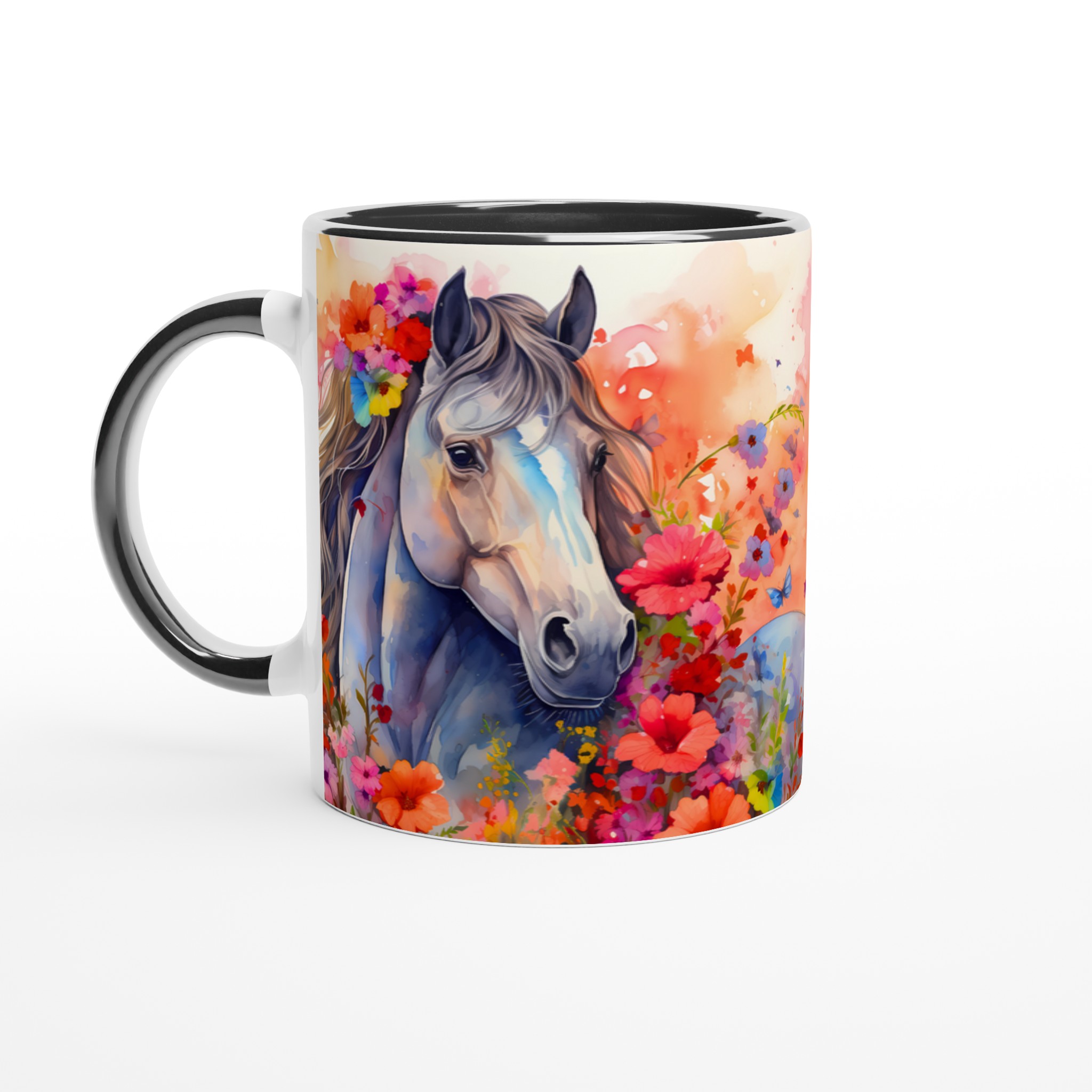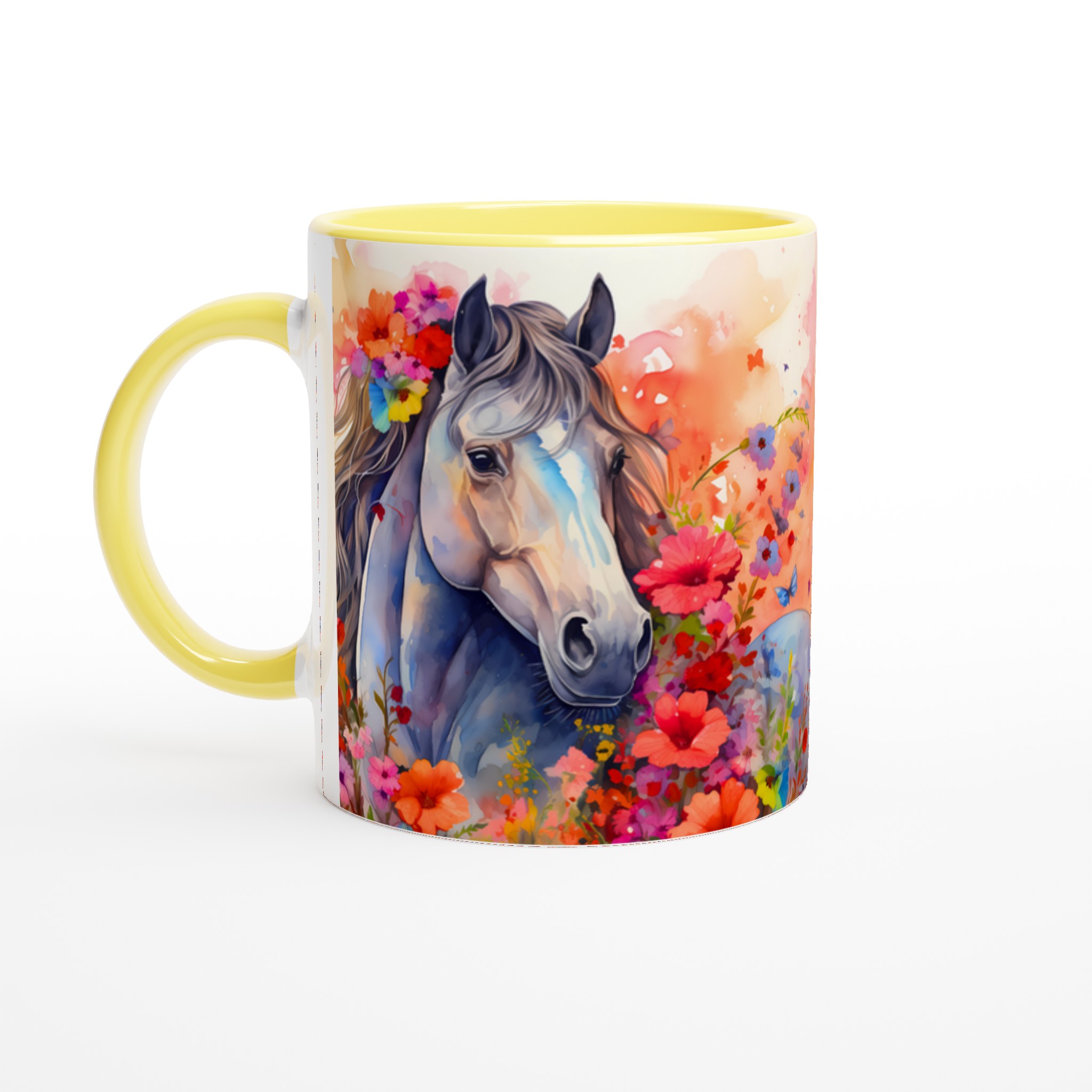 Den blanka ytan lyfter fram de klara och levande färgerna i detta konstverk, och du kan vara säker på att trycket håller sig vackert även efter otaliga turer i mikron och diskmaskinen. Välj mellan en regnbåge av färger – Ceramic White, Ceramic Yellow, Ceramic Pink, Ceramic Green, Ceramic Red, Ceramic Black eller Ceramic Blue – för att hitta den perfekta matchningen för din personliga stil eller som en genomtänkt present till någon du håller kär. Det är den idealiska gåvan för alla som älskar hästar, blommor, eller helt enkelt vackra och funktionella föremål.