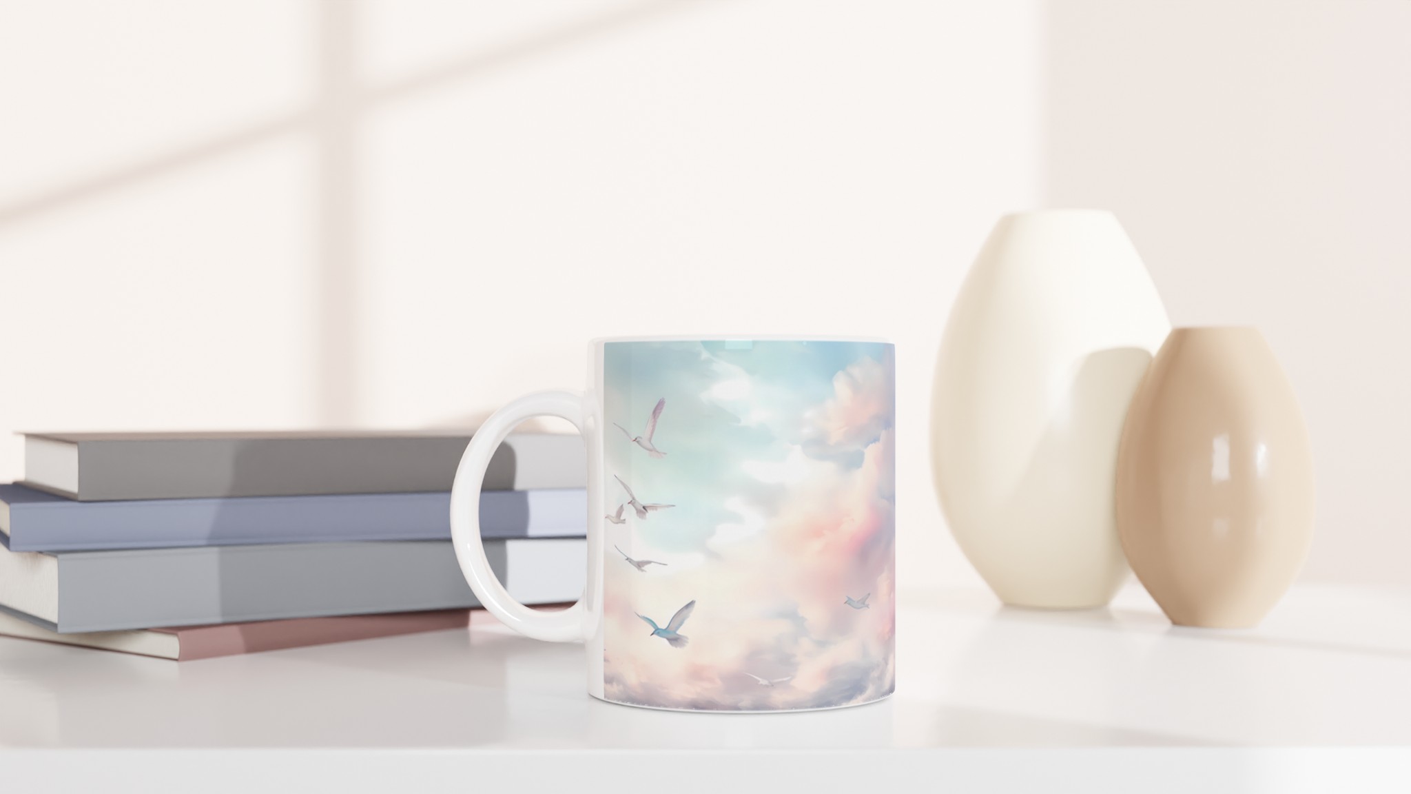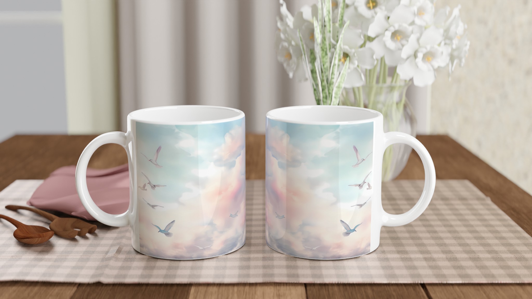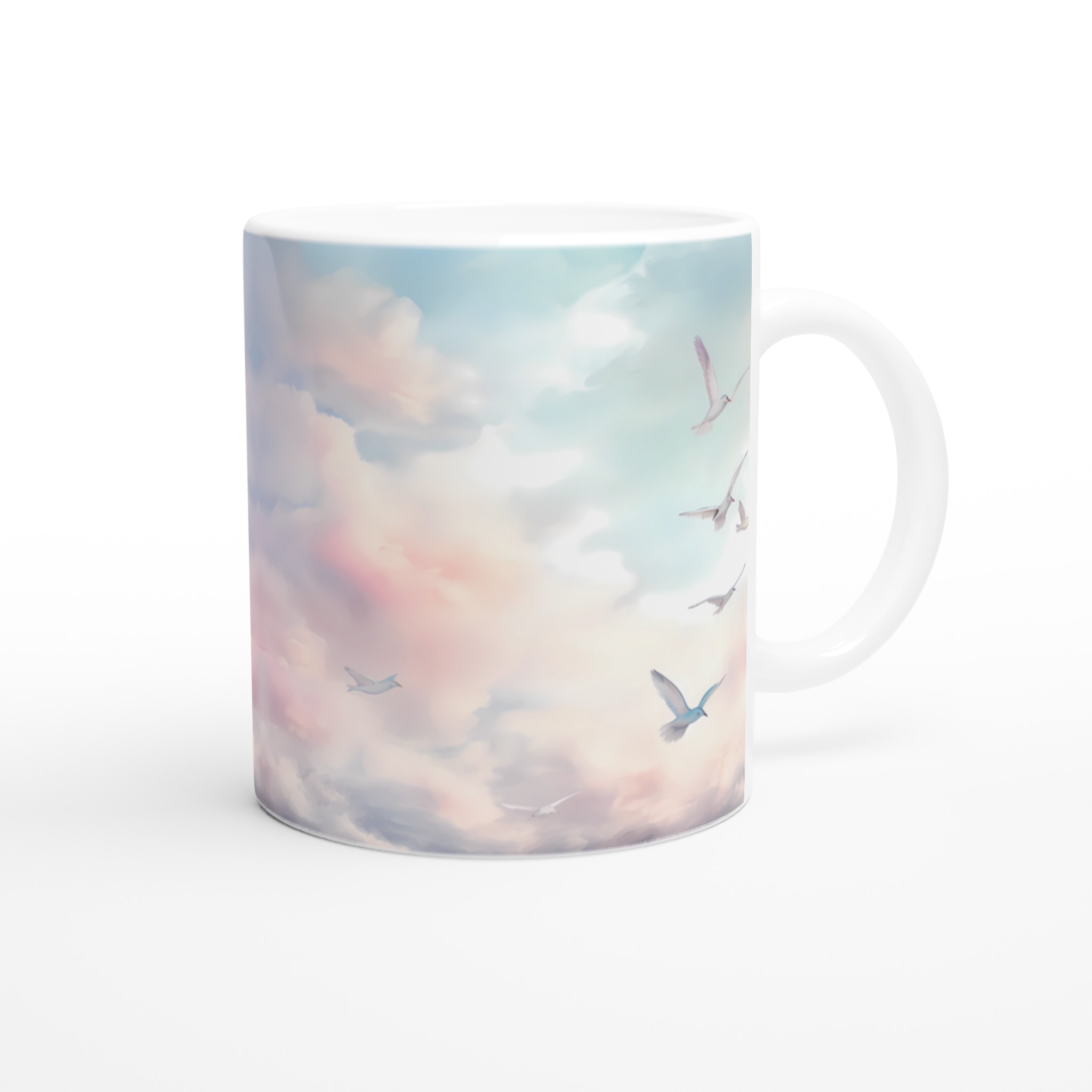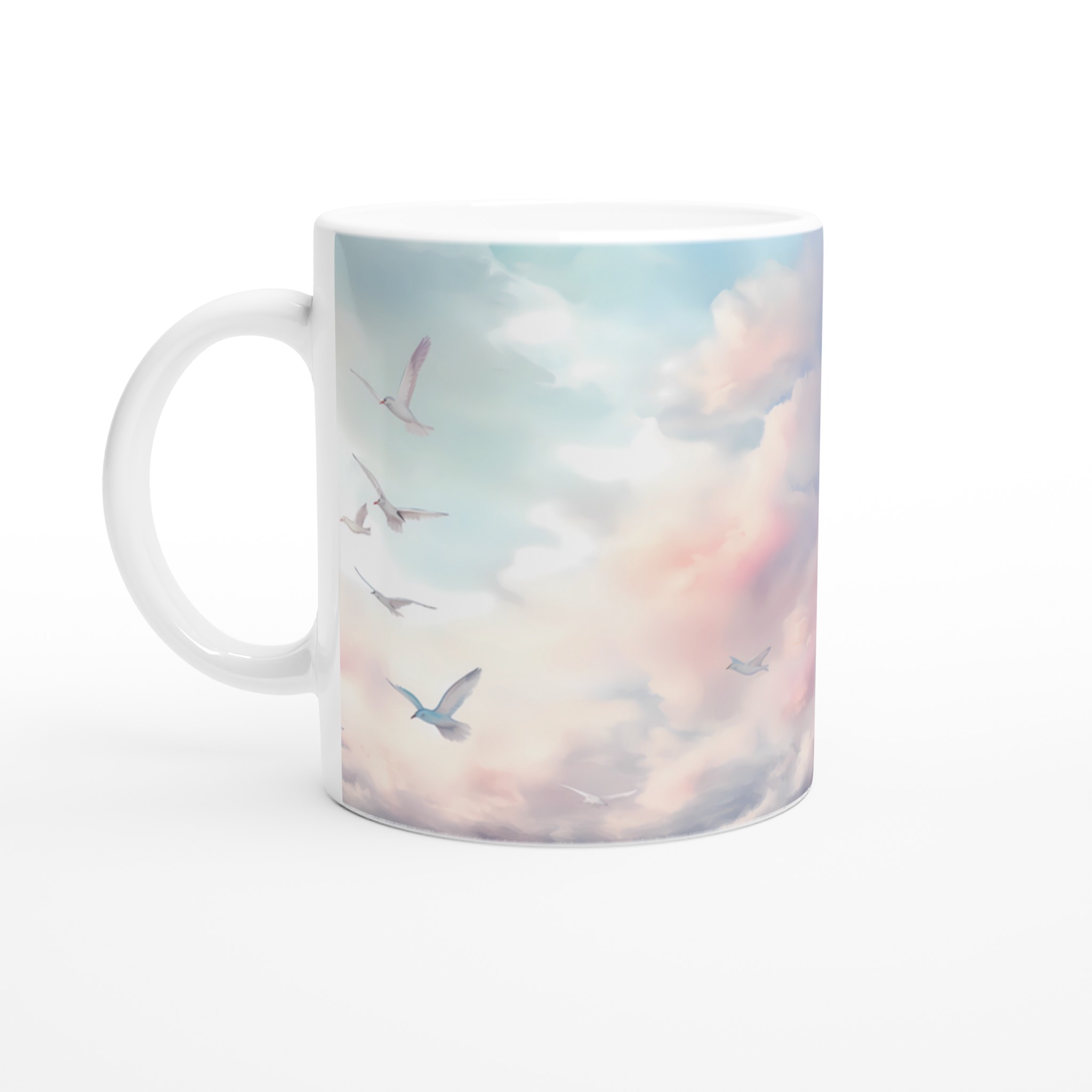 Låt tankarna flyga fritt med denna underbara keramiska mugg, som fångar den lugna skönheten hos duvor som svävar genom pastellfärgade moln. Den drömska designen med toner av mjukt rosa, blått och vitt skapar en känsla av ro och harmoni, perfekt för att starta dagen med en stilla stund eller varva ner på kvällen.