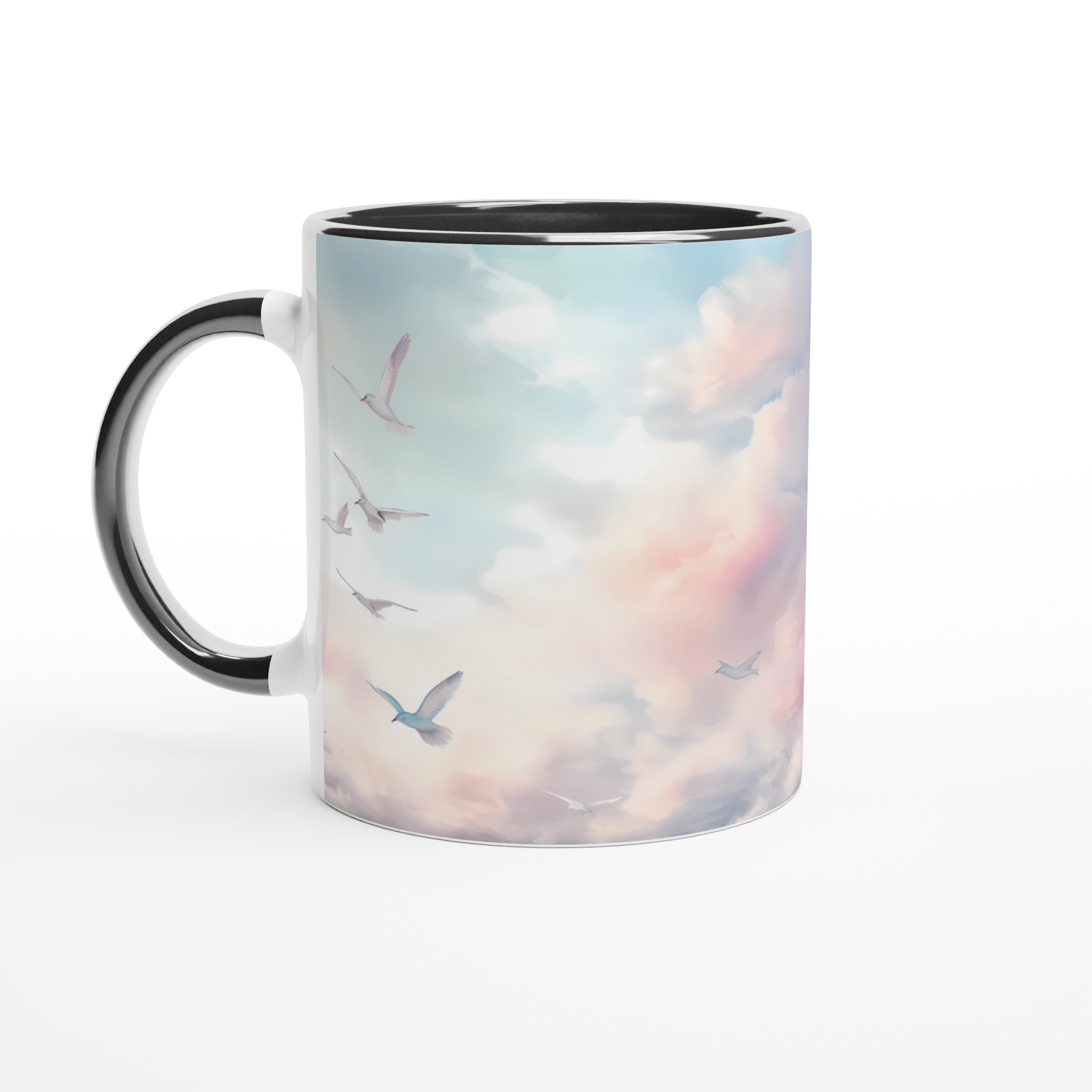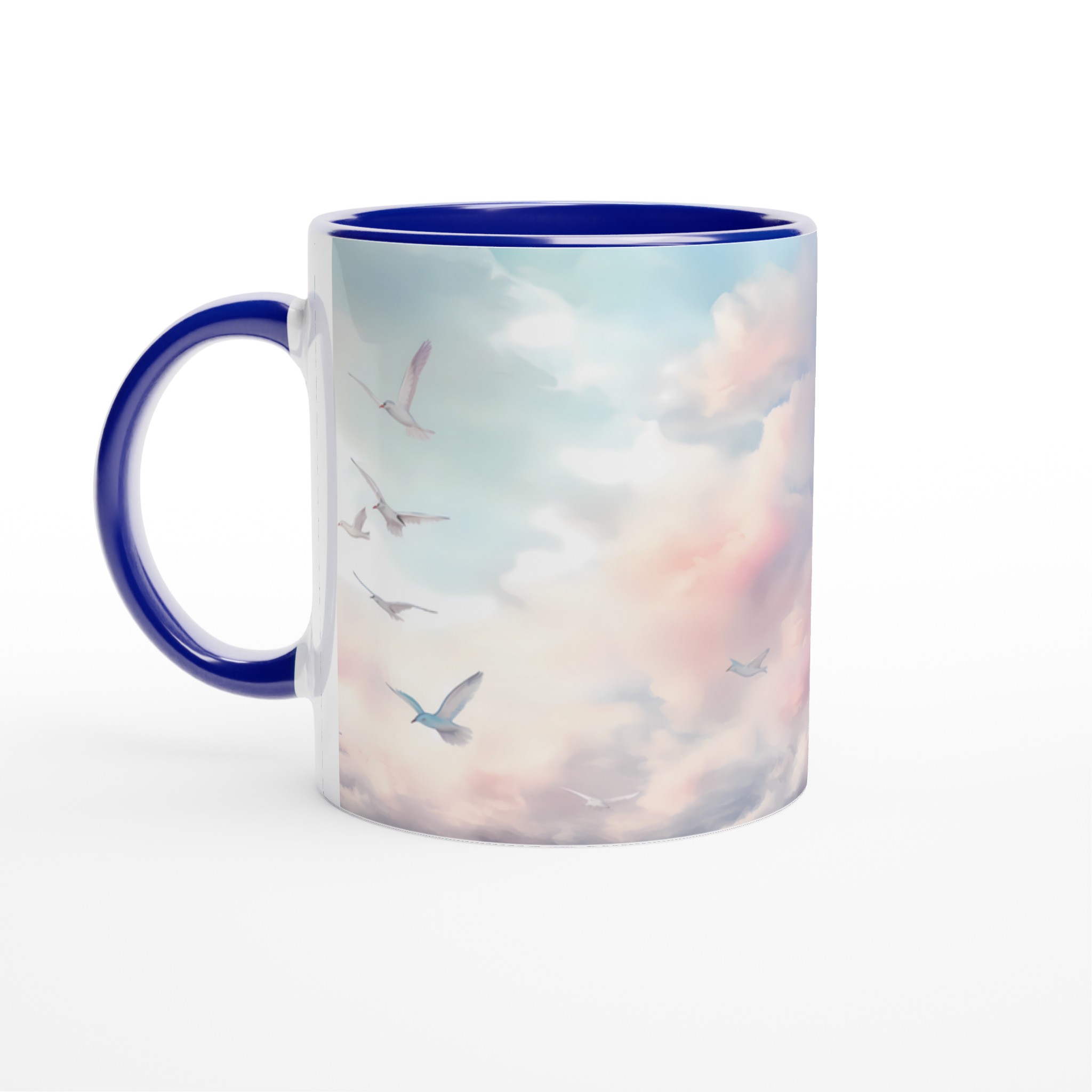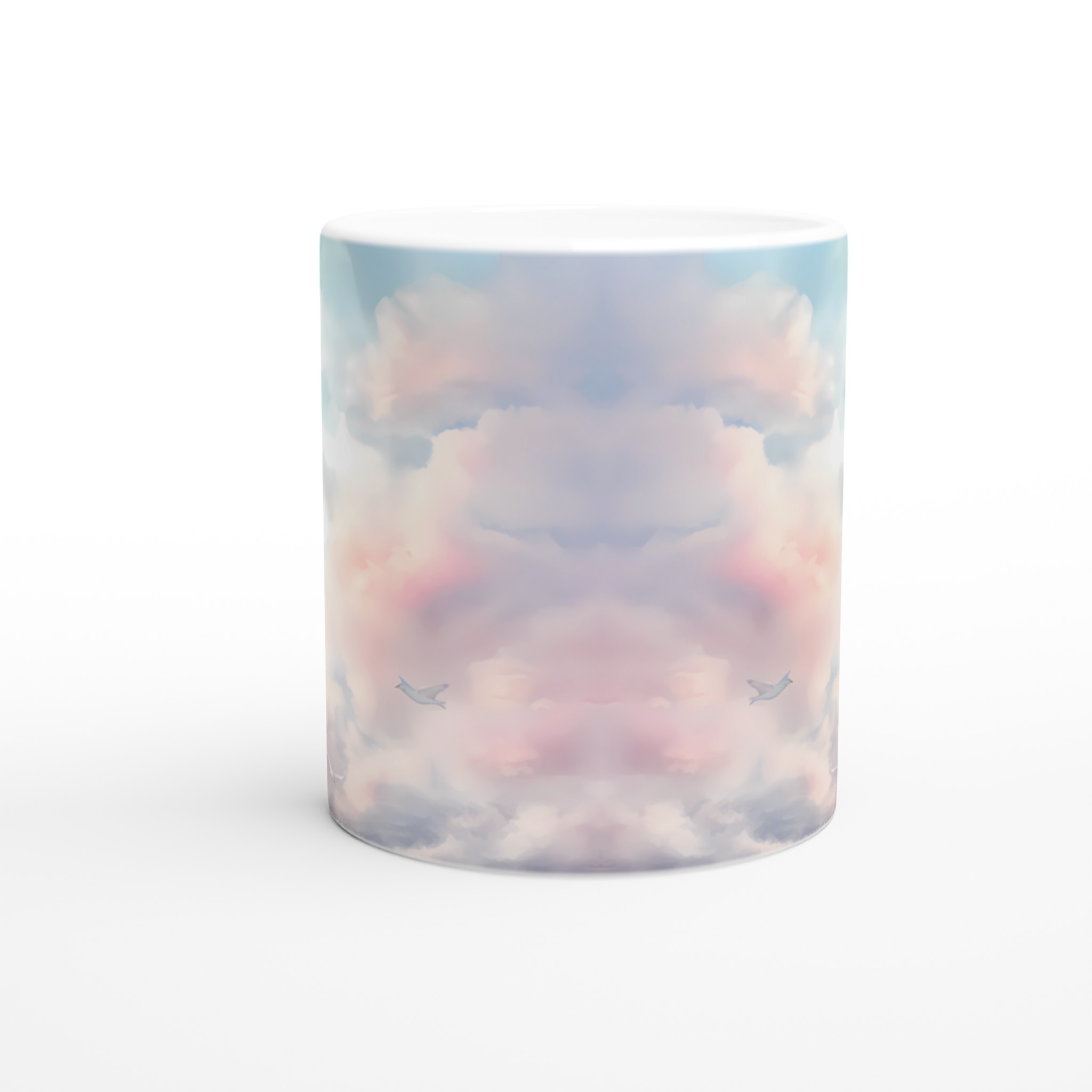 Låt tankarna flyga fritt med denna underbara keramiska mugg, som fångar den lugna skönheten hos duvor som svävar genom pastellfärgade moln. Den drömska designen med toner av mjukt rosa, blått och vitt skapar en känsla av ro och harmoni, perfekt för att starta dagen med en stilla stund eller varva ner på kvällen.