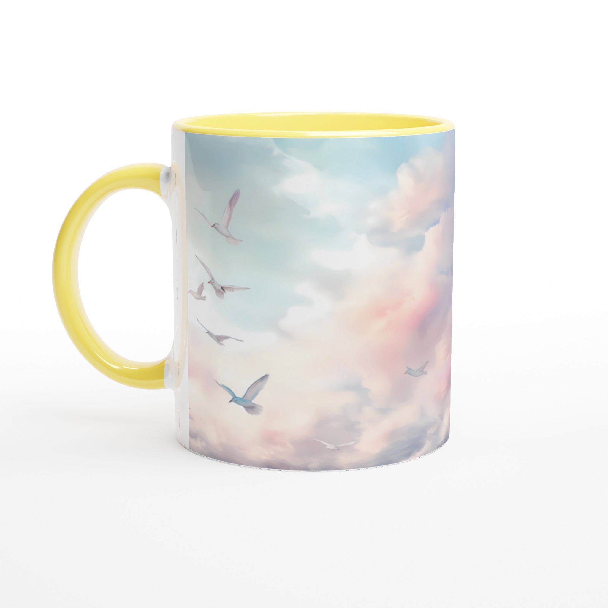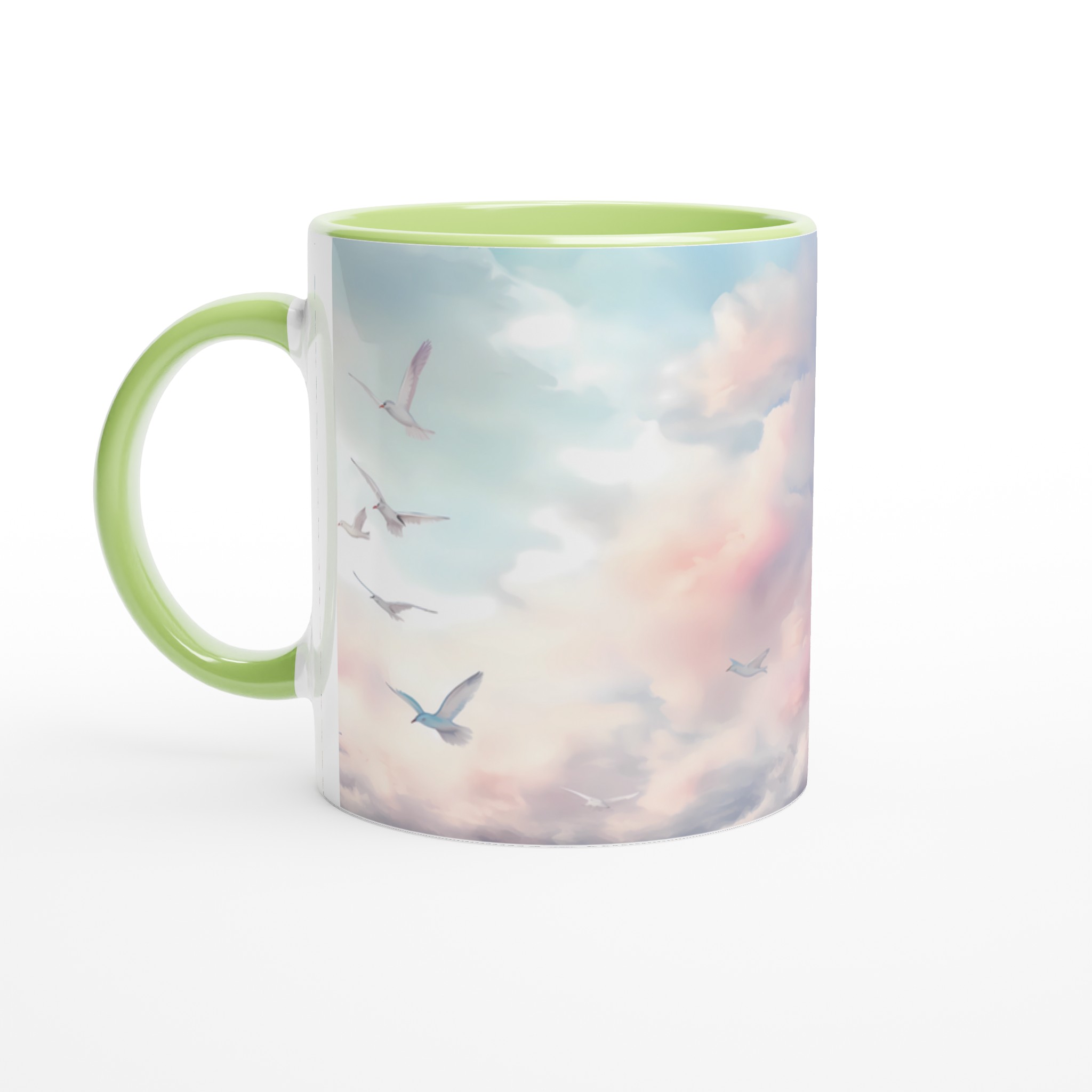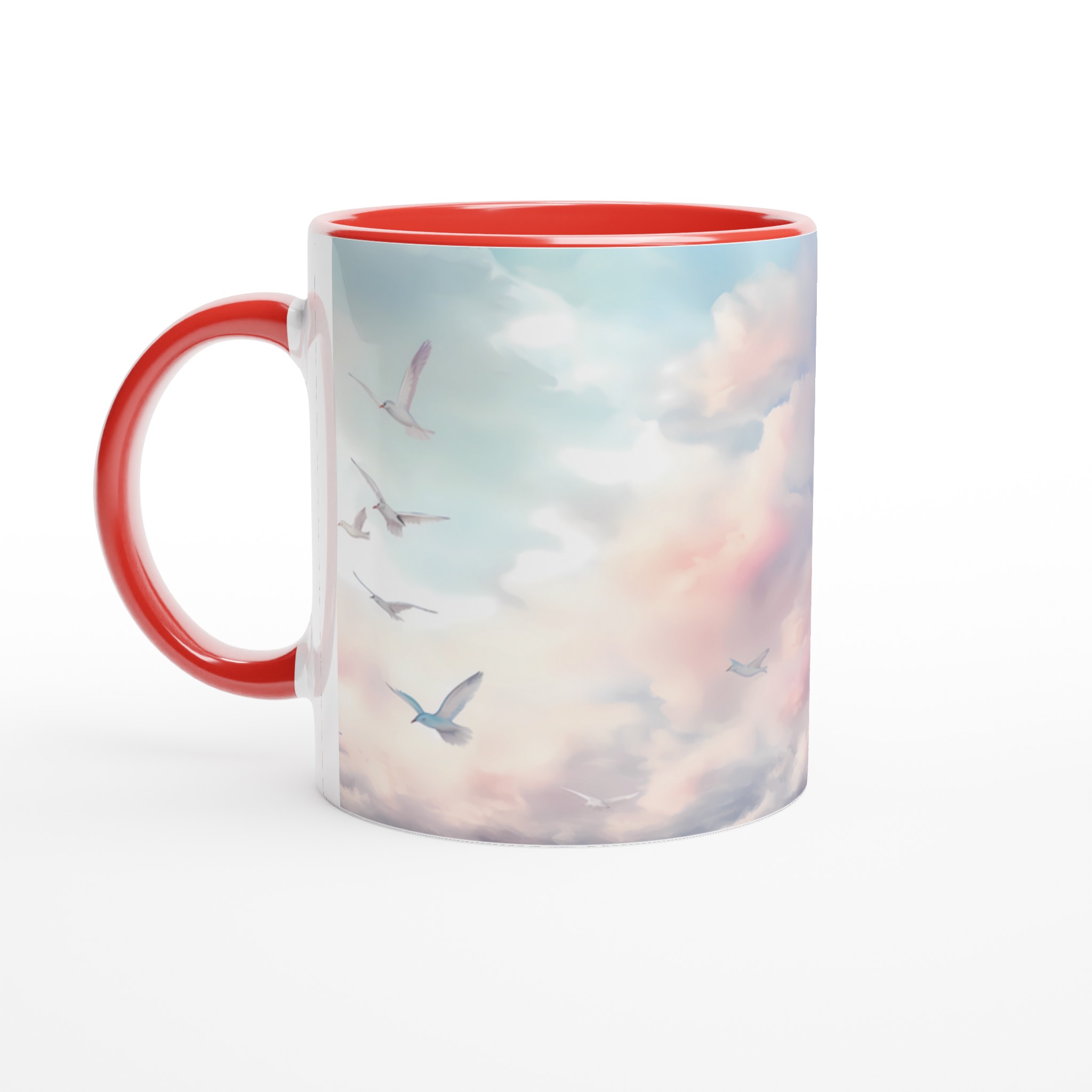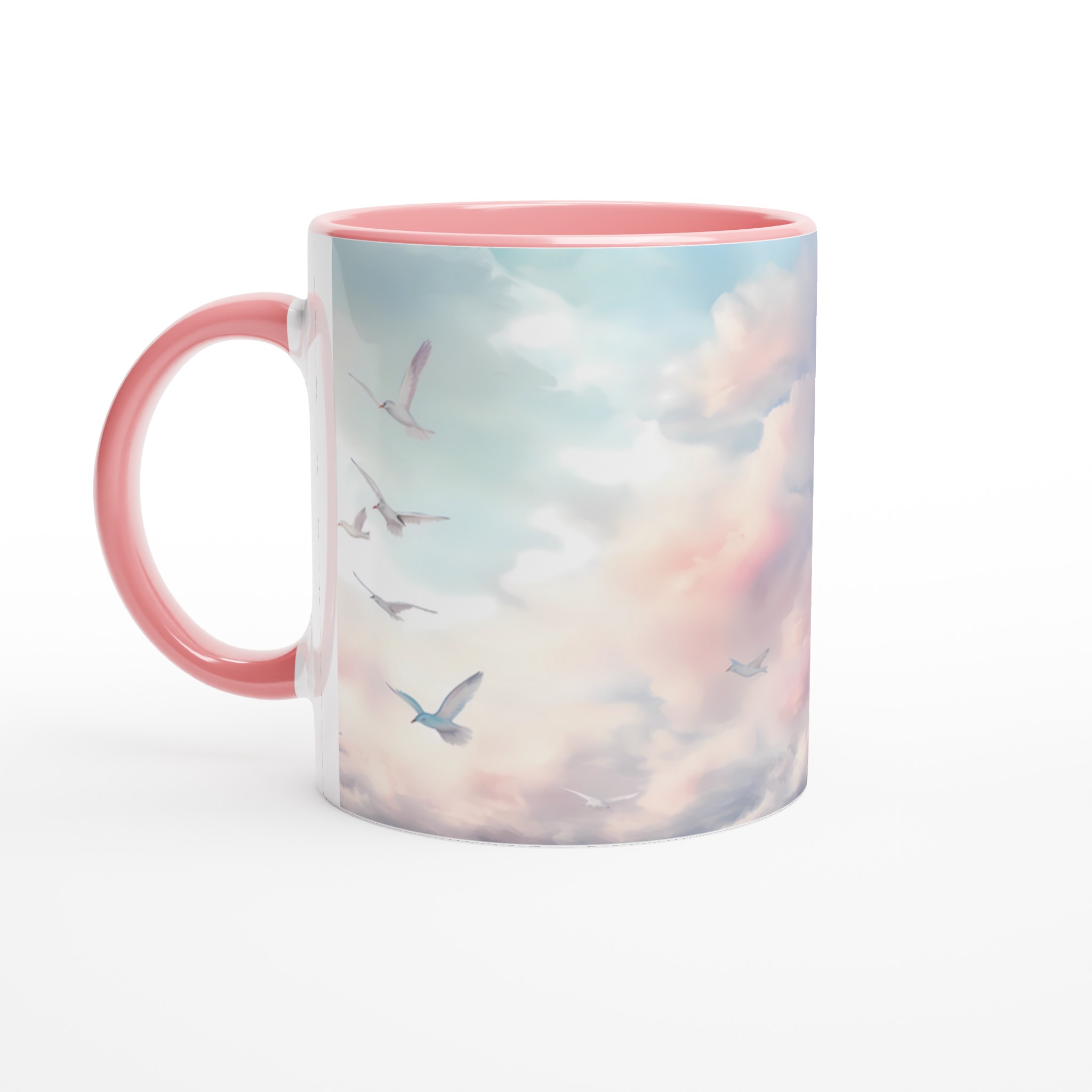 Låt tankarna flyga fritt med denna underbara keramiska mugg, som fångar den lugna skönheten hos duvor som svävar genom pastellfärgade moln. Den drömska designen med toner av mjukt rosa, blått och vitt skapar en känsla av ro och harmoni, perfekt för att starta dagen med en stilla stund eller varva ner på kvällen.