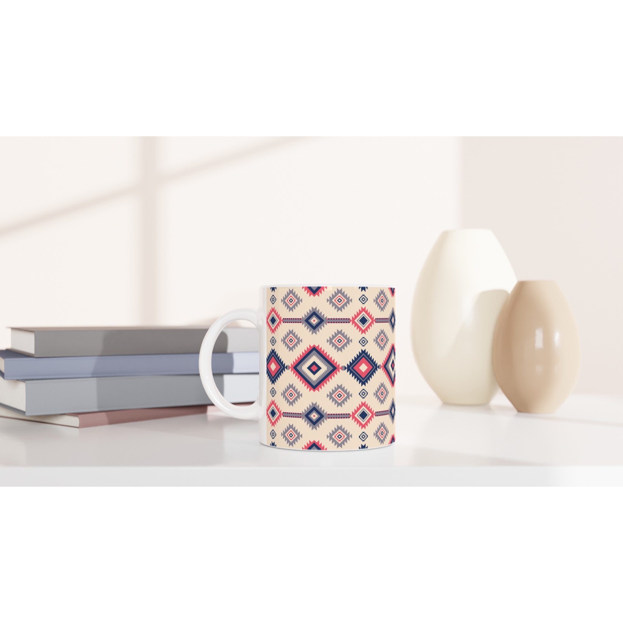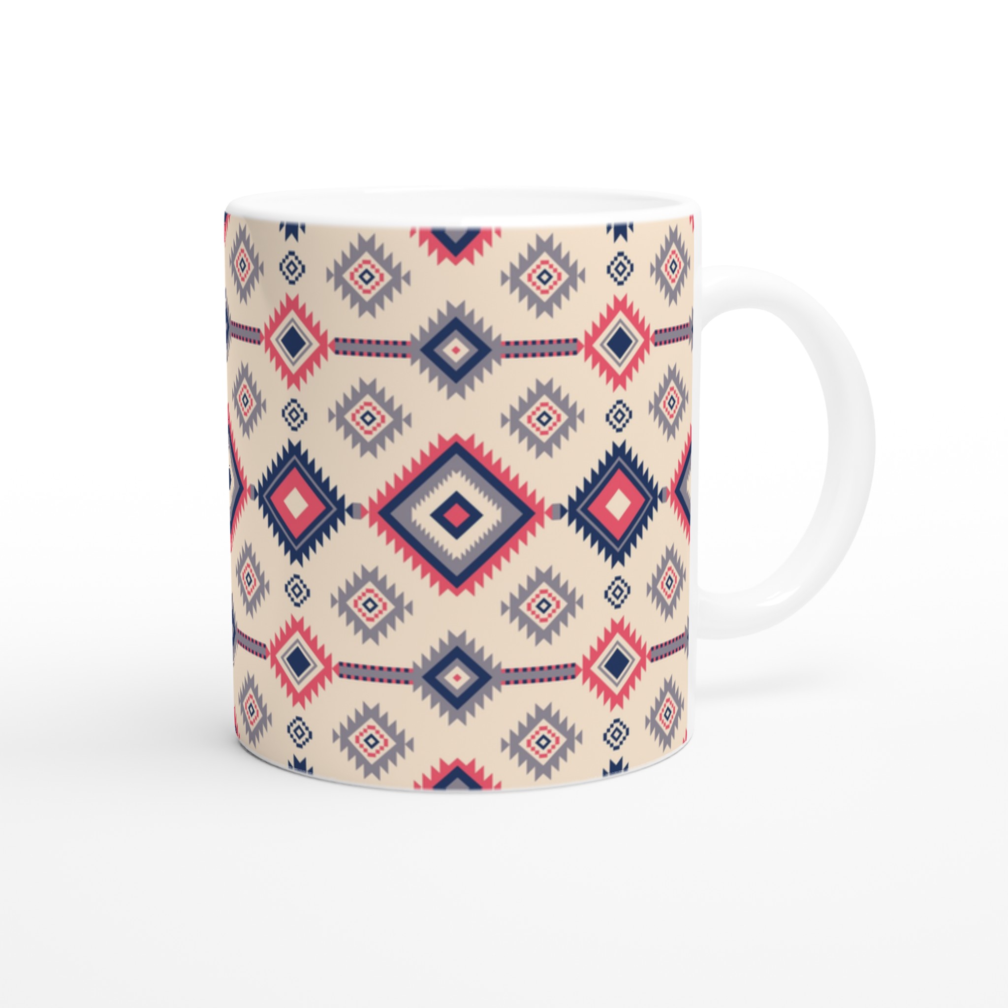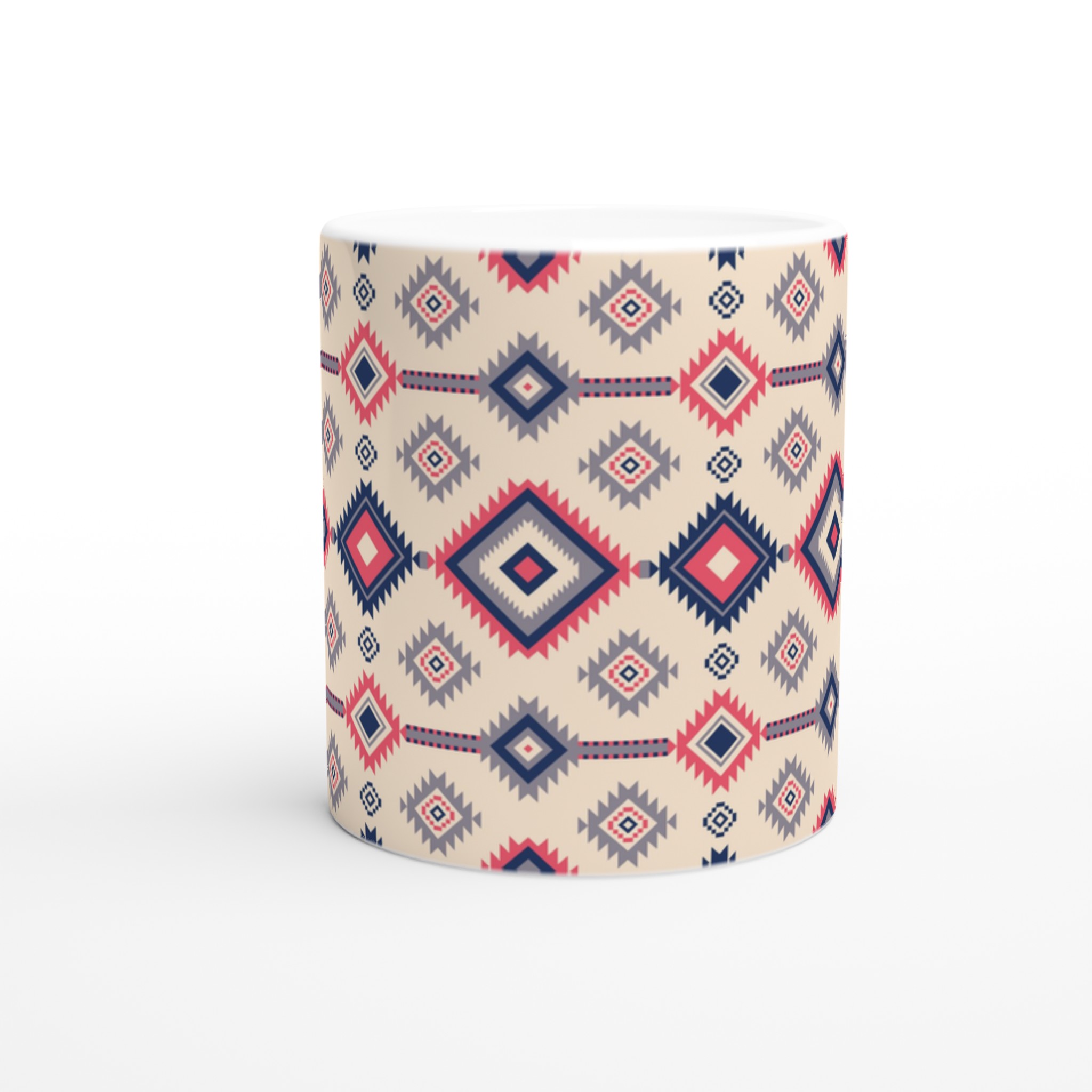 Lyft din vardagsritual med denna unikt designade keramiska mugg, prydd med ett iögonfallande bohemiskt aztec-mönster i marinblått, korall och grått mot en ljusbeige bakgrund. Denna mugg är mer än bara en kopp – den är en stilfull accent som förgyller varje paus. Oavsett om det är för morgonkaffet, en värmande kopp te eller en härlig varm choklad, ger dess levande design en känsla av äventyr och personlighet till din dryckesstund.