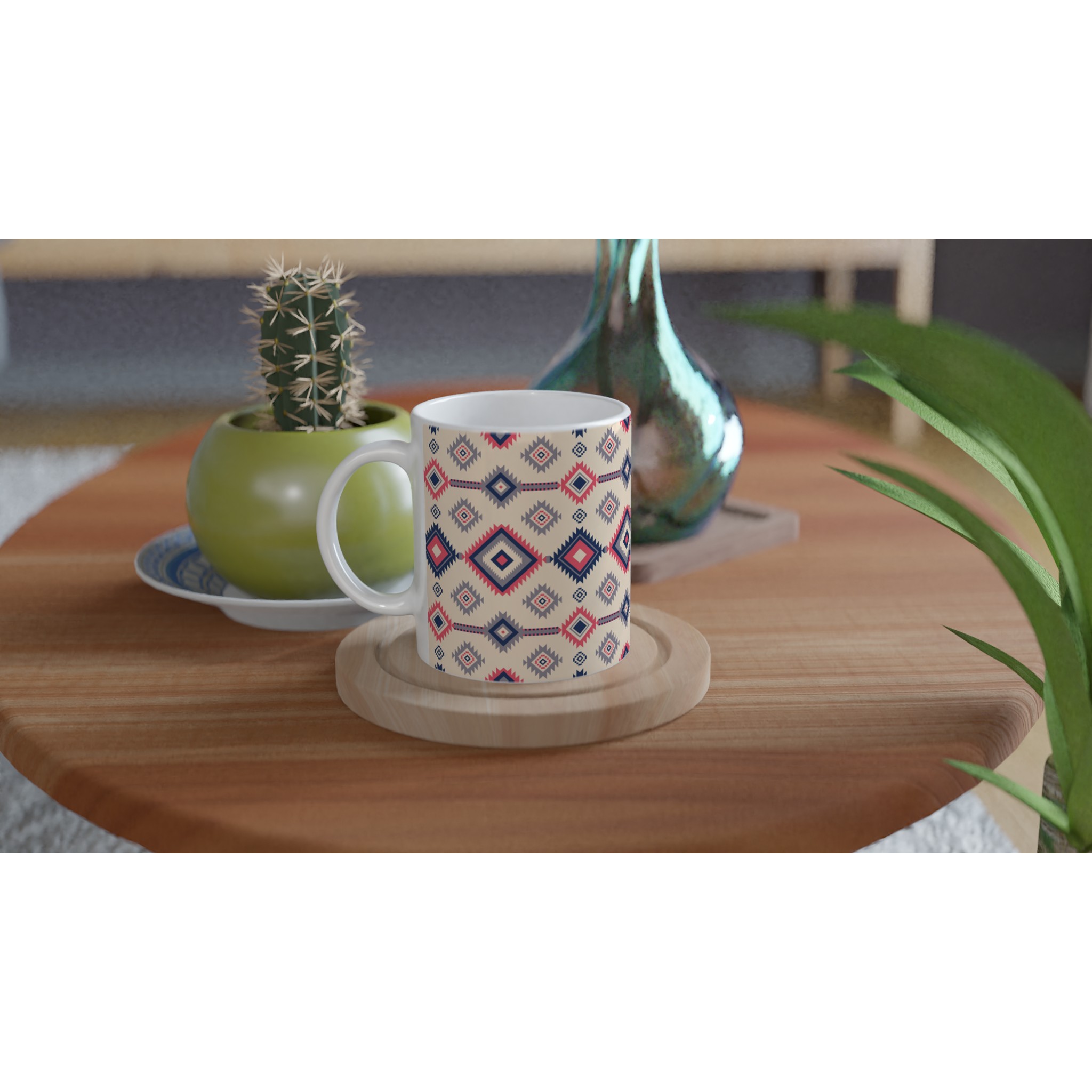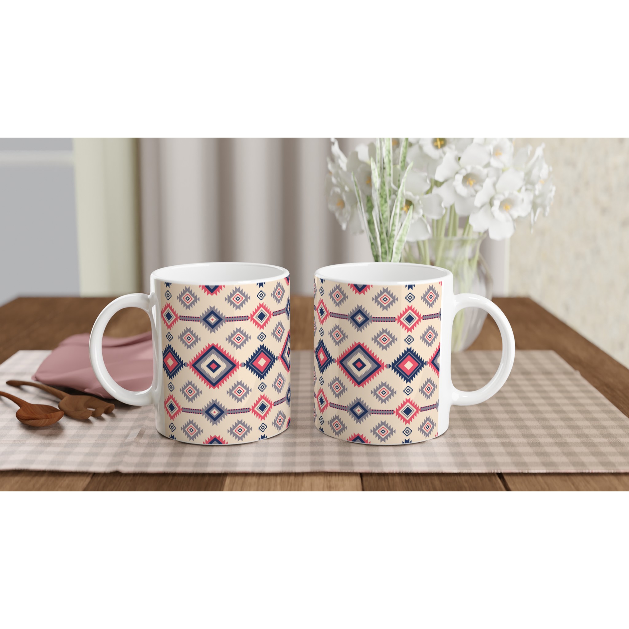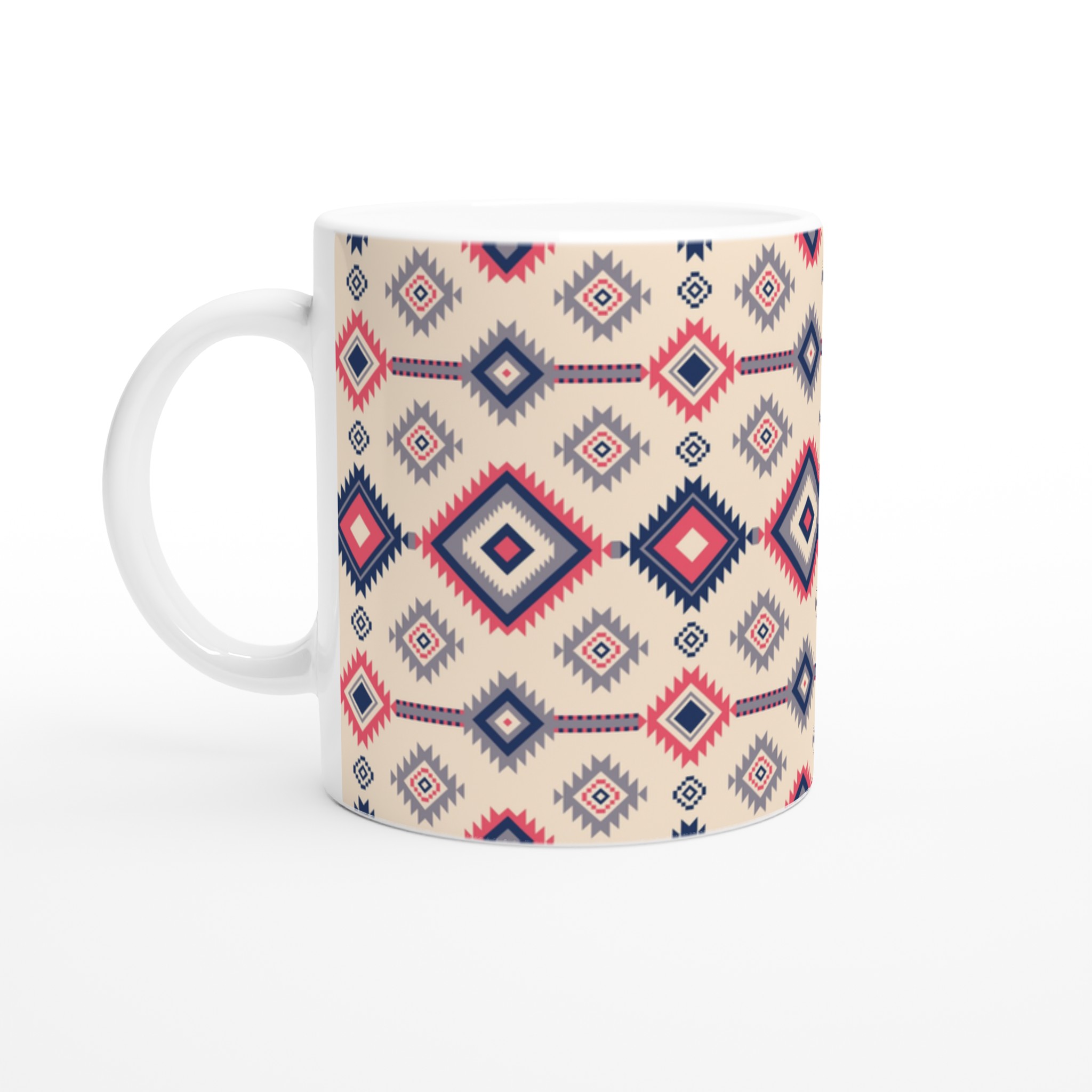 Lyft din vardagsritual med denna unikt designade keramiska mugg, prydd med ett iögonfallande bohemiskt aztec-mönster i marinblått, korall och grått mot en ljusbeige bakgrund. Denna mugg är mer än bara en kopp – den är en stilfull accent som förgyller varje paus. Oavsett om det är för morgonkaffet, en värmande kopp te eller en härlig varm choklad, ger dess levande design en känsla av äventyr och personlighet till din dryckesstund.