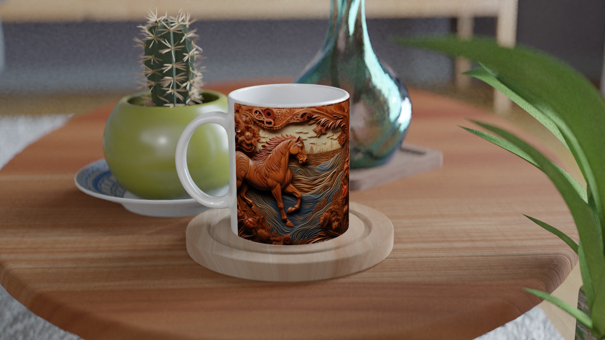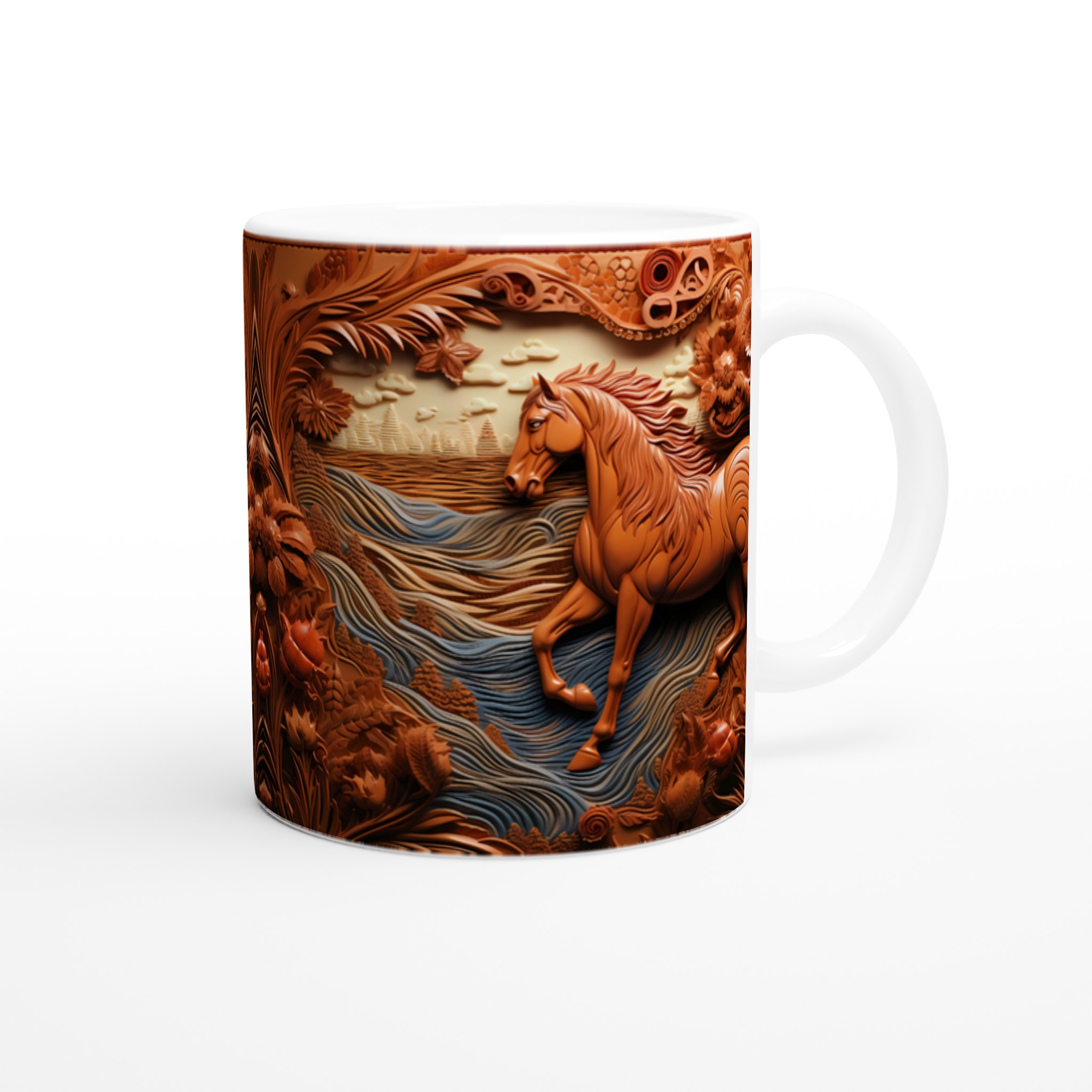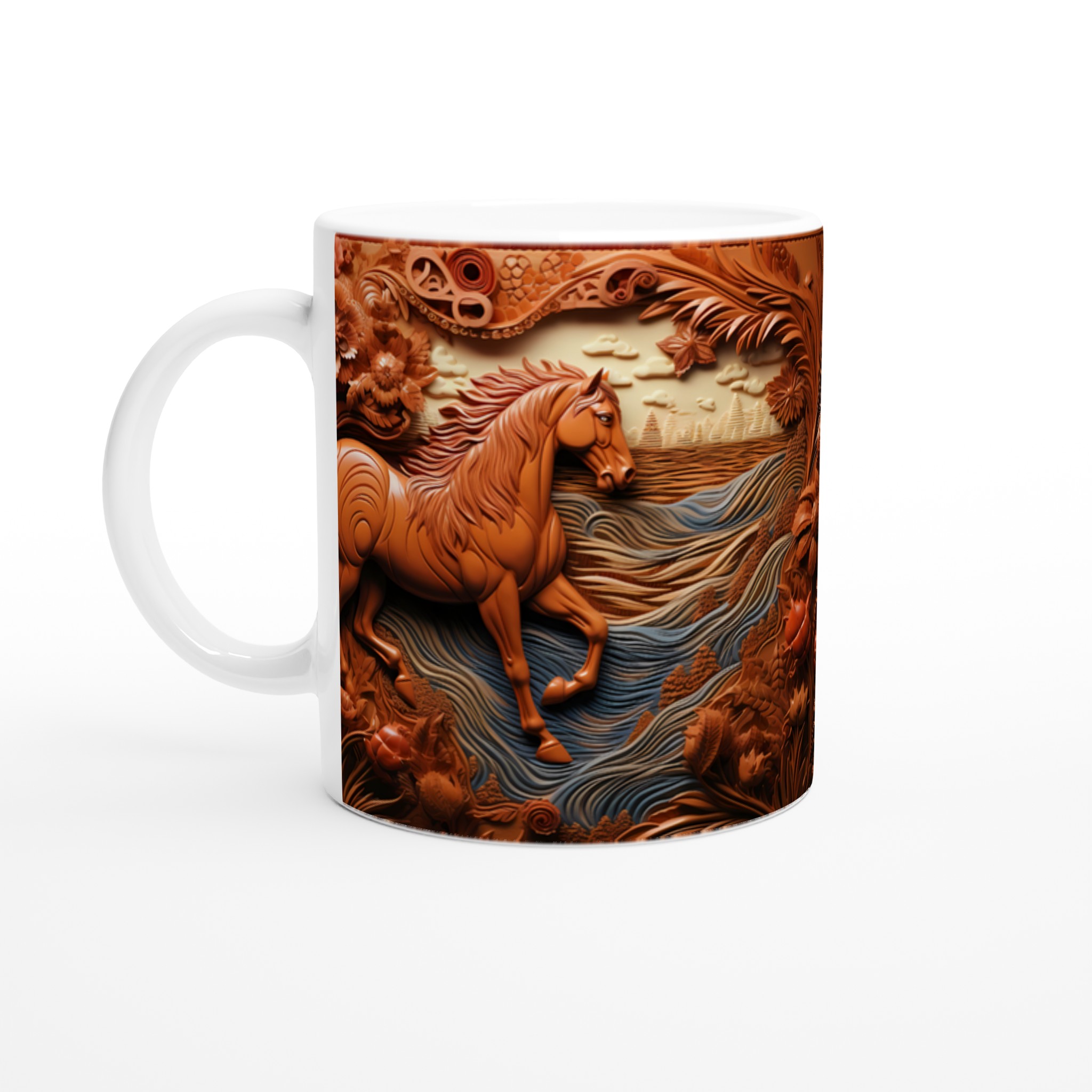 Låt dig inspireras av naturens skönhet och hästens majestät med denna unika keramiska mugg. Designen, som påminner om intrikata träsniderier med sin varma, jordnära färgpalett och detaljerade utförande, förvandlar din fikapaus till en stund av lugn reflektion. Perfekt för morgonkaffet, kvällens varma choklad eller när du bara vill njuta av en kopp te. Den blanka vita ytan ser till att trycken framhävs med klara och levande färger, som håller sig fina även efter många turer i mikron och diskmaskinen.