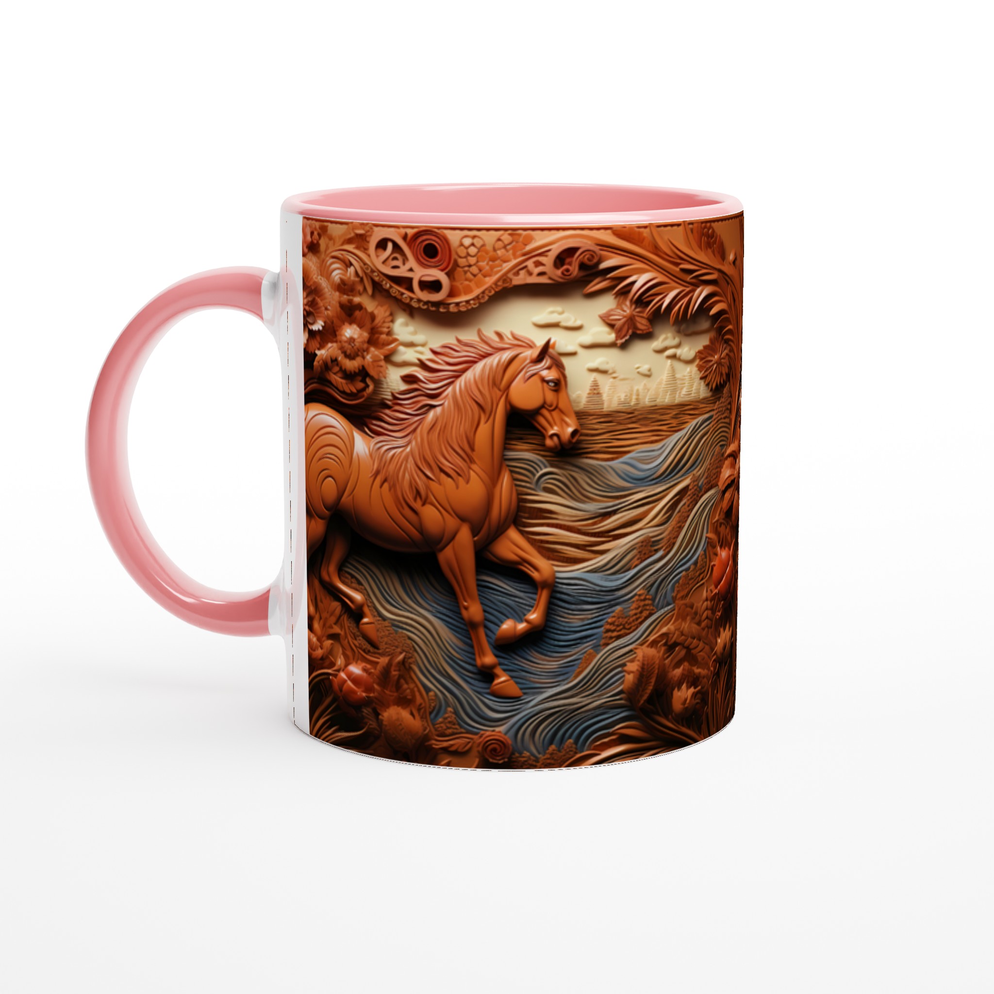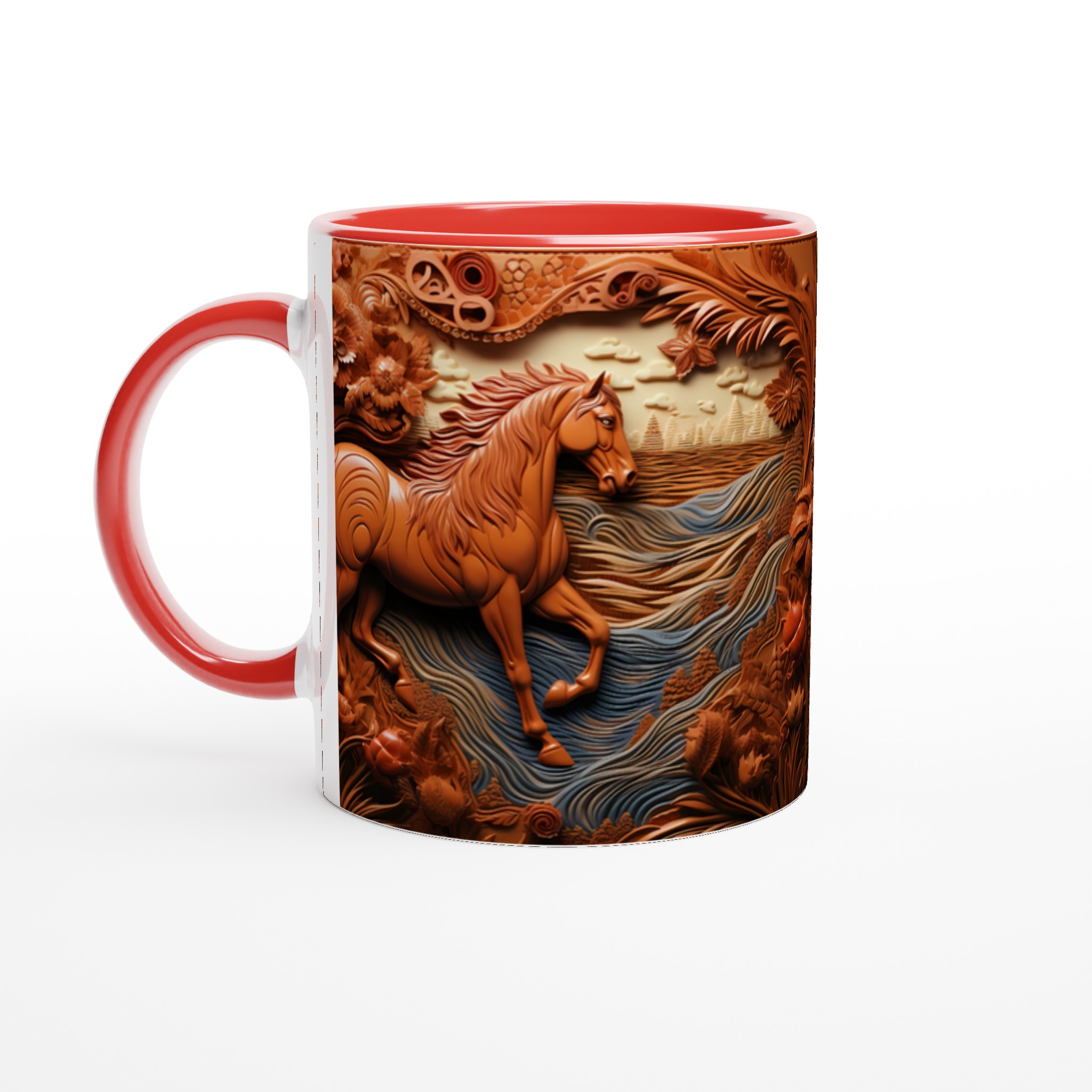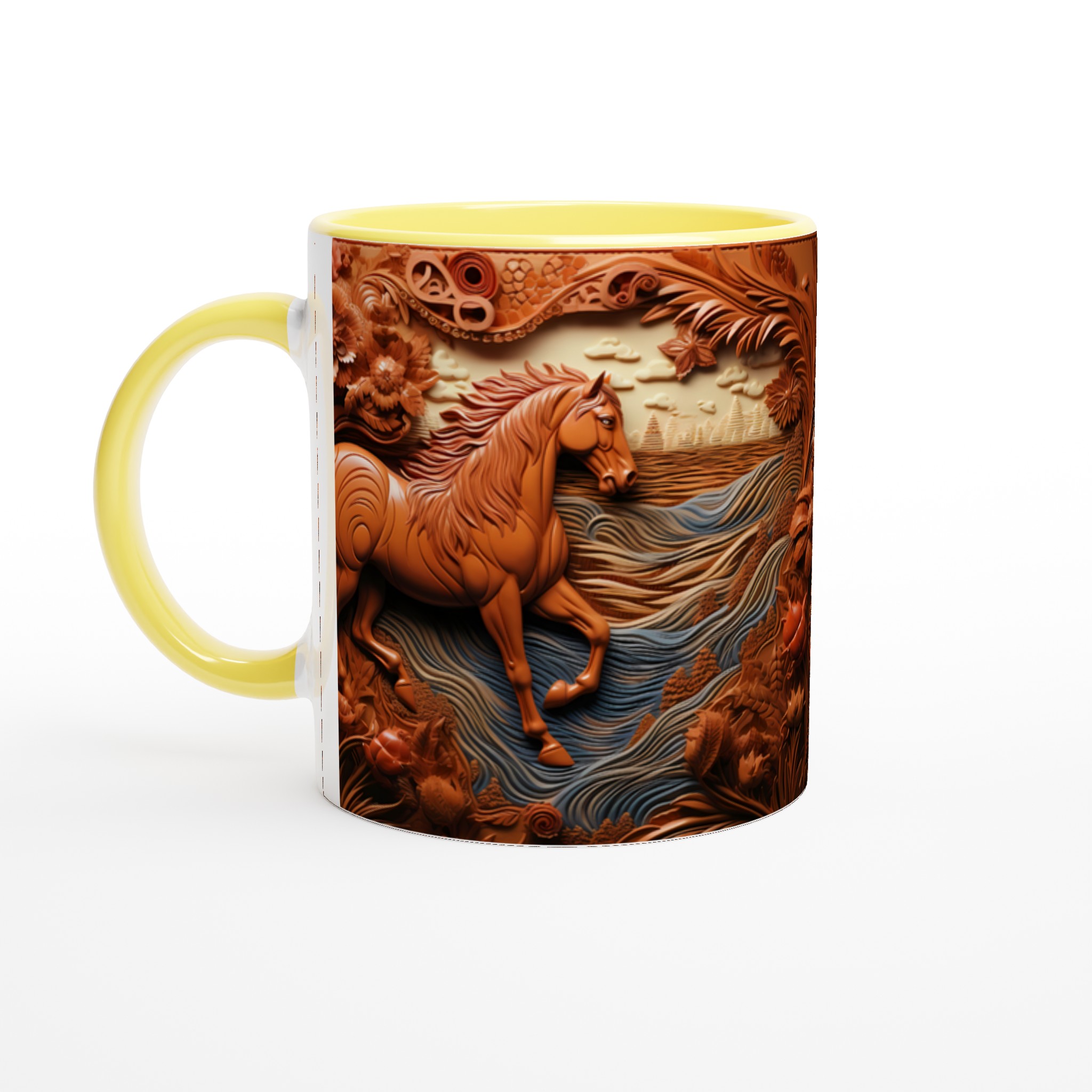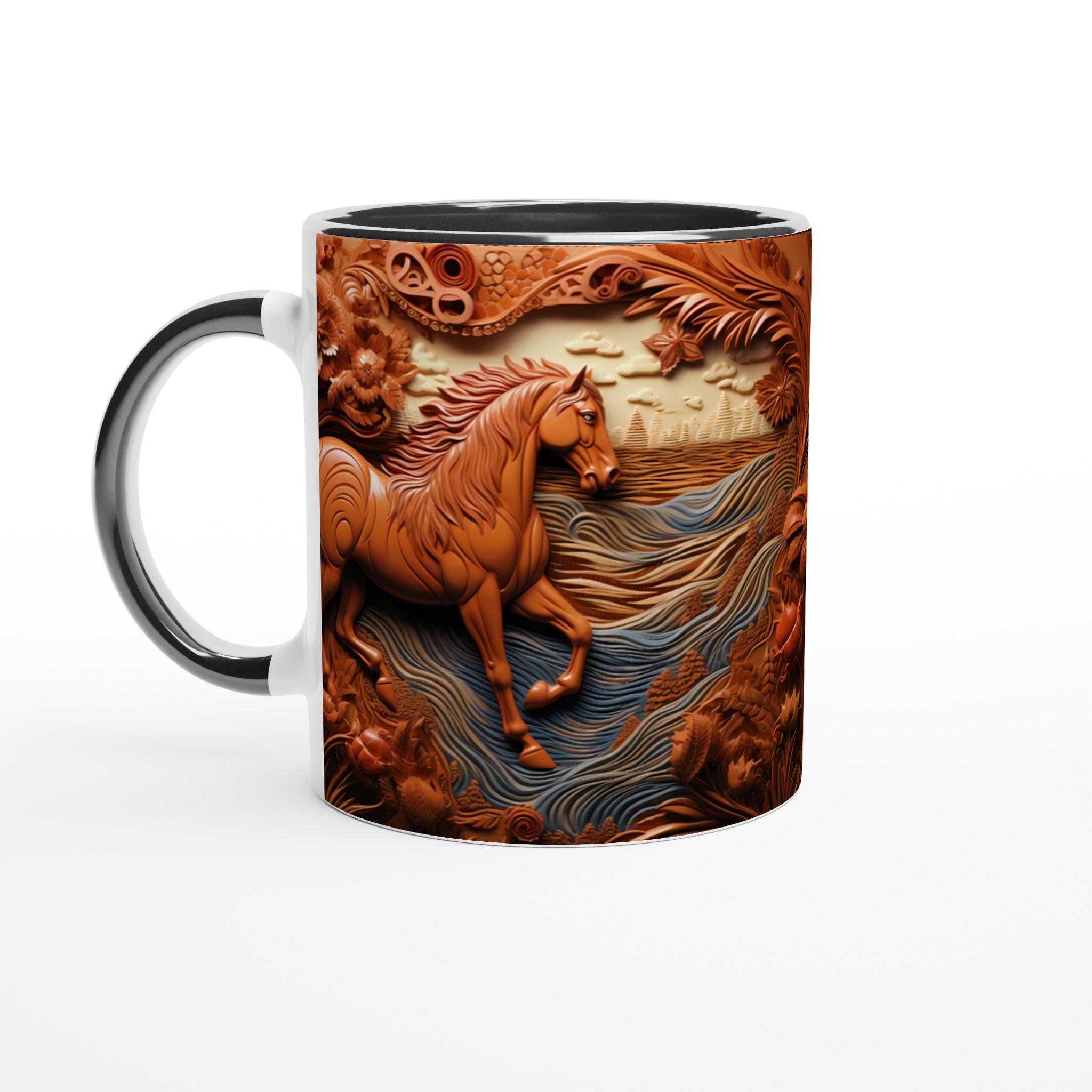 Låt dig inspireras av naturens skönhet och hästens majestät med denna unika keramiska mugg. Designen, som påminner om intrikata träsniderier med sin varma, jordnära färgpalett och detaljerade utförande, förvandlar din fikapaus till en stund av lugn reflektion. Perfekt för morgonkaffet, kvällens varma choklad eller när du bara vill njuta av en kopp te. Den blanka vita ytan ser till att trycken framhävs med klara och levande färger, som håller sig fina även efter många turer i mikron och diskmaskinen.