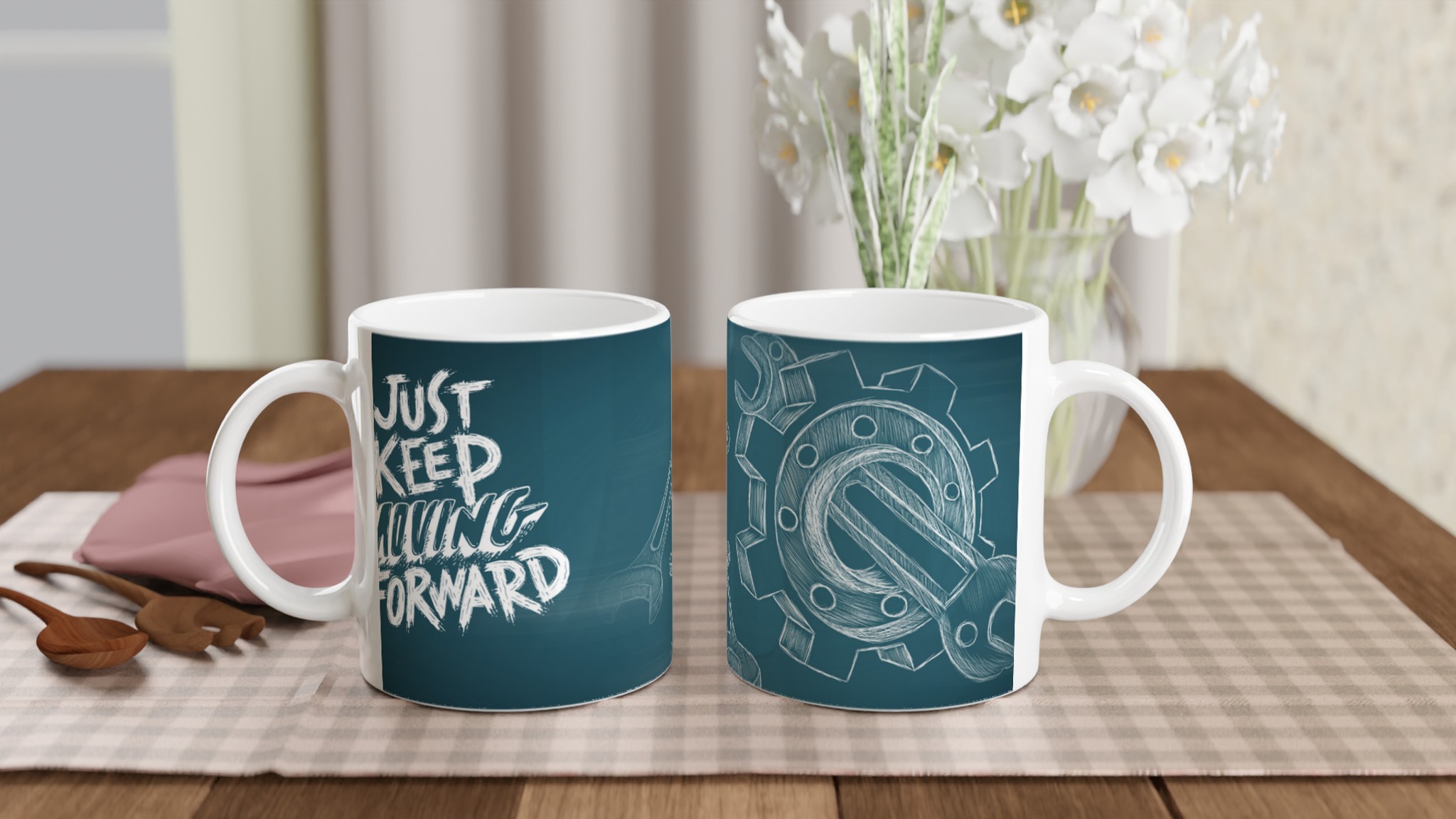 Låt varje klunk bli en påminnelse om att fortsätta framåt med vår ”Just Keep Moving Forward” keramikmugg. Denna mugg, prydd med ett inspirerande budskap och stiliserade verktyg, är den perfekta följeslagaren för att kickstarta din morgon eller ge dig en välbehövlig boost under dagen. Den blanka ytan framhäver det vita trycket med skärpa, redo att motivera dig genom livets alla utmaningar.