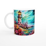 Låt dig förtrollas av denna unika keramiska mugg med ett livfullt motiv av en fyr under en magisk solnedgång. Färgerna är inspirerade av ”alcohol ink”-konst, med flödande lila, rosa, blå och turkosa toner som skapar en drömsk himmel över den majestätiska fyren. De frodiga blomsterfälten i förgrunden tillför en extra dimension av skönhet och liv.