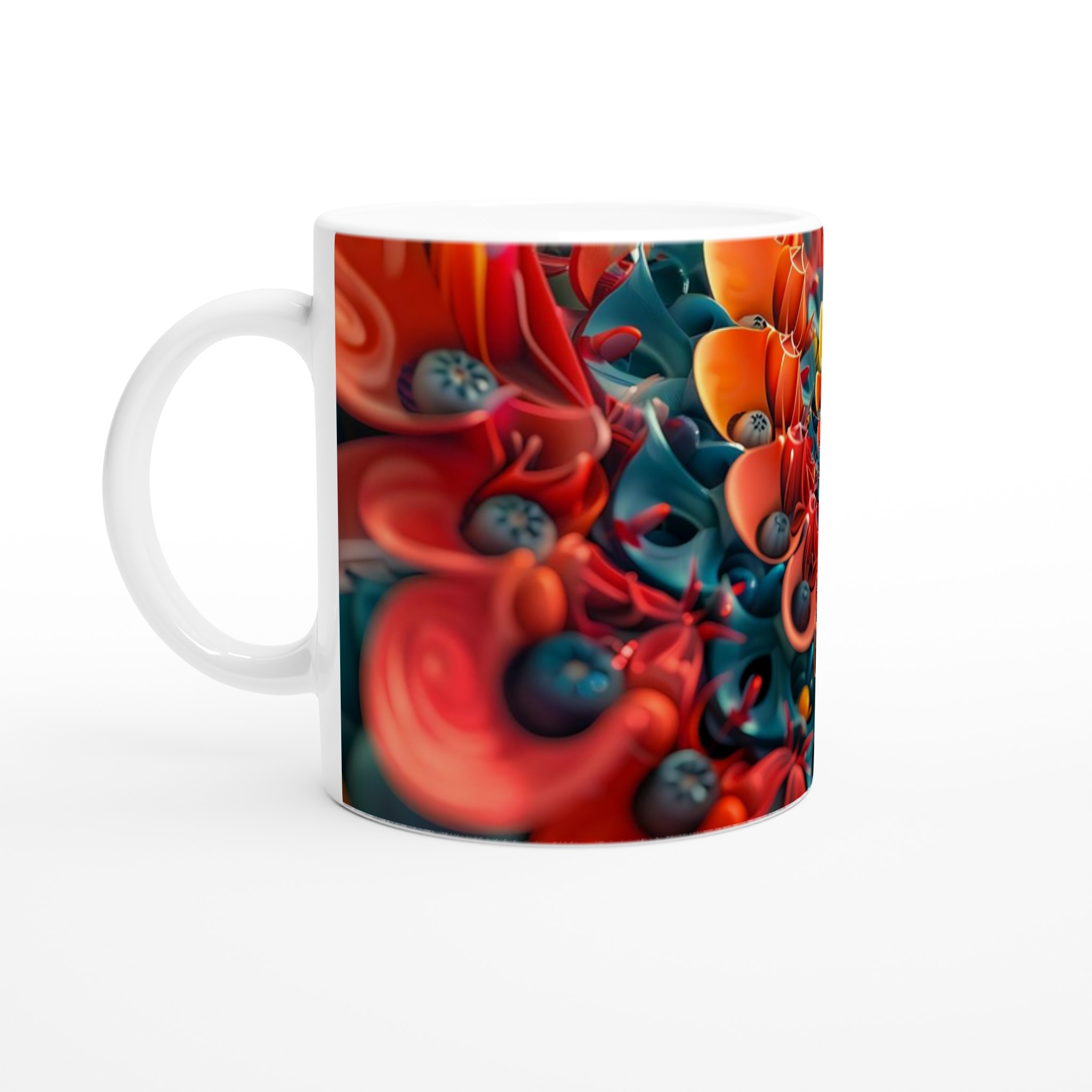 Vakna till liv med varje klunk ur denna färgsprakande keramikmugg! Inspirerad av en dynamisk, abstrakt design som leker med varma orangea, djupa turkosa och livfulla röda toner, är denna mugg mer än bara ett kärl för din dryck – den är ett konstverk. Den fångar energin från en spirande sommaräng eller en pulserande undervattensvärld, och varje detalj lockar ögat med sin unika form och livfulla färgpalett. Perfekt för att addera en dos glädje och inspiration till din morgonkaffe, eftermiddagste eller en mysig kväll med varm choklad.