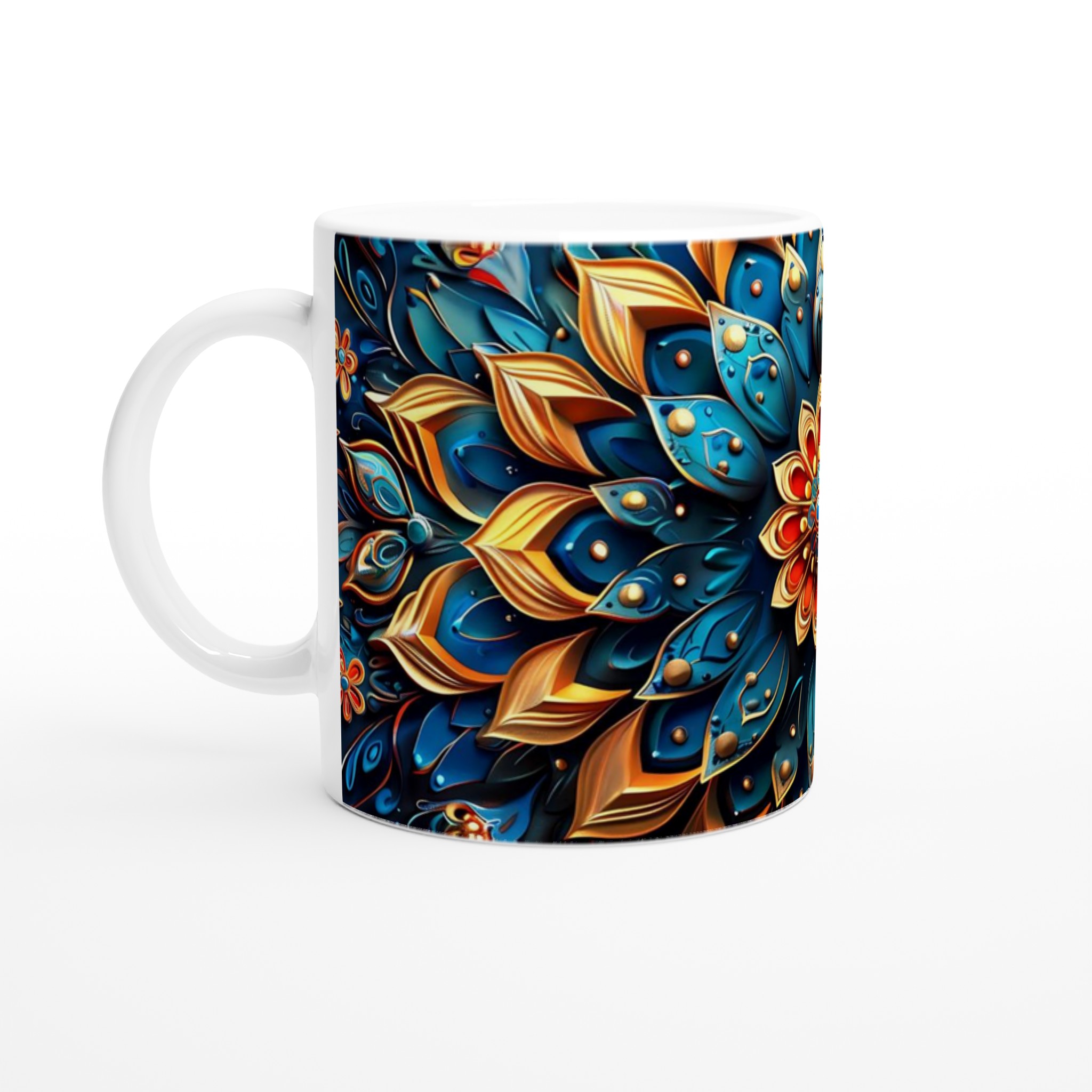 Lyft din fikapaus med denna iögonfallande keramikmugg som presenterar ett fascinerande ”Mandala Blom”-motiv. Dess djupa koboltblå och strålande guldtoner skapar en hypnotisk effekt, framhävd av vibrerande orange detaljer som fångar blicken. Denna stilrena och vackra keramikmugg är perfekt för alla dagens stunder – morgonkaffet, en värmande kopp te eller en härlig varm choklad. Den blanka vita ytan gör att trycken framträder klart och färgstarkt, vilket gör muggen till en riktig favorit i vardagen.