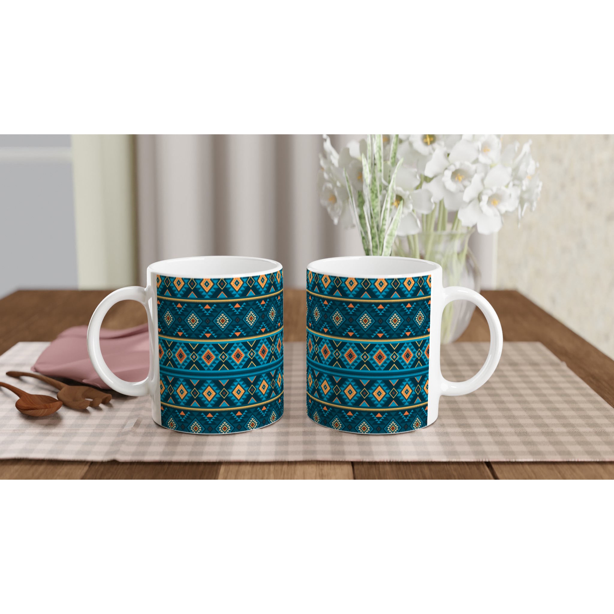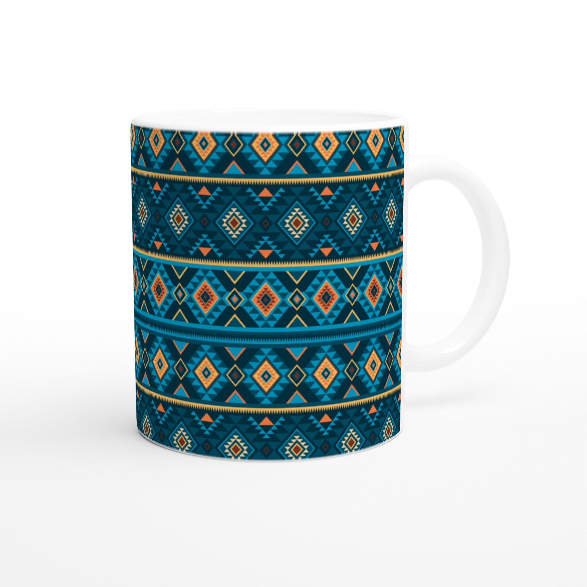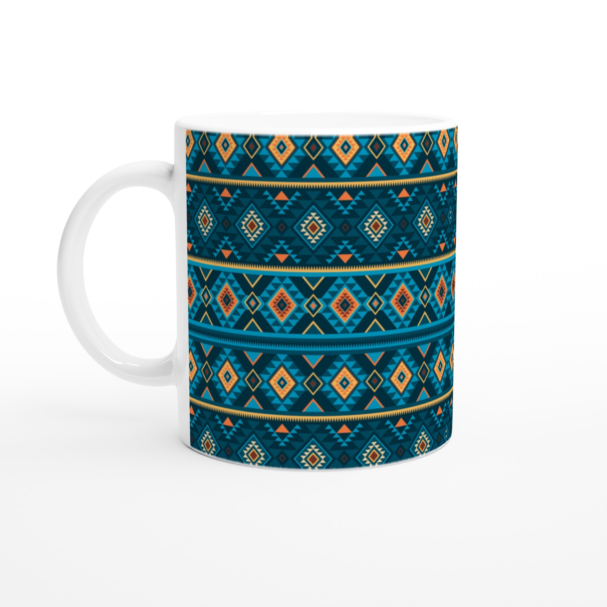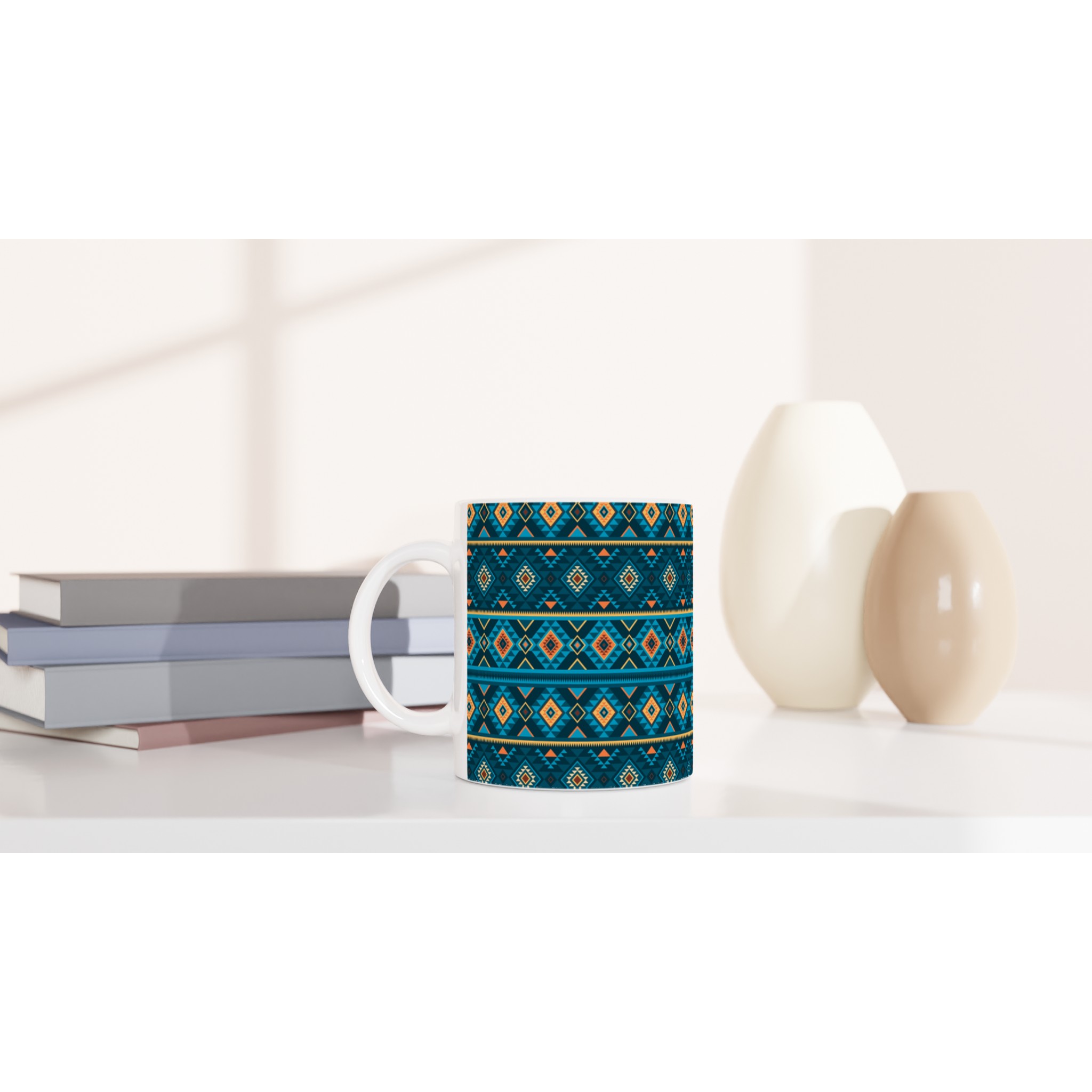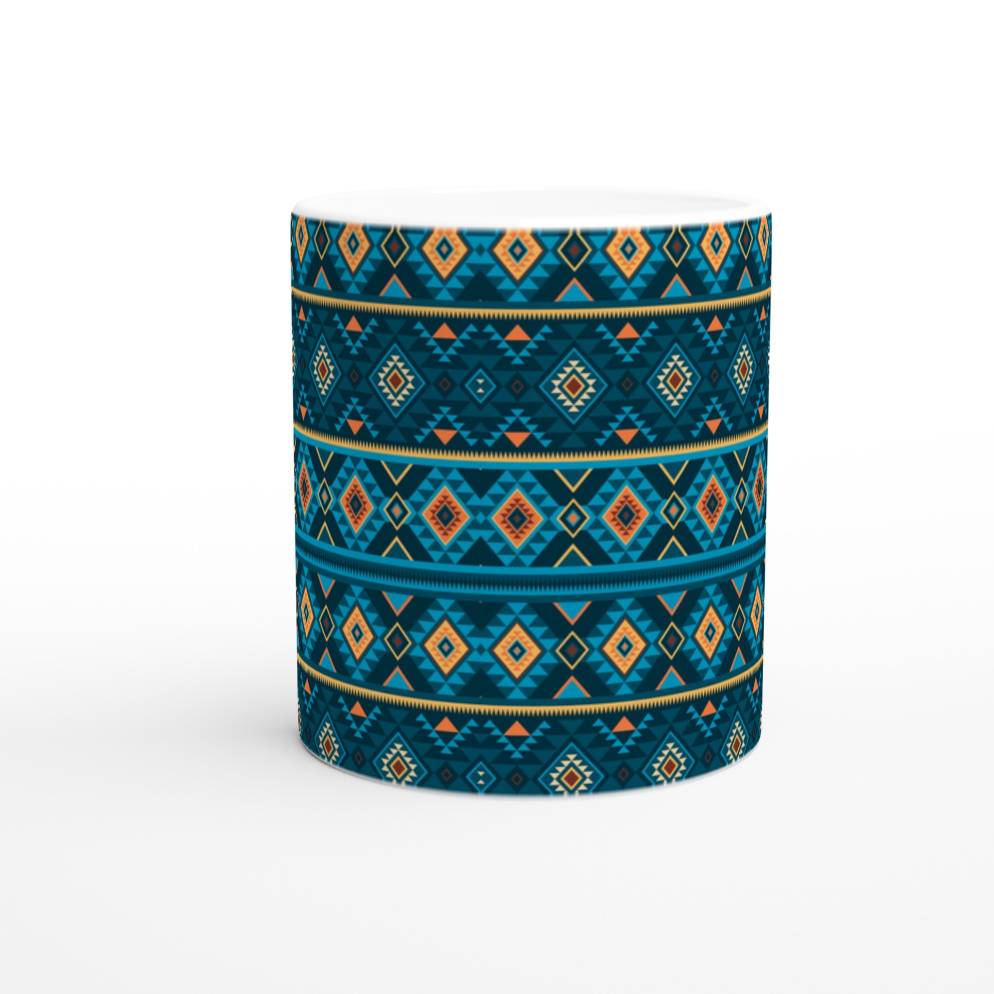 Lyft din fikastund med denna färgstarka keramikmugg, prydd med ett intrikat aztekiskt mönster i blåa, turkosa och jordnära orange toner. Denna mugg är en hyllning till tidlös design och kulturell rikedom, perfekt för att ge en touch av karaktär till din morgonrutin eller eftermiddagspaus. Varje detalj i mönstret framträder levande och bjuder in till en stunds avkoppling med din favoritdryck.