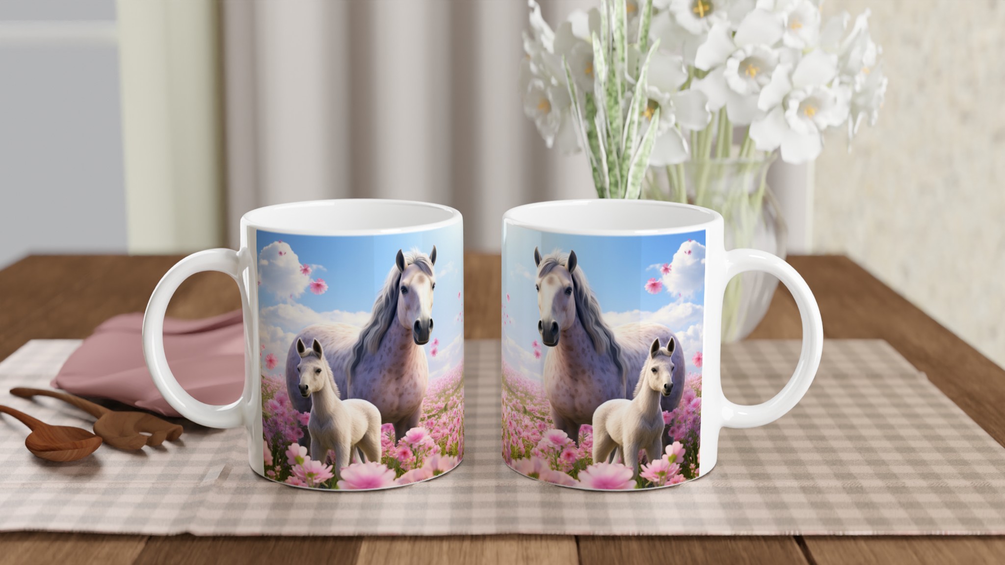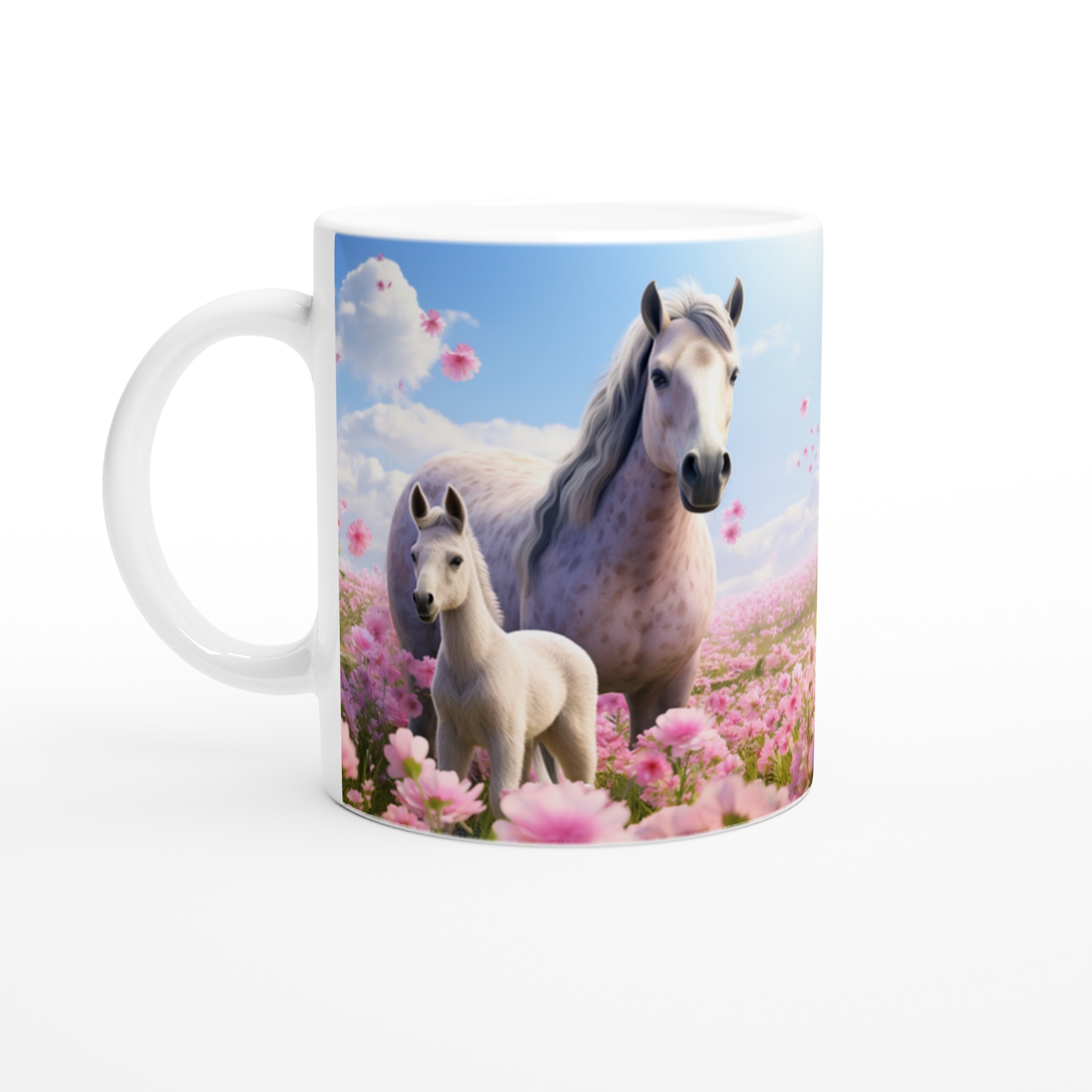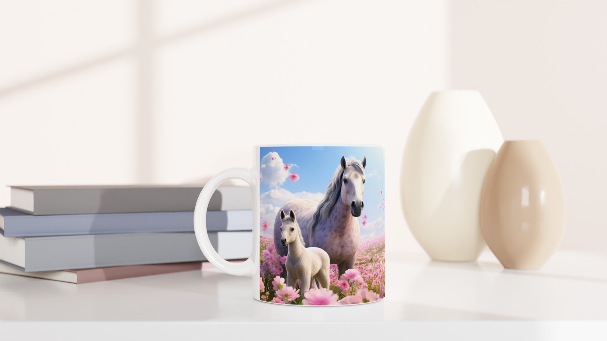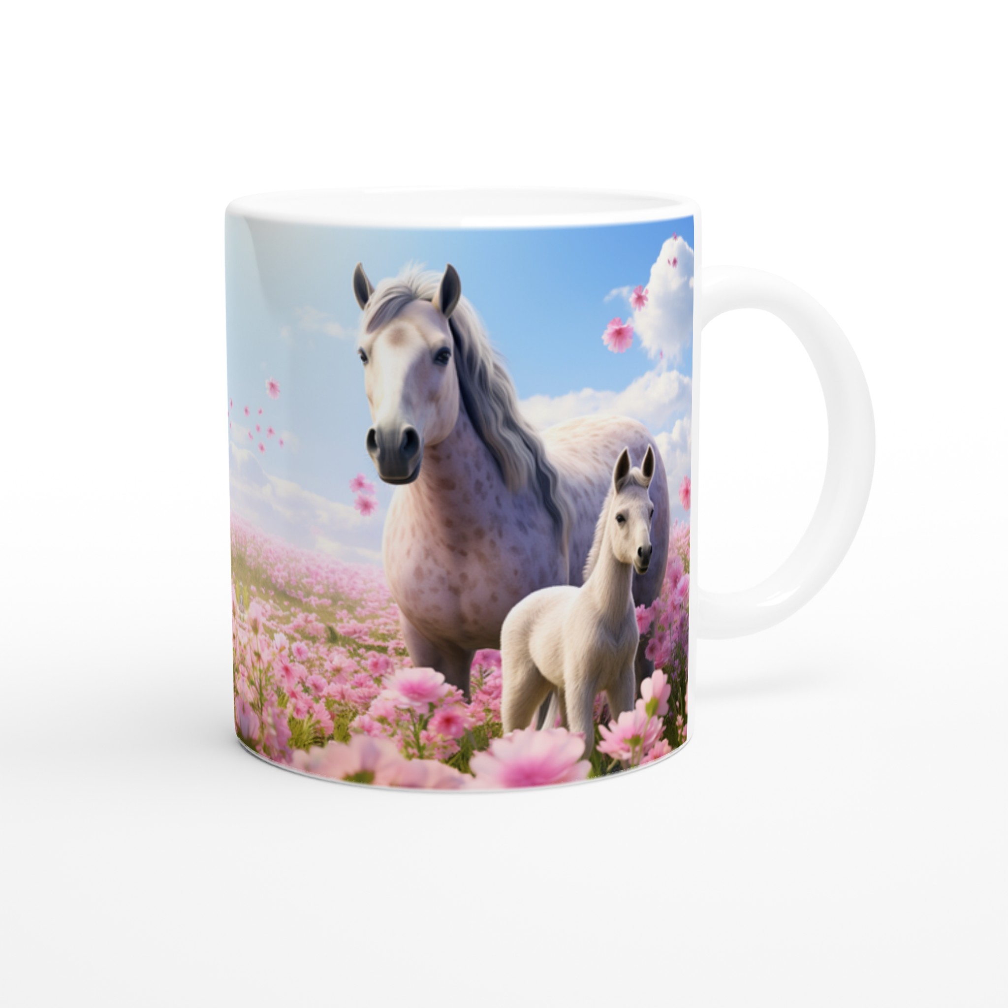 Föreställ dig att vakna upp till en idyllisk blomsteräng, omgiven av graciösa hästar och fallande rosa blomblad. Med den här stilrena keramiska muggen kan du drömma dig bort till den rofyllda scenen varje dag. Den blir snabbt en vardagsfavorit, perfekt för morgonkaffet, kvällens varma choklad, eller när du bara vill njuta av en kopp te i lugn och ro. Den blanka ytan framhäver det vackra motivet med klara och levande färger, som håller sig fina även efter många turer i mikron och diskmaskinen.