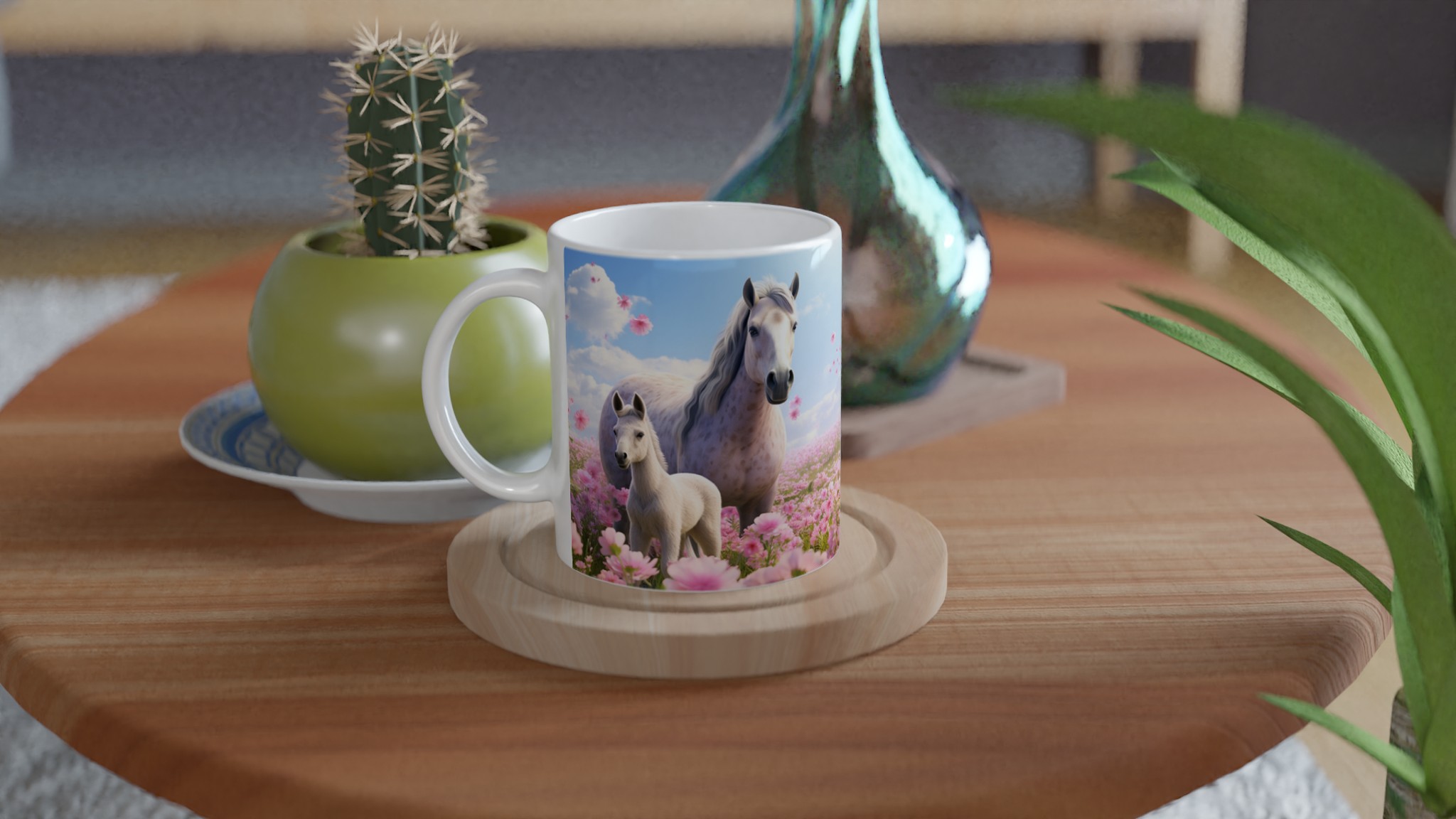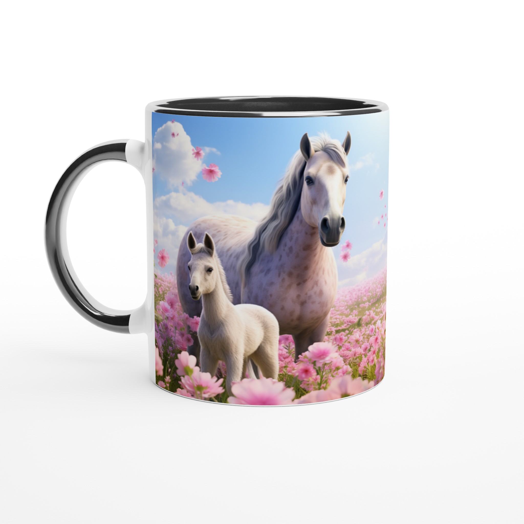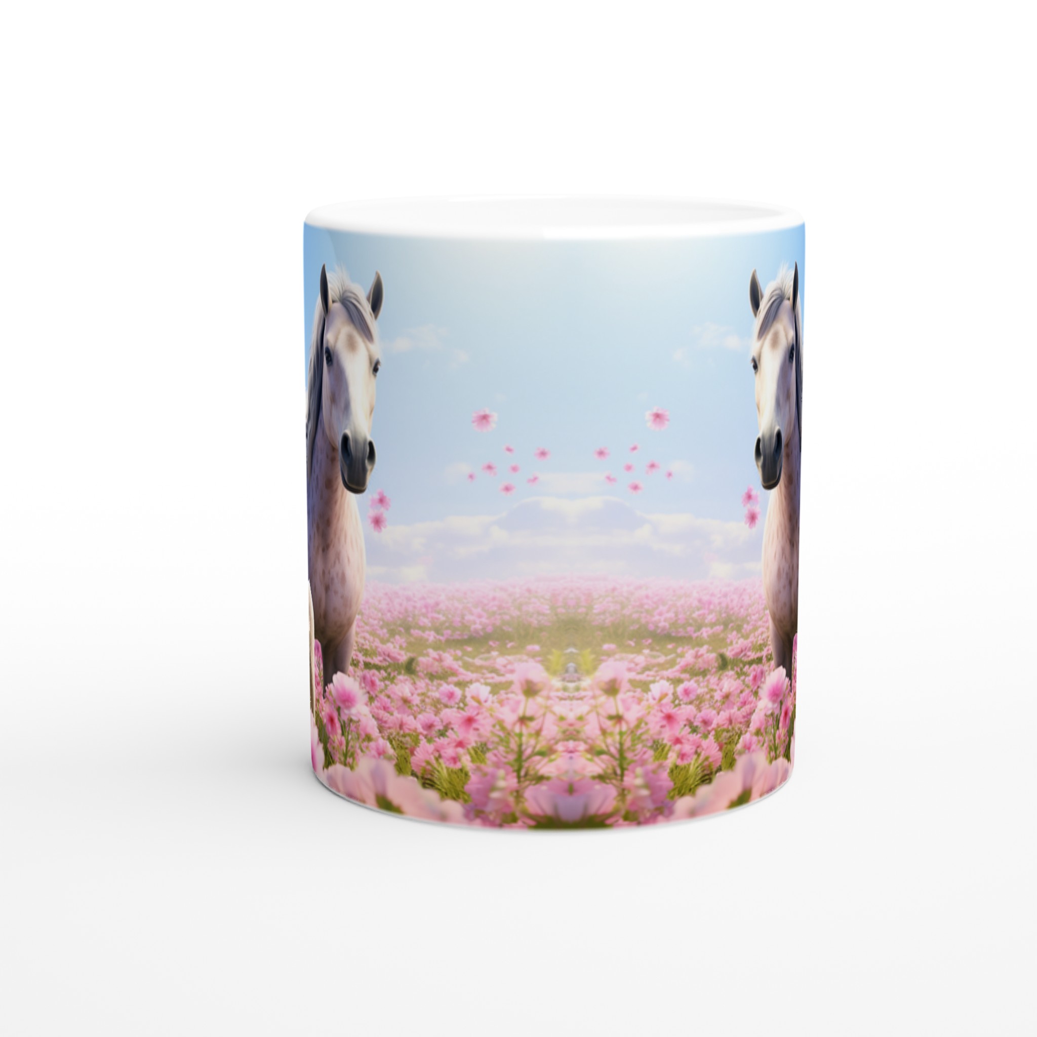 Föreställ dig att vakna upp till en idyllisk blomsteräng, omgiven av graciösa hästar och fallande rosa blomblad. Med den här stilrena keramiska muggen kan du drömma dig bort till den rofyllda scenen varje dag. Den blir snabbt en vardagsfavorit, perfekt för morgonkaffet, kvällens varma choklad, eller när du bara vill njuta av en kopp te i lugn och ro. Den blanka ytan framhäver det vackra motivet med klara och levande färger, som håller sig fina även efter många turer i mikron och diskmaskinen.