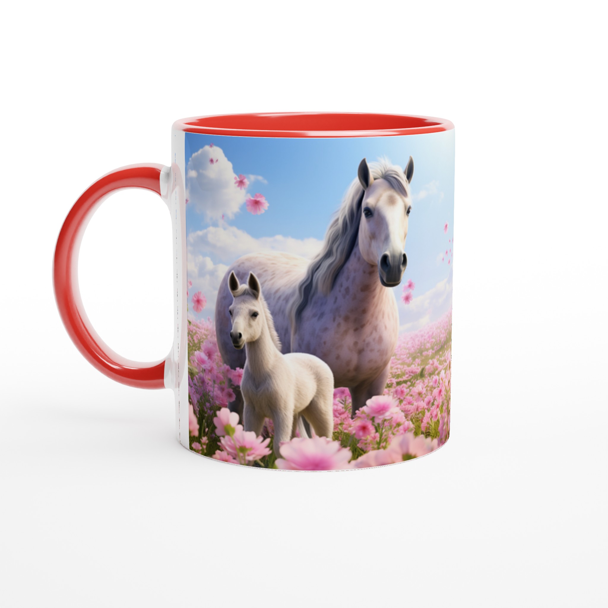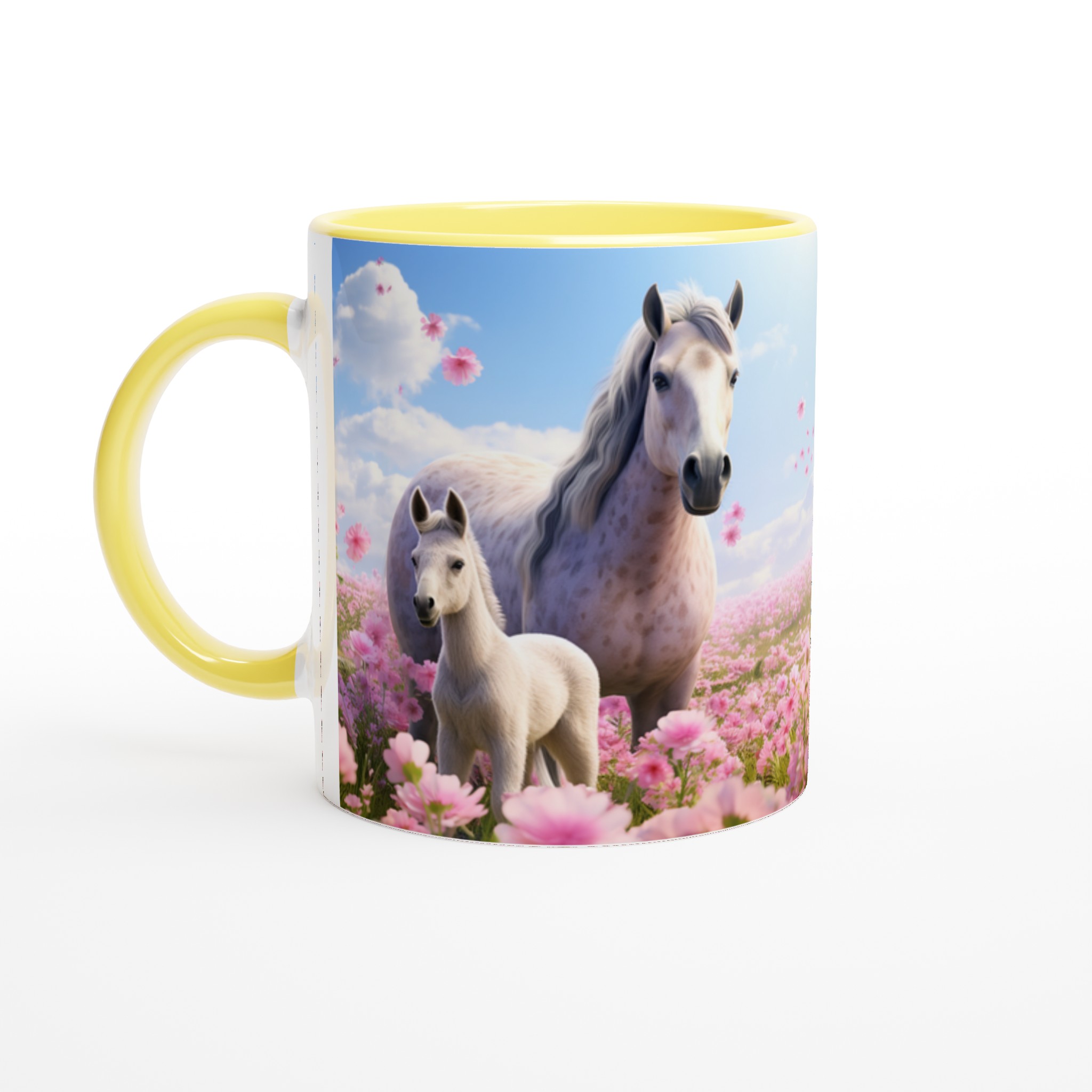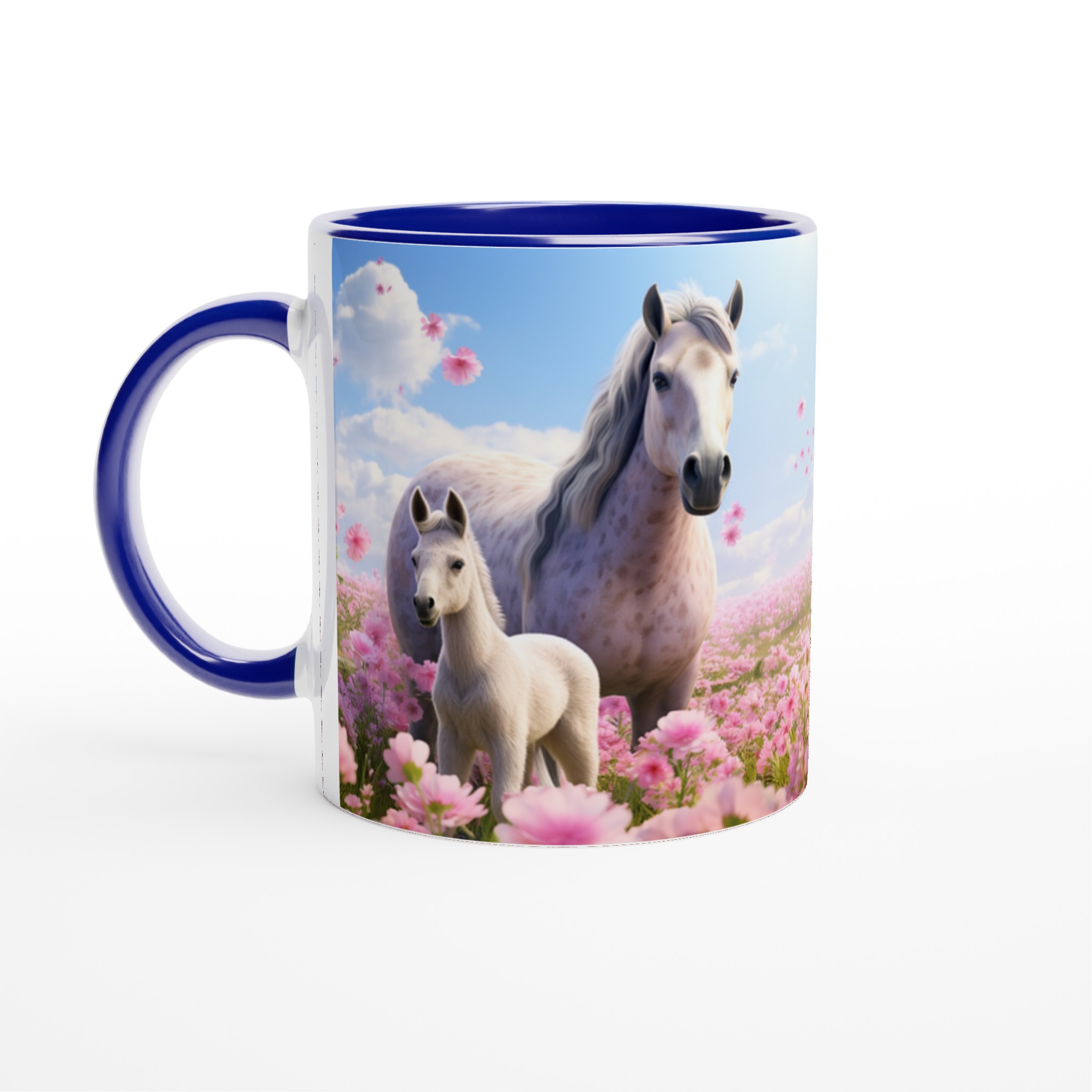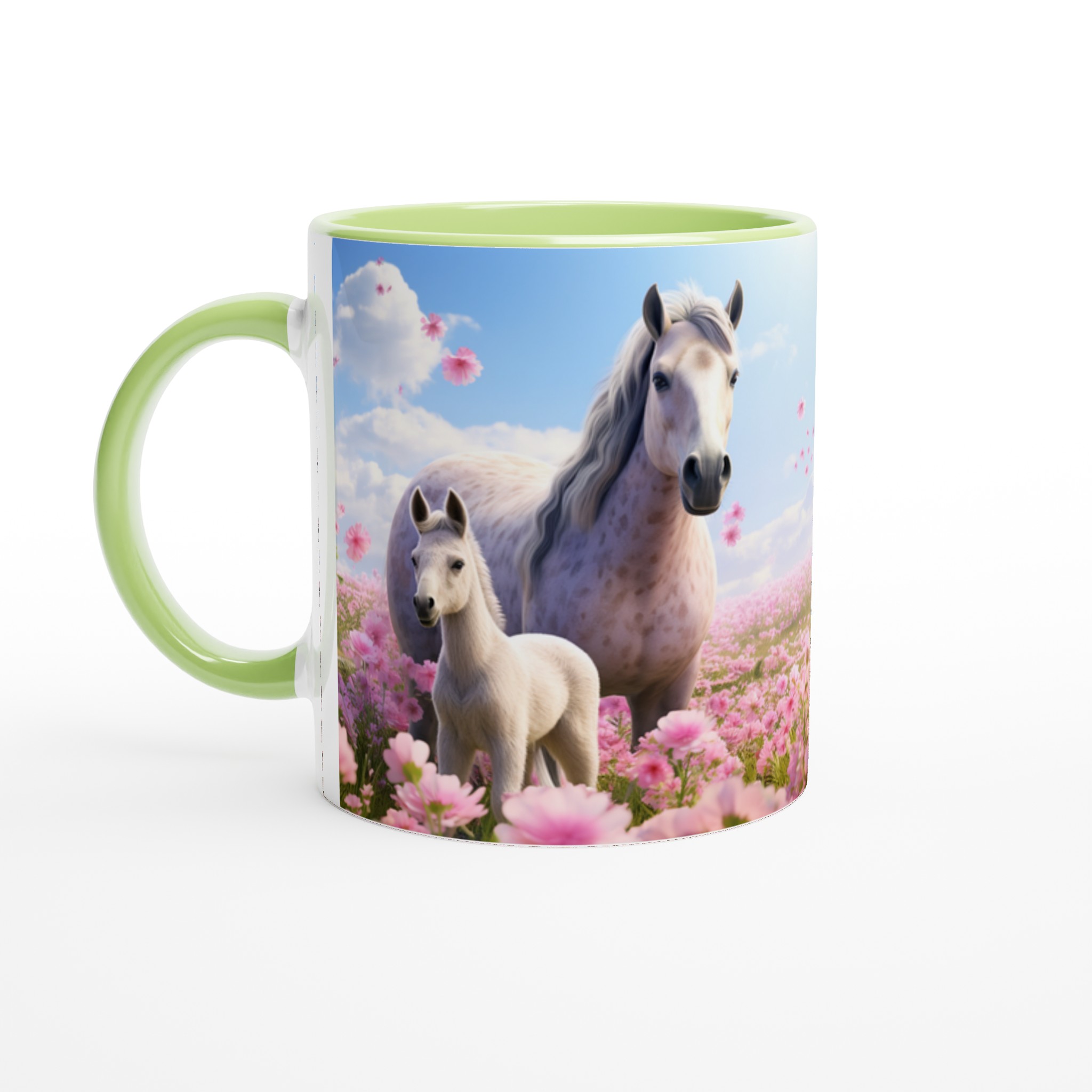 Föreställ dig att vakna upp till en idyllisk blomsteräng, omgiven av graciösa hästar och fallande rosa blomblad. Med den här stilrena keramiska muggen kan du drömma dig bort till den rofyllda scenen varje dag. Den blir snabbt en vardagsfavorit, perfekt för morgonkaffet, kvällens varma choklad, eller när du bara vill njuta av en kopp te i lugn och ro. Den blanka ytan framhäver det vackra motivet med klara och levande färger, som håller sig fina även efter många turer i mikron och diskmaskinen.