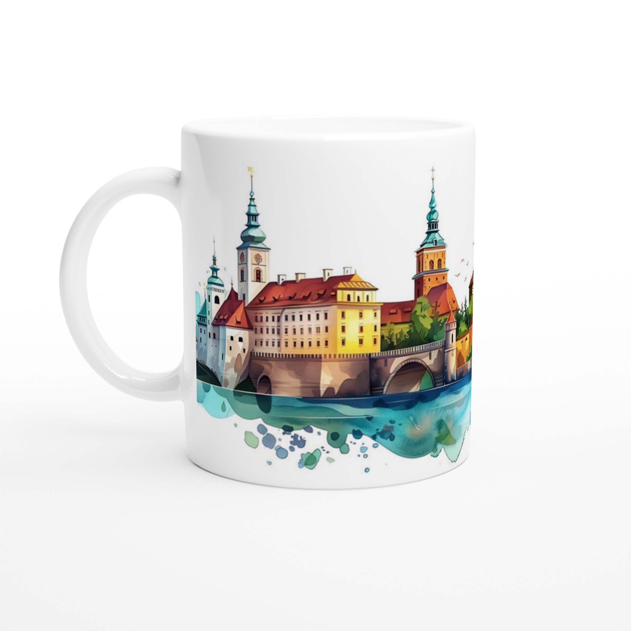 Mugg med medeltida stadsmotiv i akvarell – 11oz keramikmugg i ditt val av 7 färger