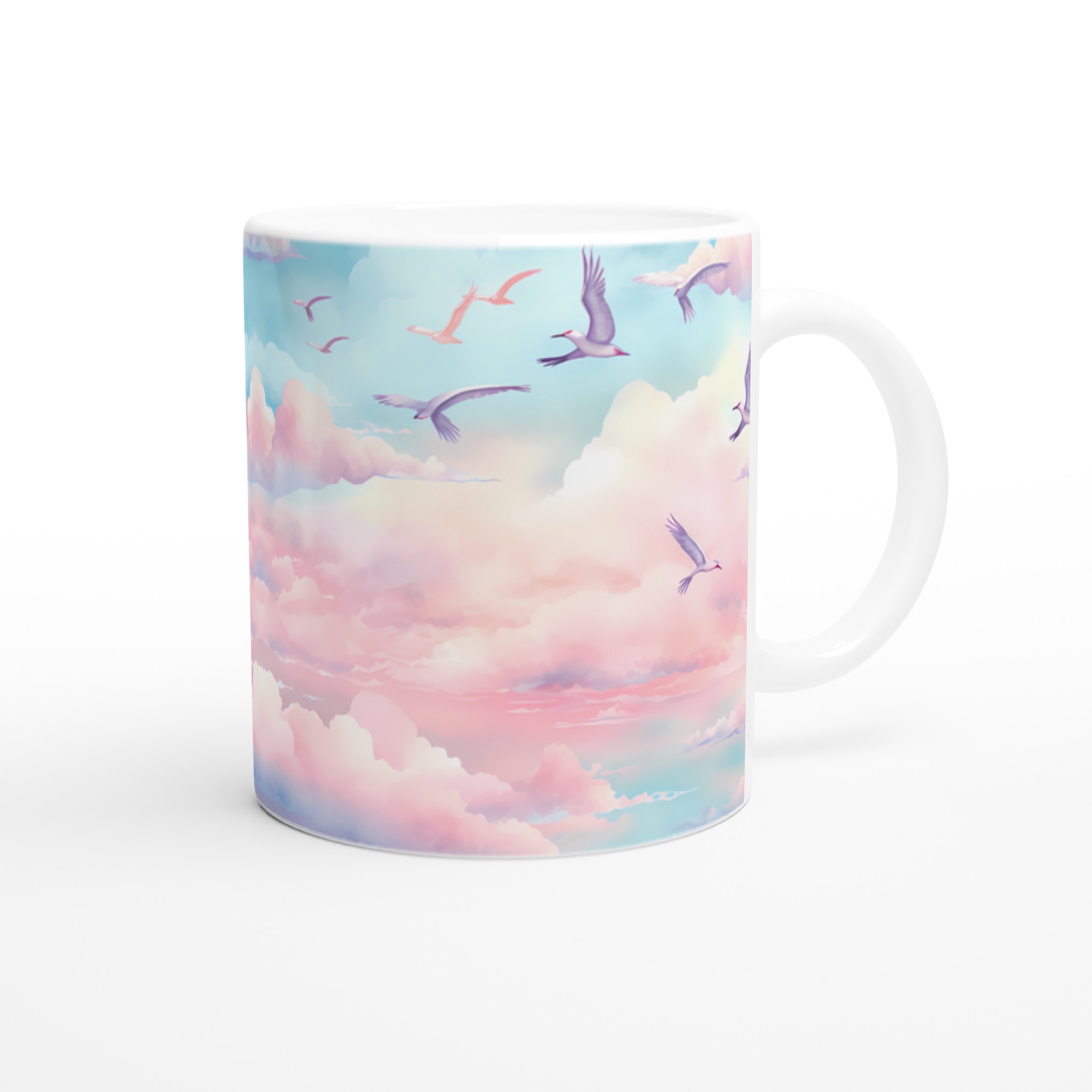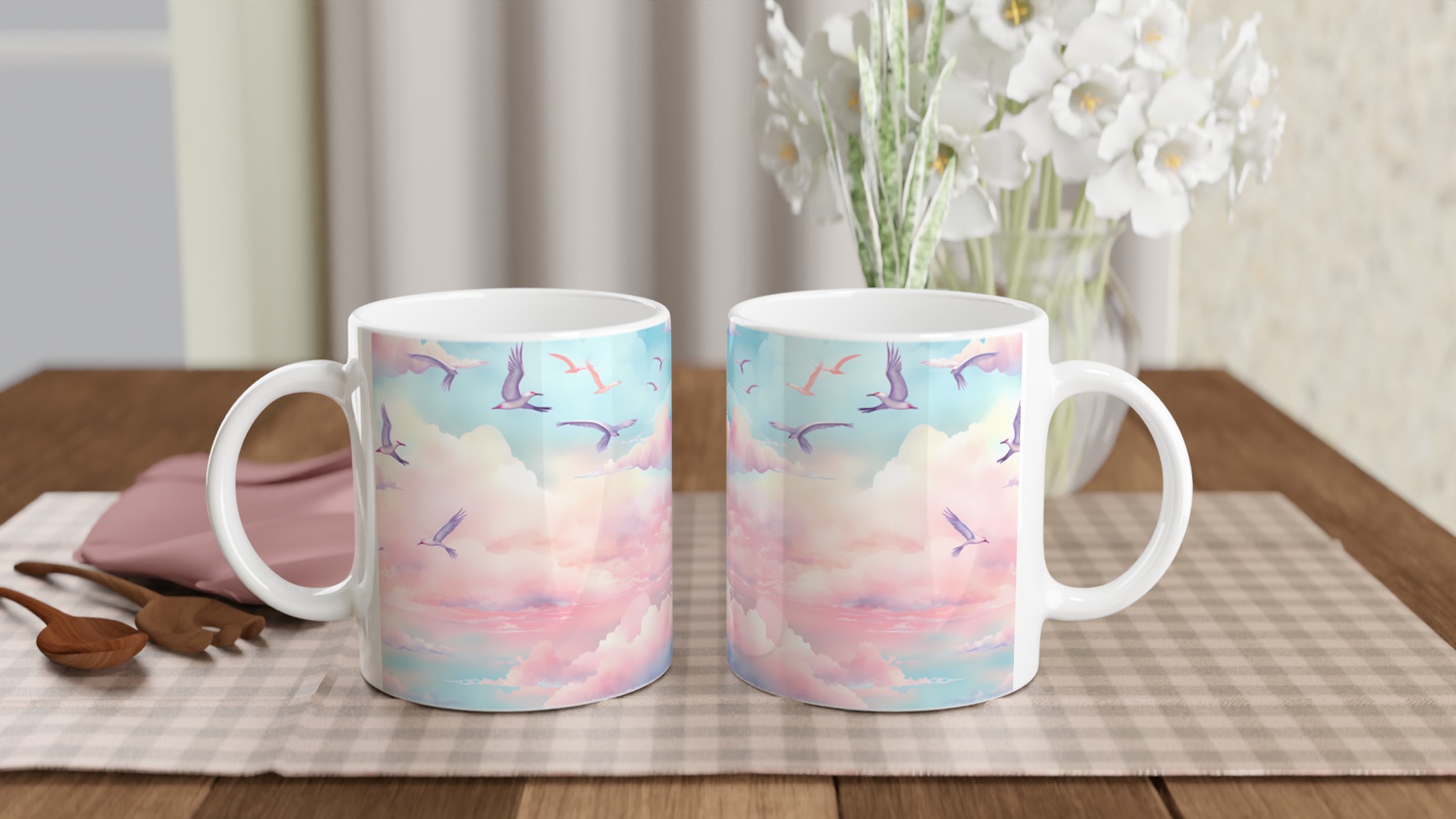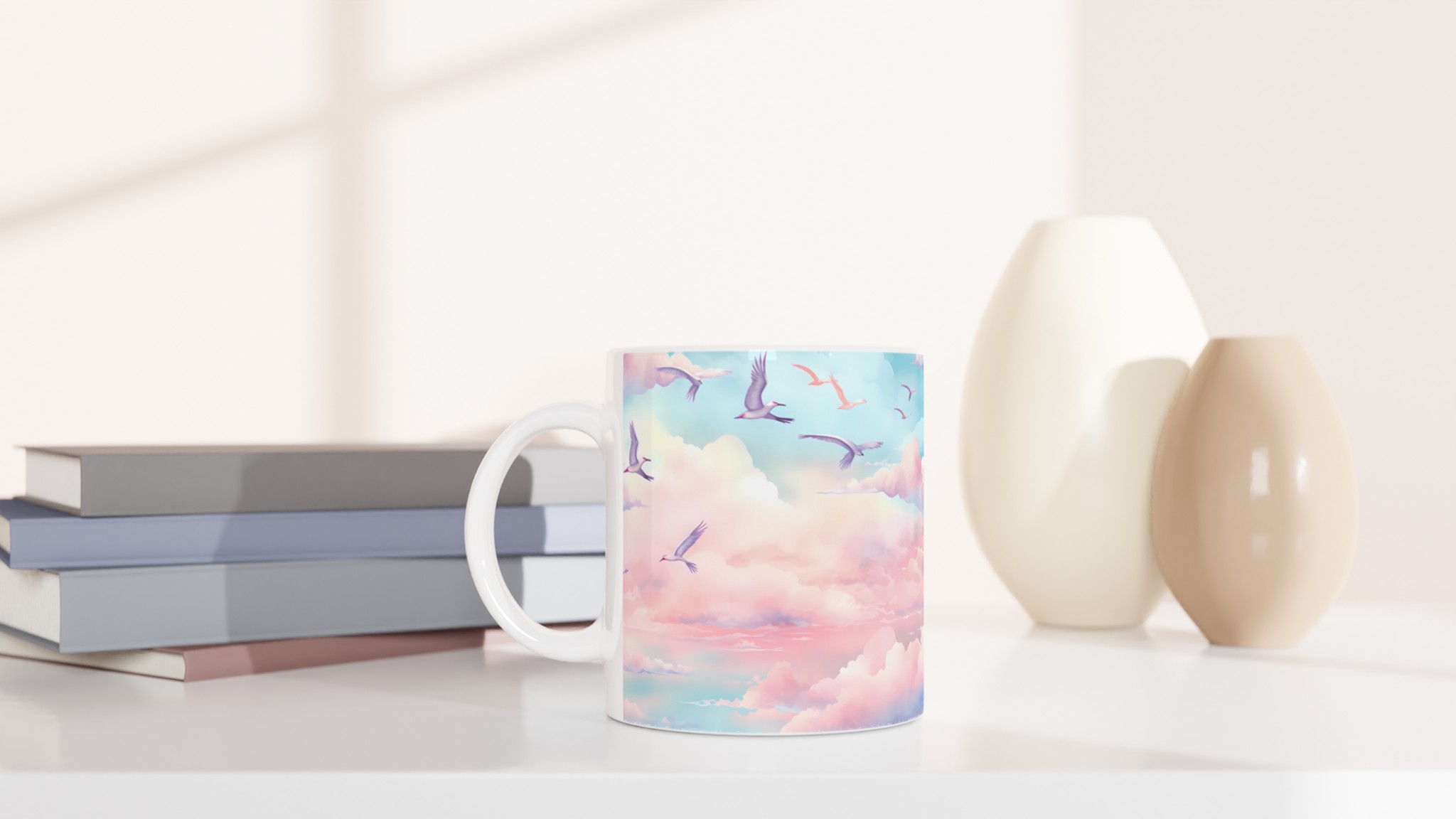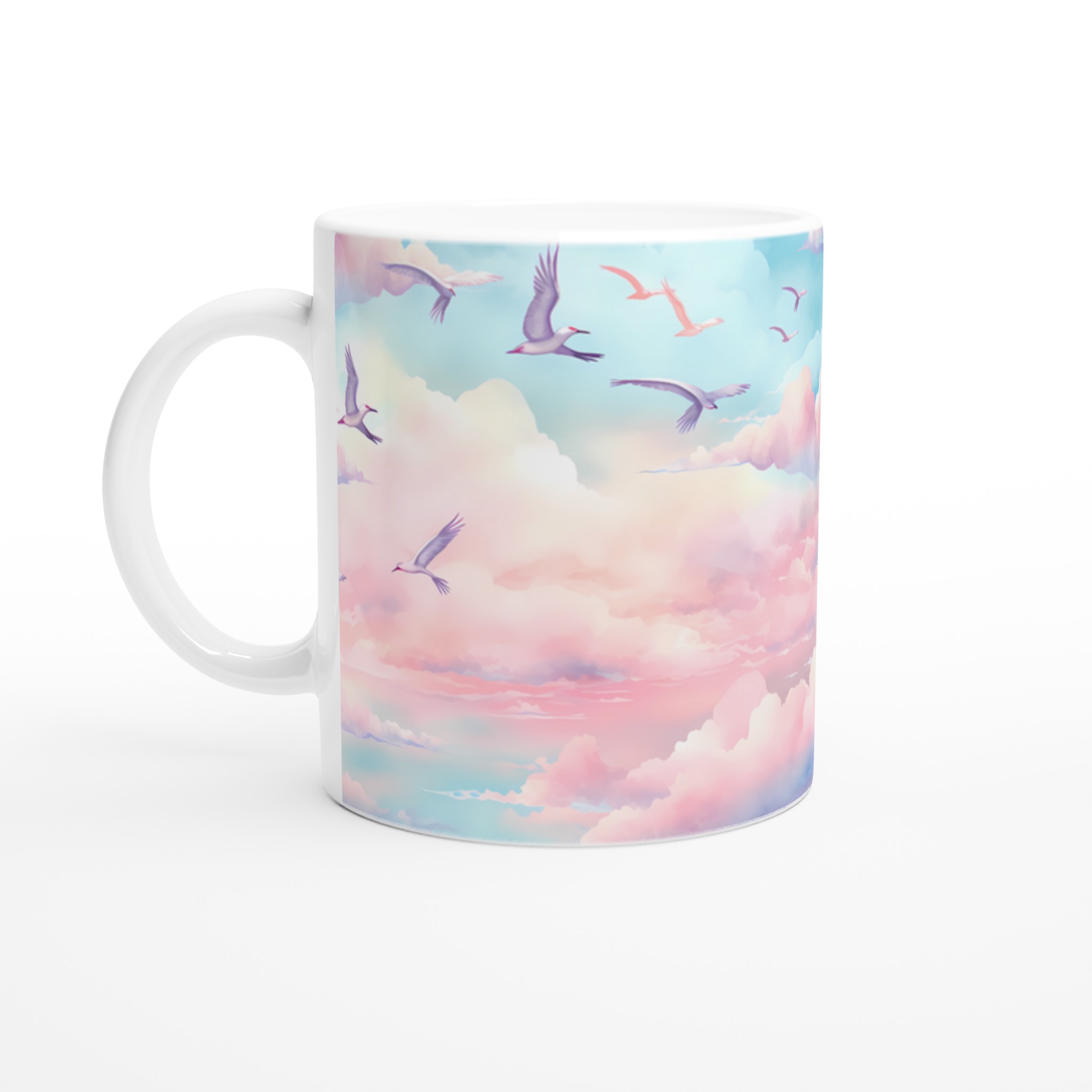 Fånga känslan av en drömlik soluppgång varje dag med denna förtrollande keramiska mugg. Dess design, inspirerad av en pastellfärgad himmel fylld med svävande tranor, skapar en lugn och inbjudande atmosfär för dina fikastunder. Denna stilrena mugg blir snabbt en vardagsfavorit, perfekt för morgonkaffet, kvällens varma choklad, eller när du bara vill njuta av en kopp te i lugn och ro.