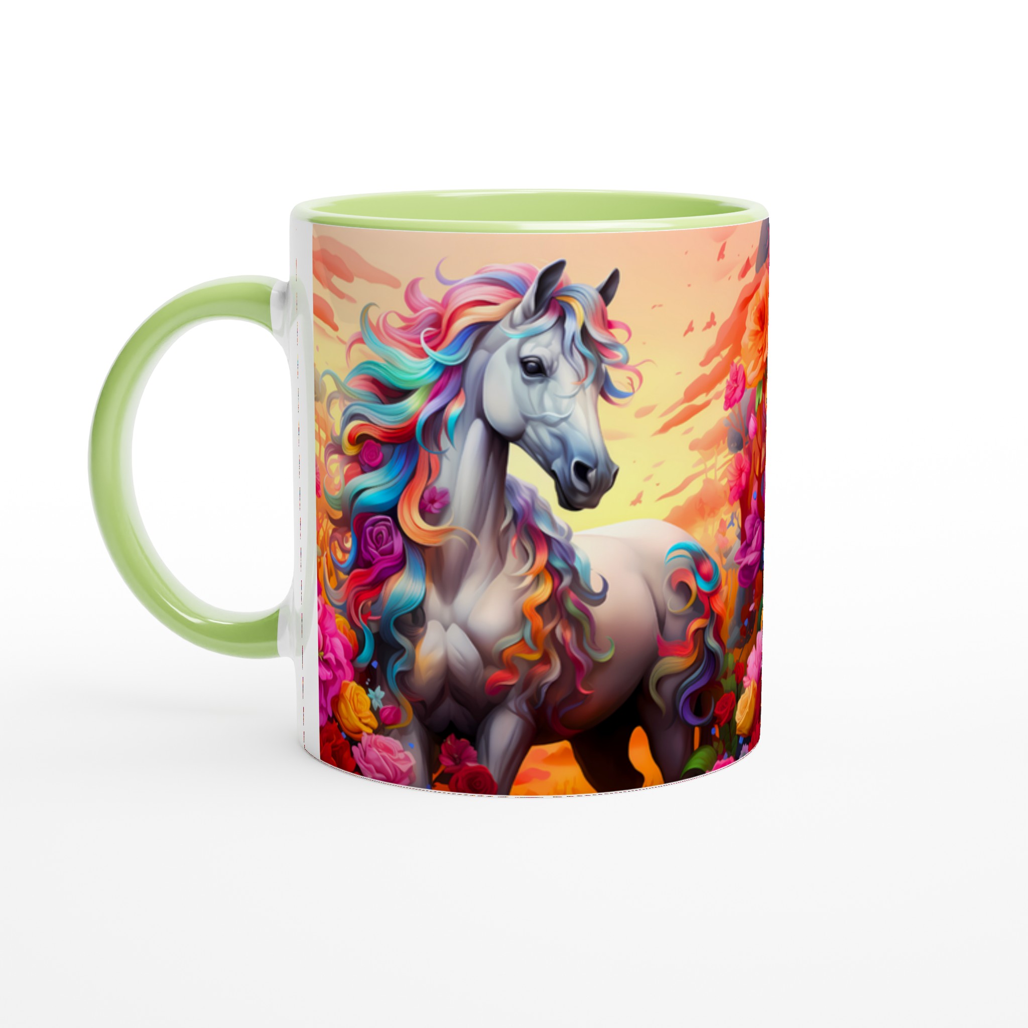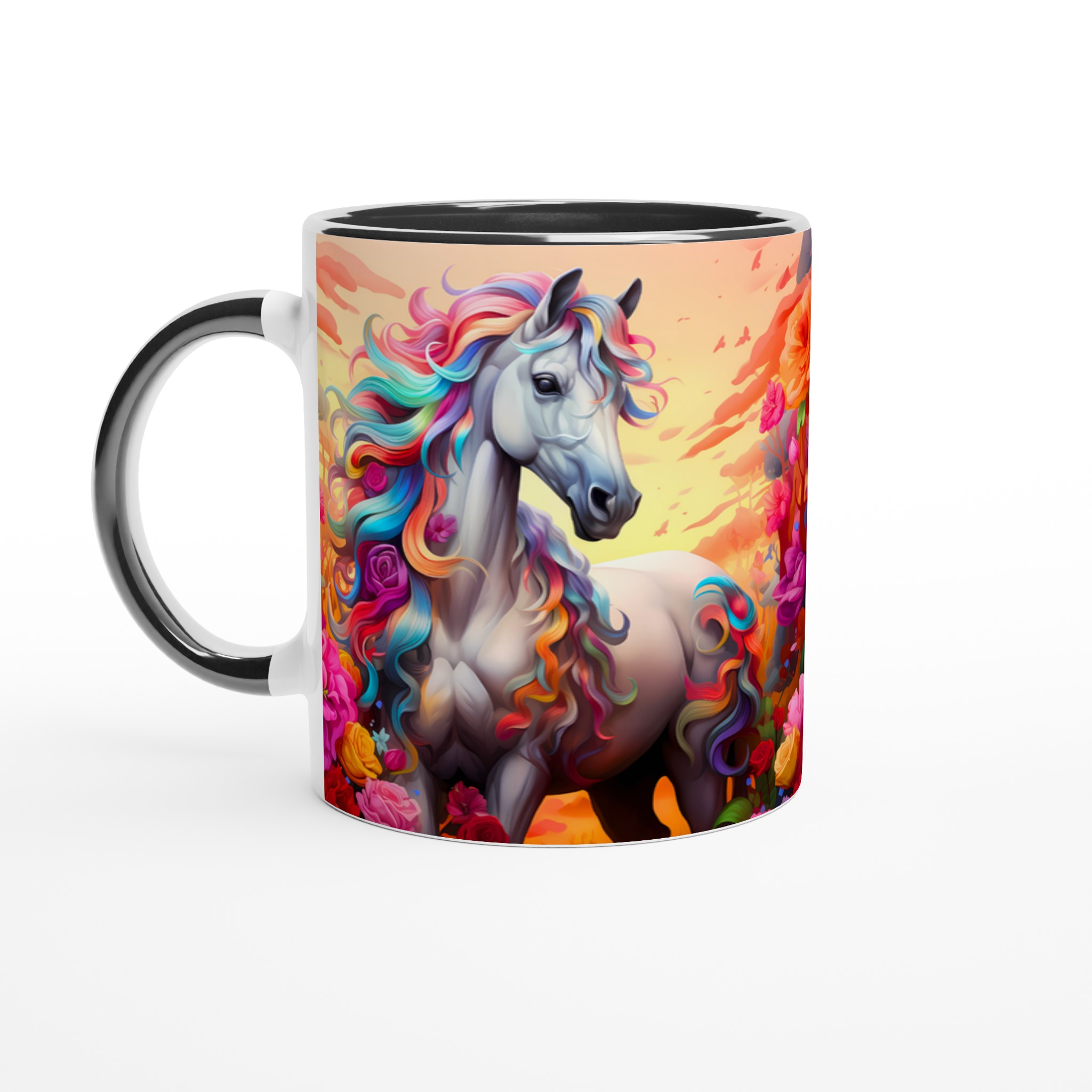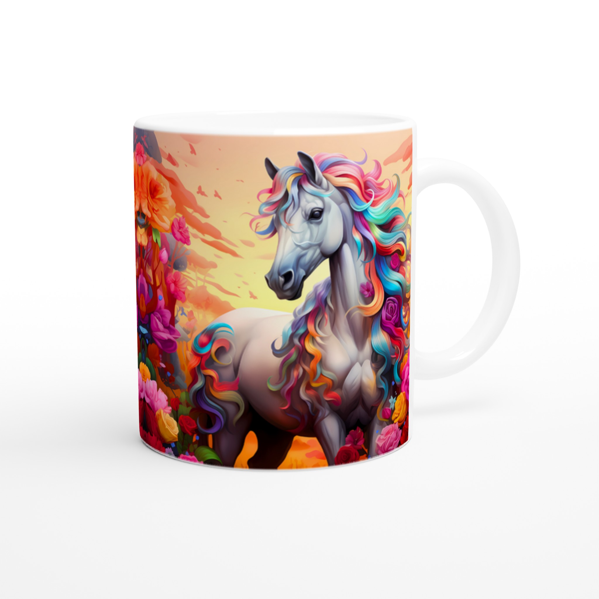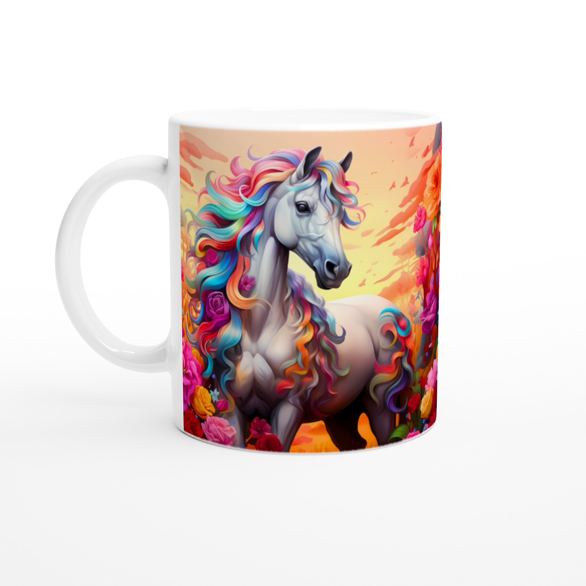 Fånga magin i varje sip med vår underbara Keramiska mugg, prydd med en majestätisk häst med en svallande regnbågsfärgad man. Denna mugg är inte bara en dröm för ögat, utan också designad för att snabbt bli en vardagsfavorit. Perfekt för morgonkaffet, kvällens varma choklad eller när du bara vill njuta av en kopp te. Den blanka ytan framhäver de klara och levande färgerna från det fantastiska motivet, som håller sig fina även efter många turer i mikron och diskmaskinen.