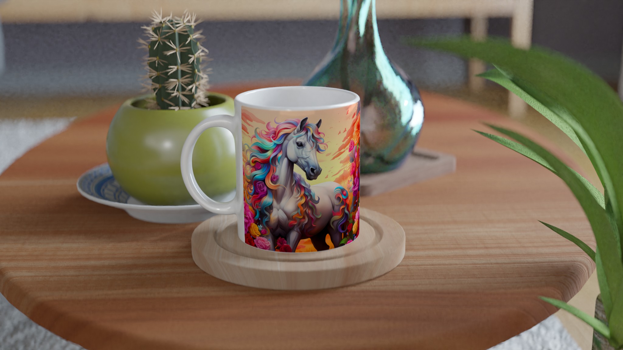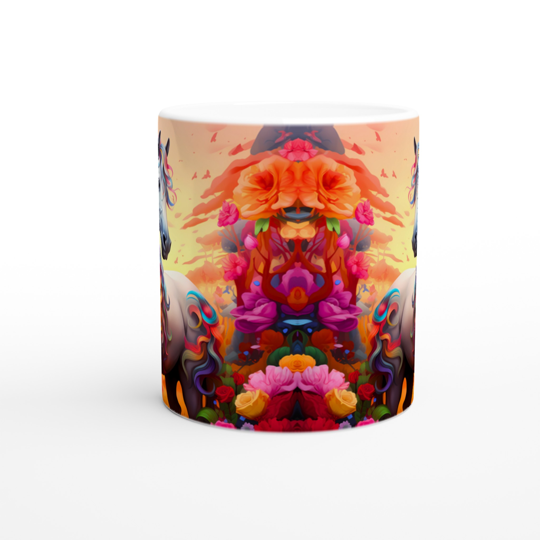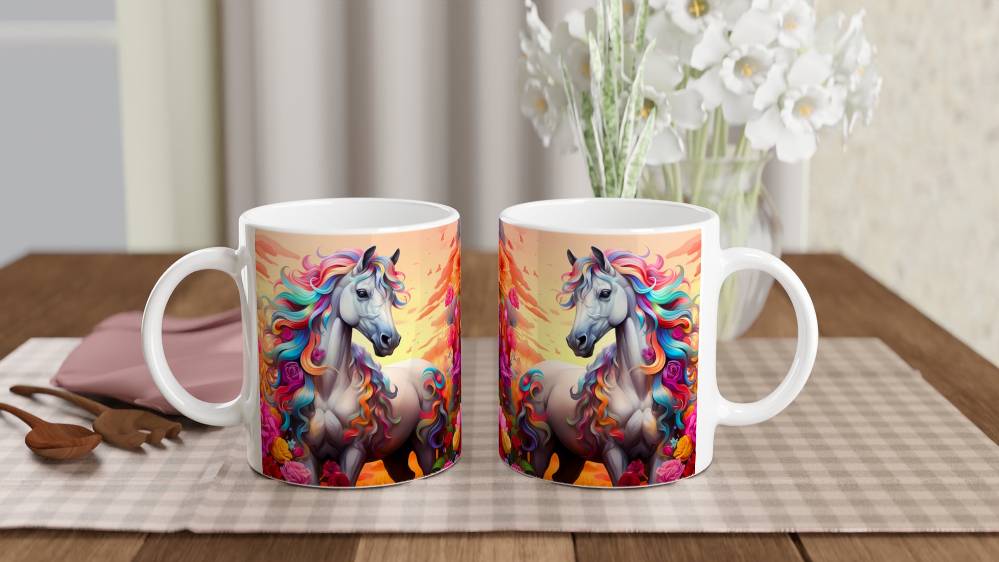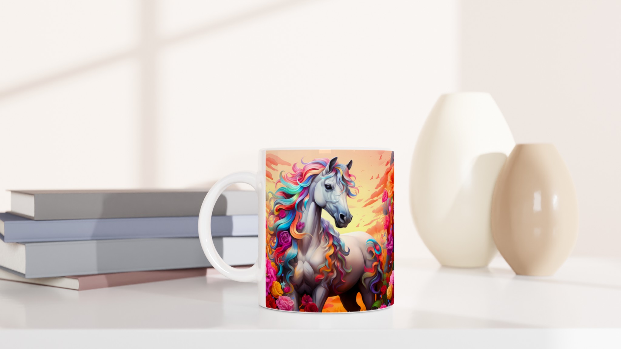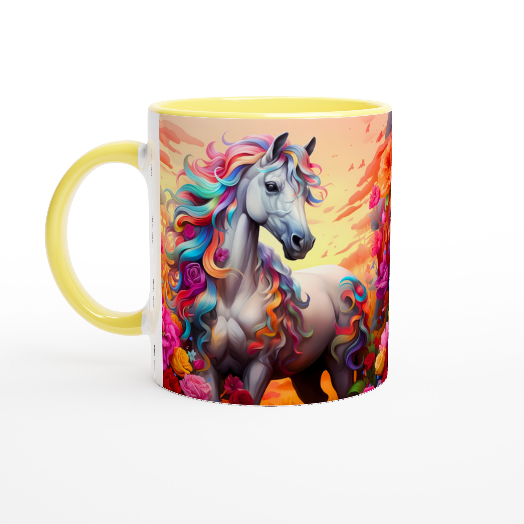 Fånga magin i varje sip med vår underbara Keramiska mugg, prydd med en majestätisk häst med en svallande regnbågsfärgad man. Denna mugg är inte bara en dröm för ögat, utan också designad för att snabbt bli en vardagsfavorit. Perfekt för morgonkaffet, kvällens varma choklad eller när du bara vill njuta av en kopp te. Den blanka ytan framhäver de klara och levande färgerna från det fantastiska motivet, som håller sig fina även efter många turer i mikron och diskmaskinen.