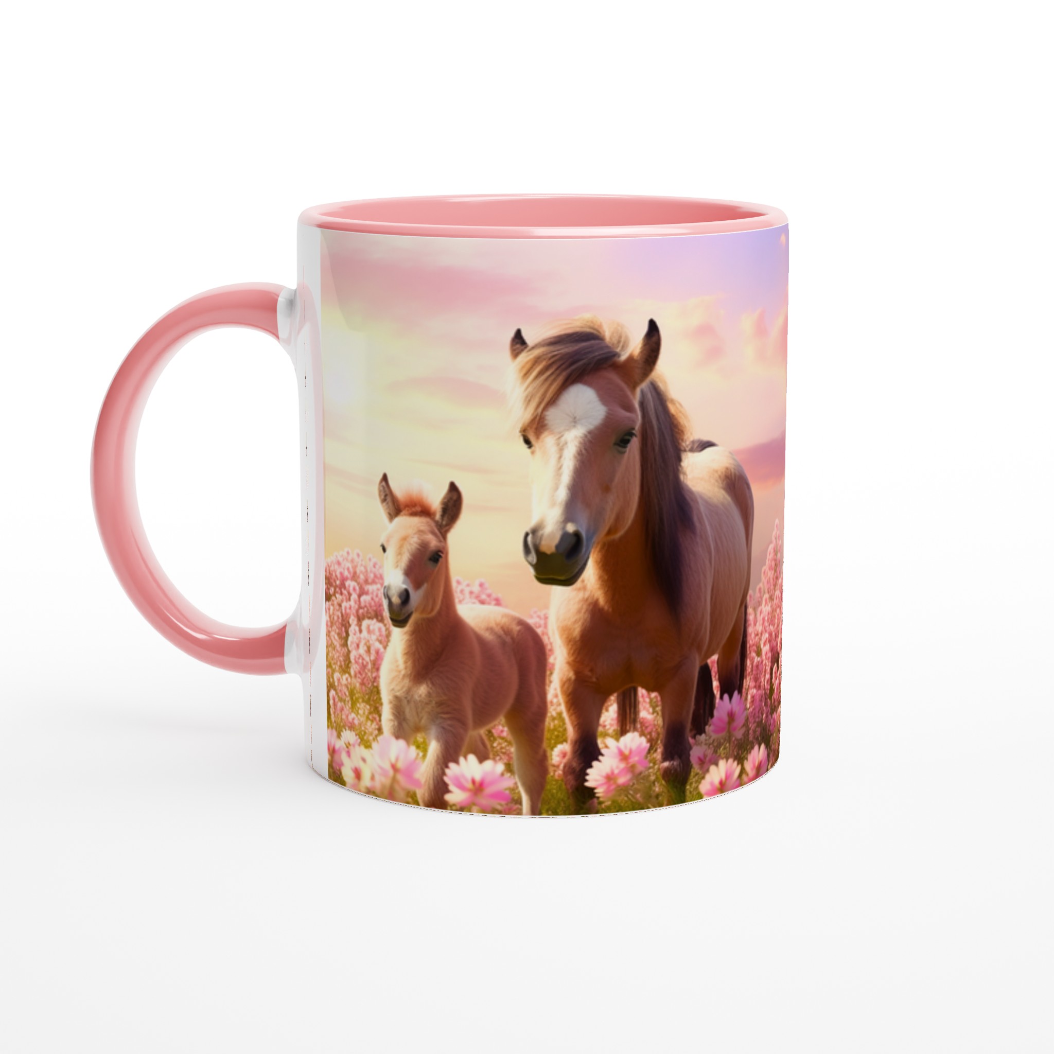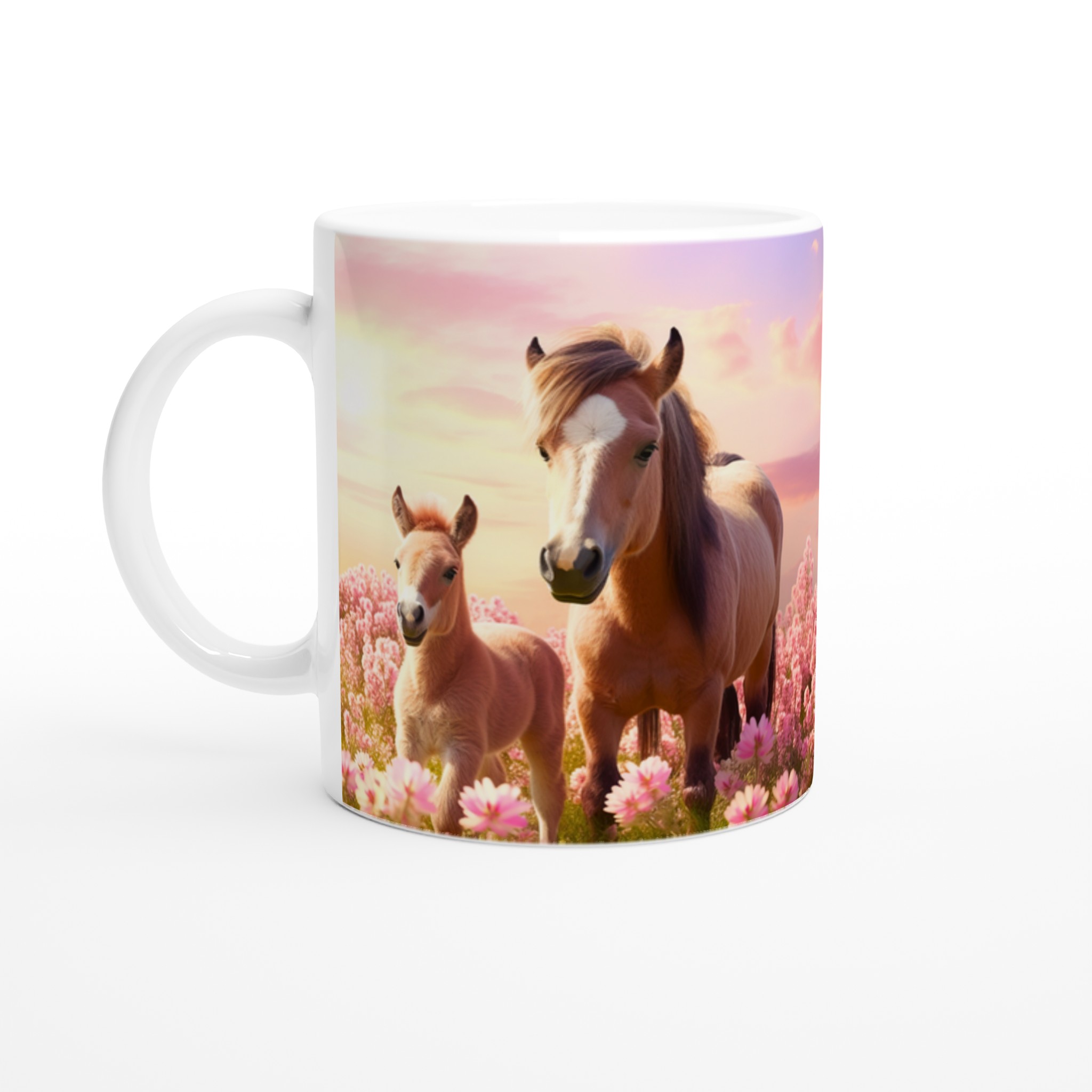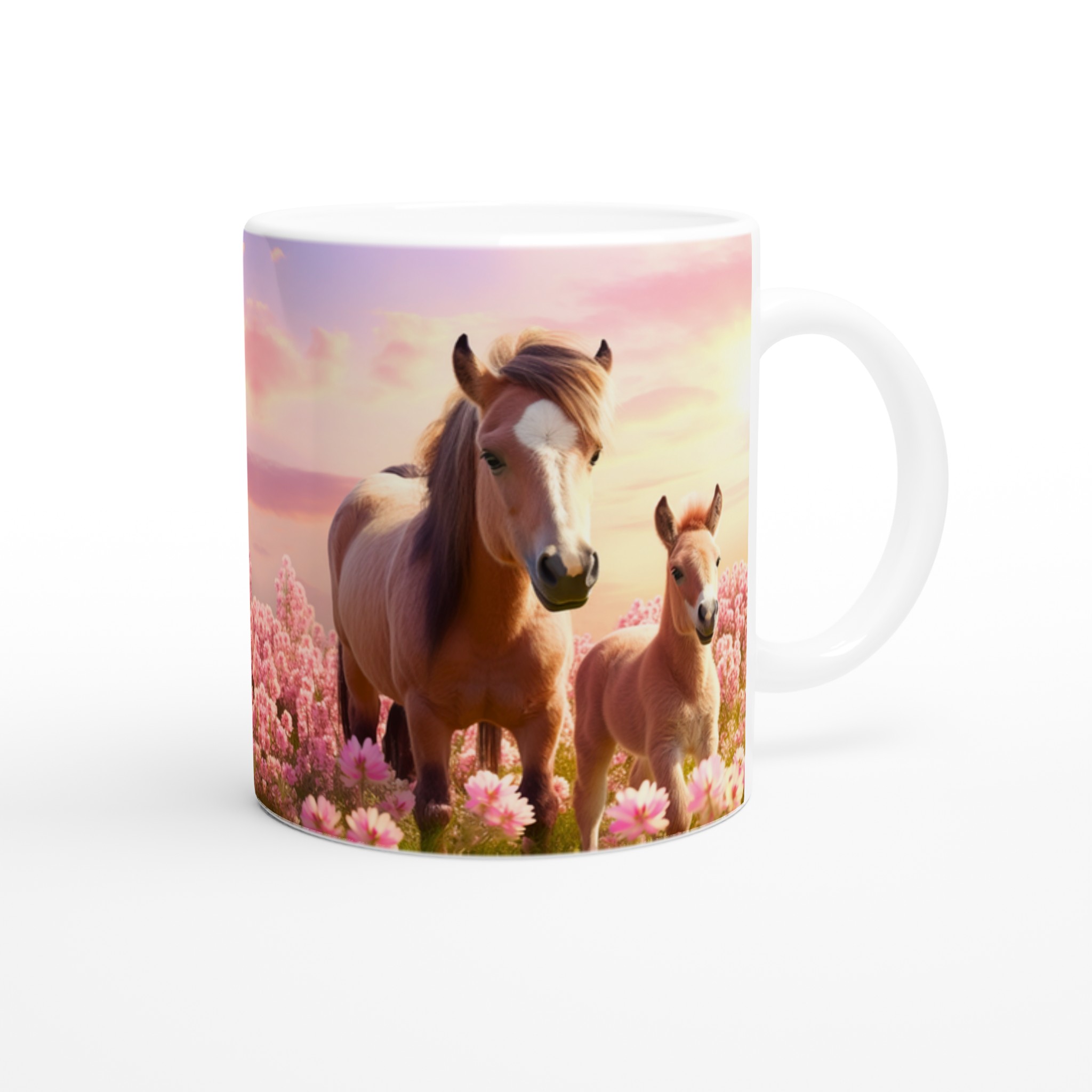 Vakna upp till en förtrollande äng av rosa blommor och dessa bedårande hästar varje morgon med vår ”Mugg med Rosa Hästmotiv”. Denna stilrena keramiska mugg blir snabbt en vardagsfavorit. Perfekt för morgonkaffet, kvällens varma choklad eller när du bara vill njuta av en kopp te. Låt det charmiga motivet av ett föl och dess mor i en solnedgångsfärgad blomsteräng lyfta din sinnesstämning. Den blanka vita ytan gör att trycken framhävs med klara och levande färger, som håller sig fina även efter många turer i mikron och diskmaskinen.