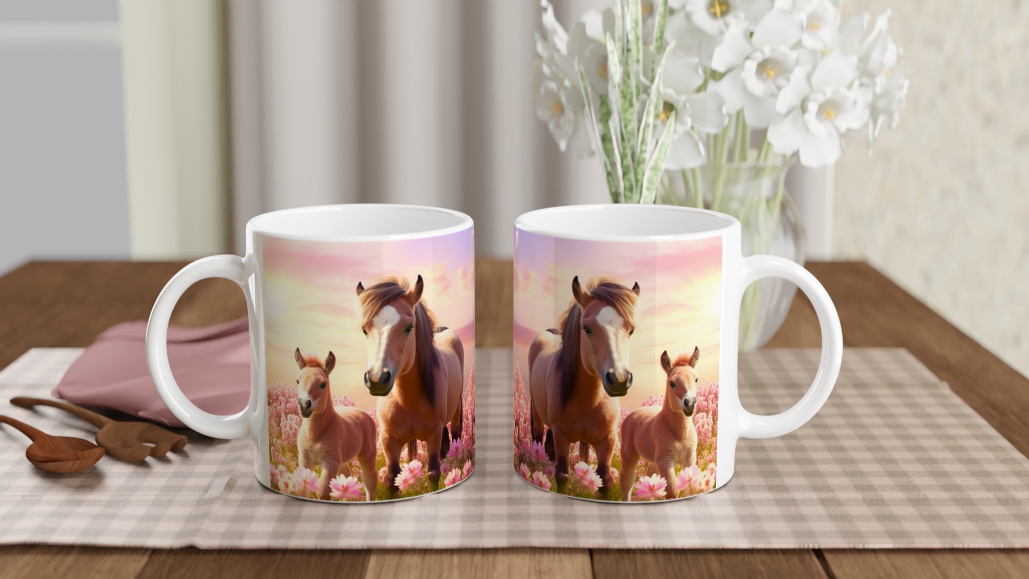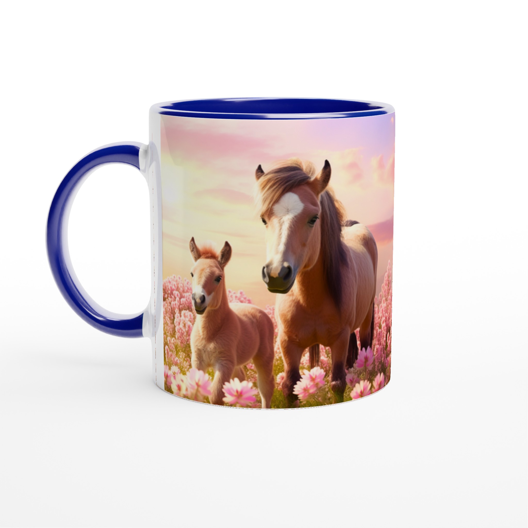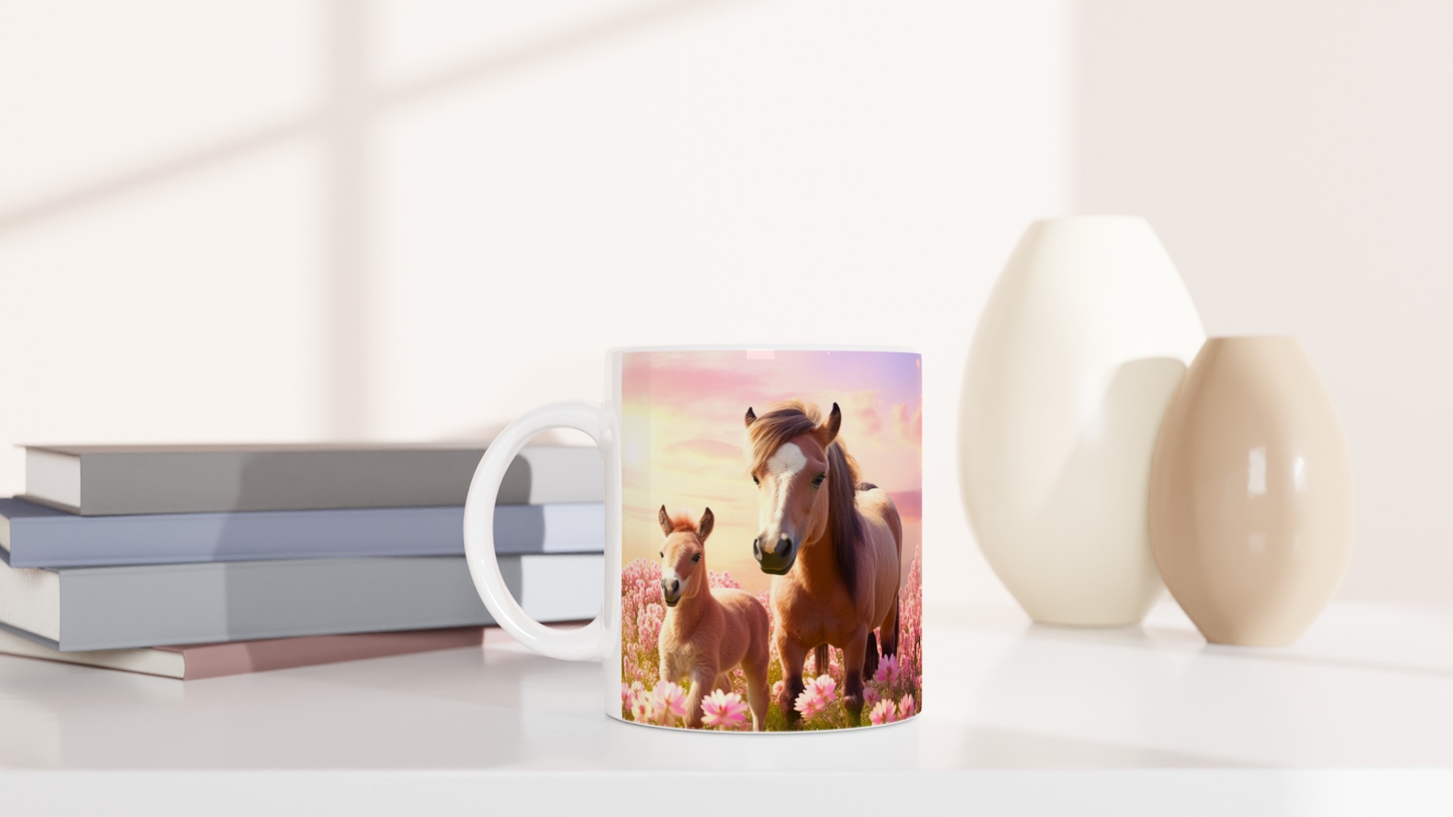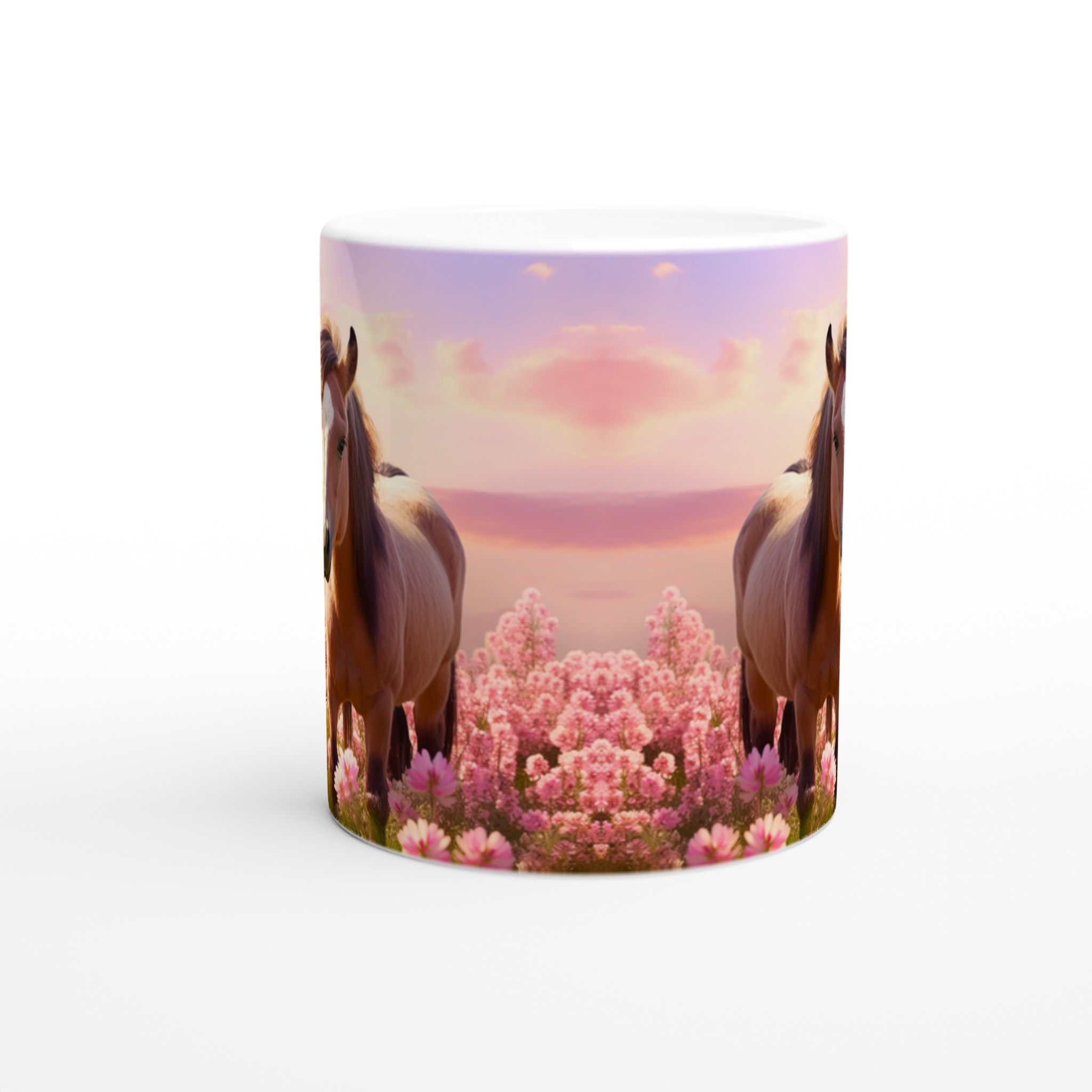 Vakna upp till en förtrollande äng av rosa blommor och dessa bedårande hästar varje morgon med vår ”Mugg med Rosa Hästmotiv”. Denna stilrena keramiska mugg blir snabbt en vardagsfavorit. Perfekt för morgonkaffet, kvällens varma choklad eller när du bara vill njuta av en kopp te. Låt det charmiga motivet av ett föl och dess mor i en solnedgångsfärgad blomsteräng lyfta din sinnesstämning. Den blanka vita ytan gör att trycken framhävs med klara och levande färger, som håller sig fina även efter många turer i mikron och diskmaskinen.