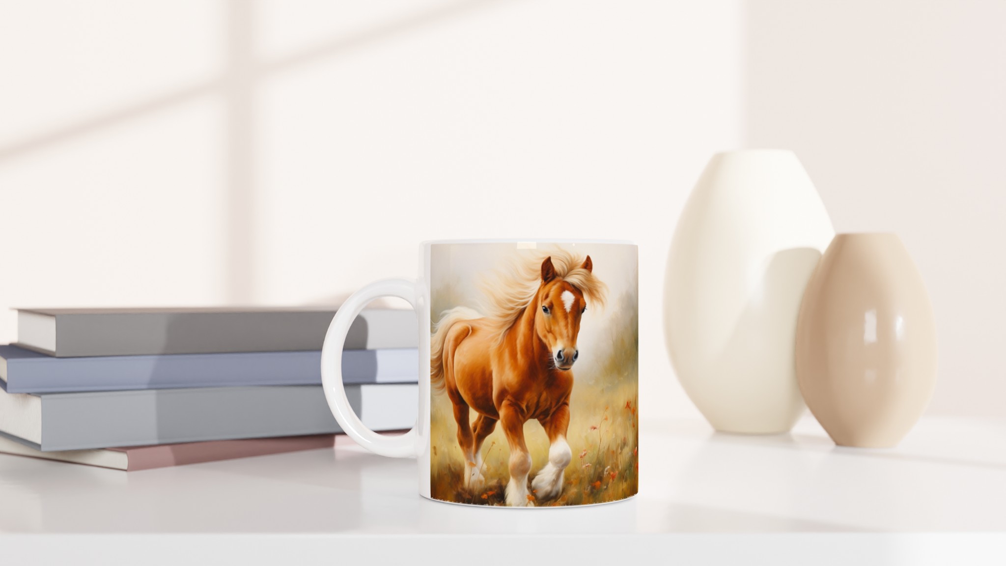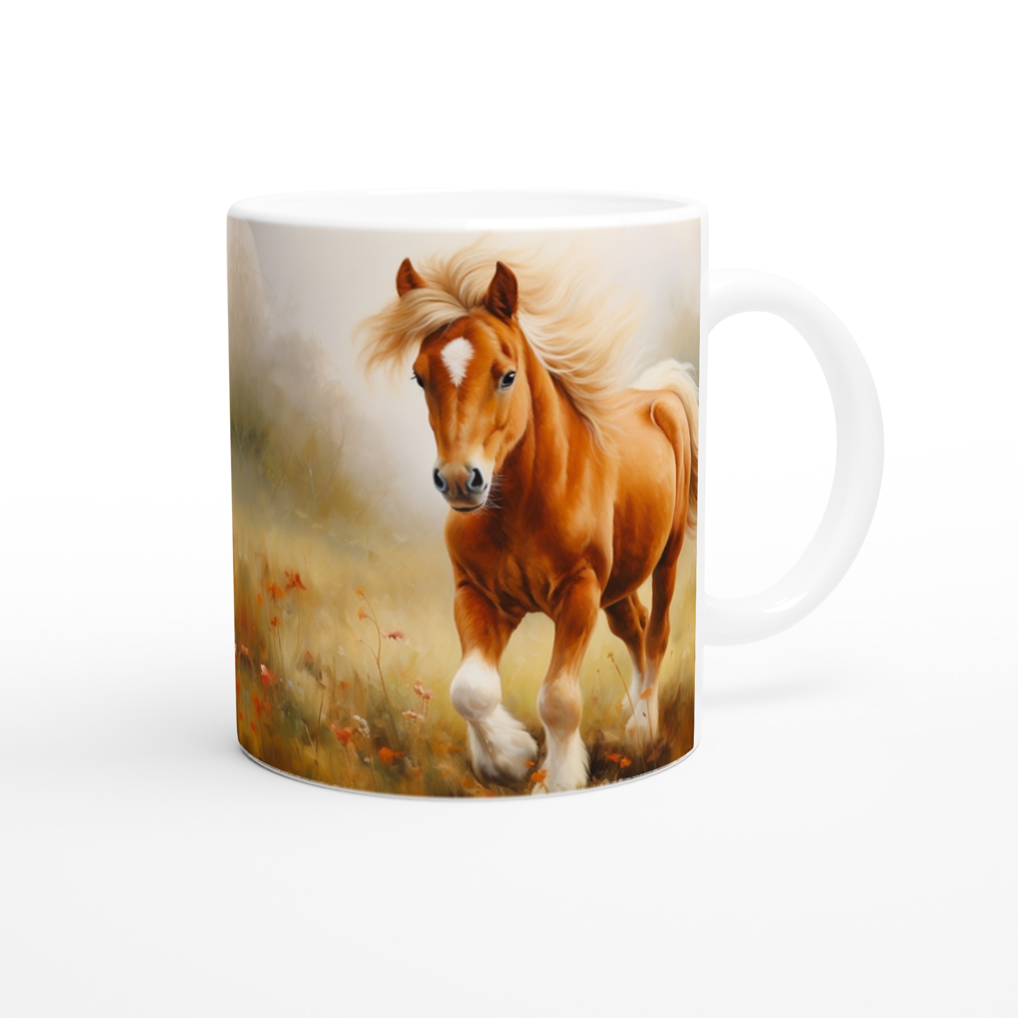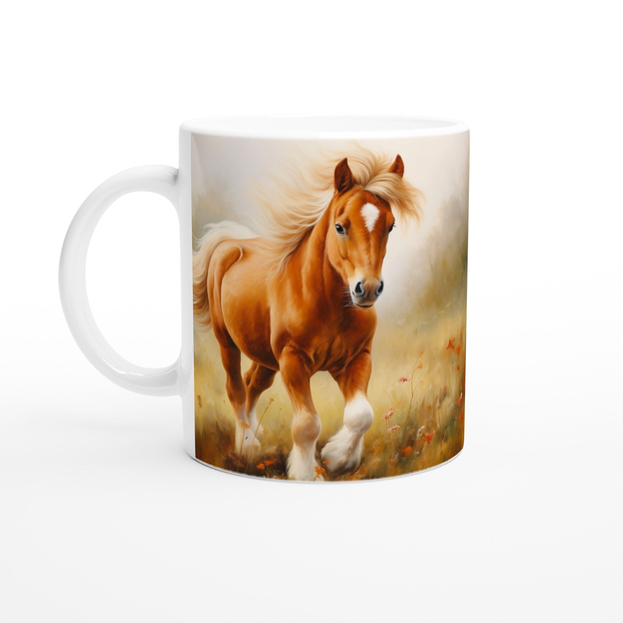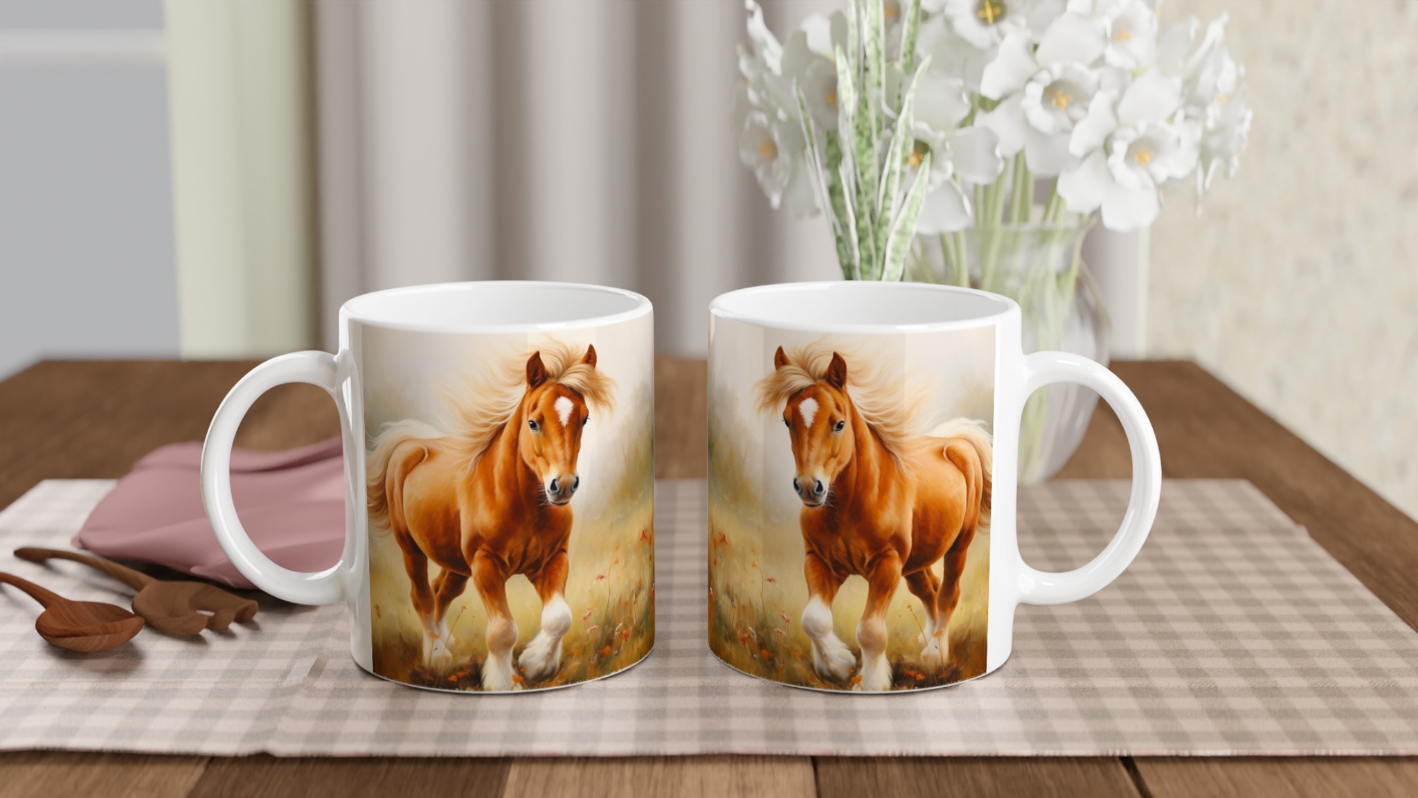 Fånga den fria andan med vår Keramisk mugg – vardagsfavoriten för alla tillfällen, utsmyckad med en majestätisk vildhäst som galopperar genom ett drömskt landskap. Denna mugg förvandlar varje sipp till en flykt till naturen, med sin varma färgpalett och konstnärliga penseldrag som ger en känsla av lugn och styrka.