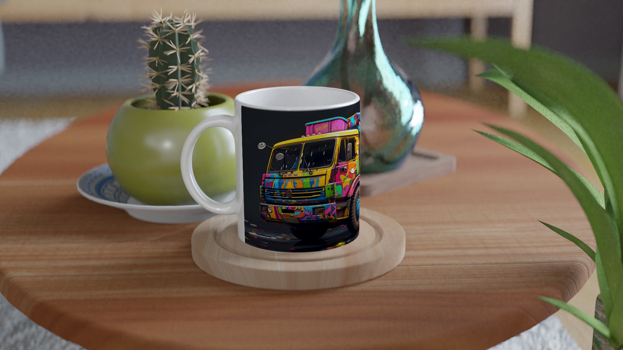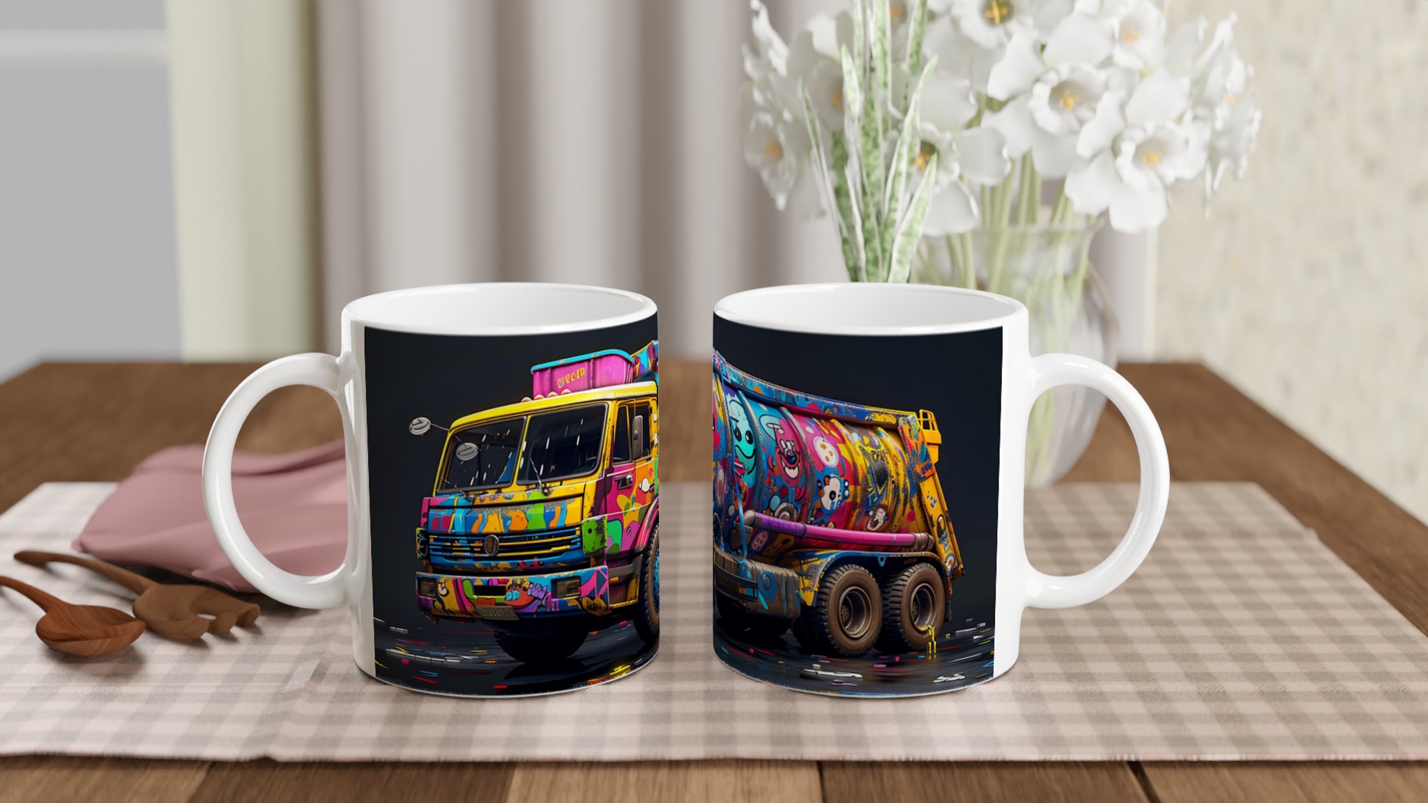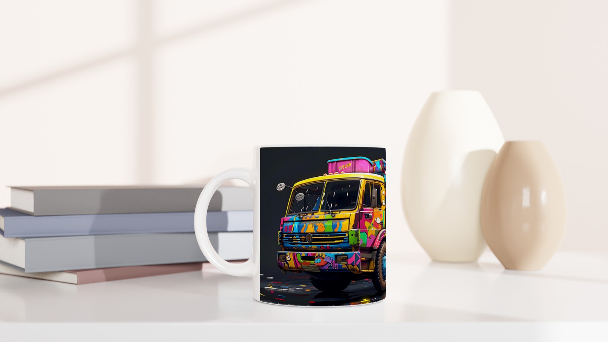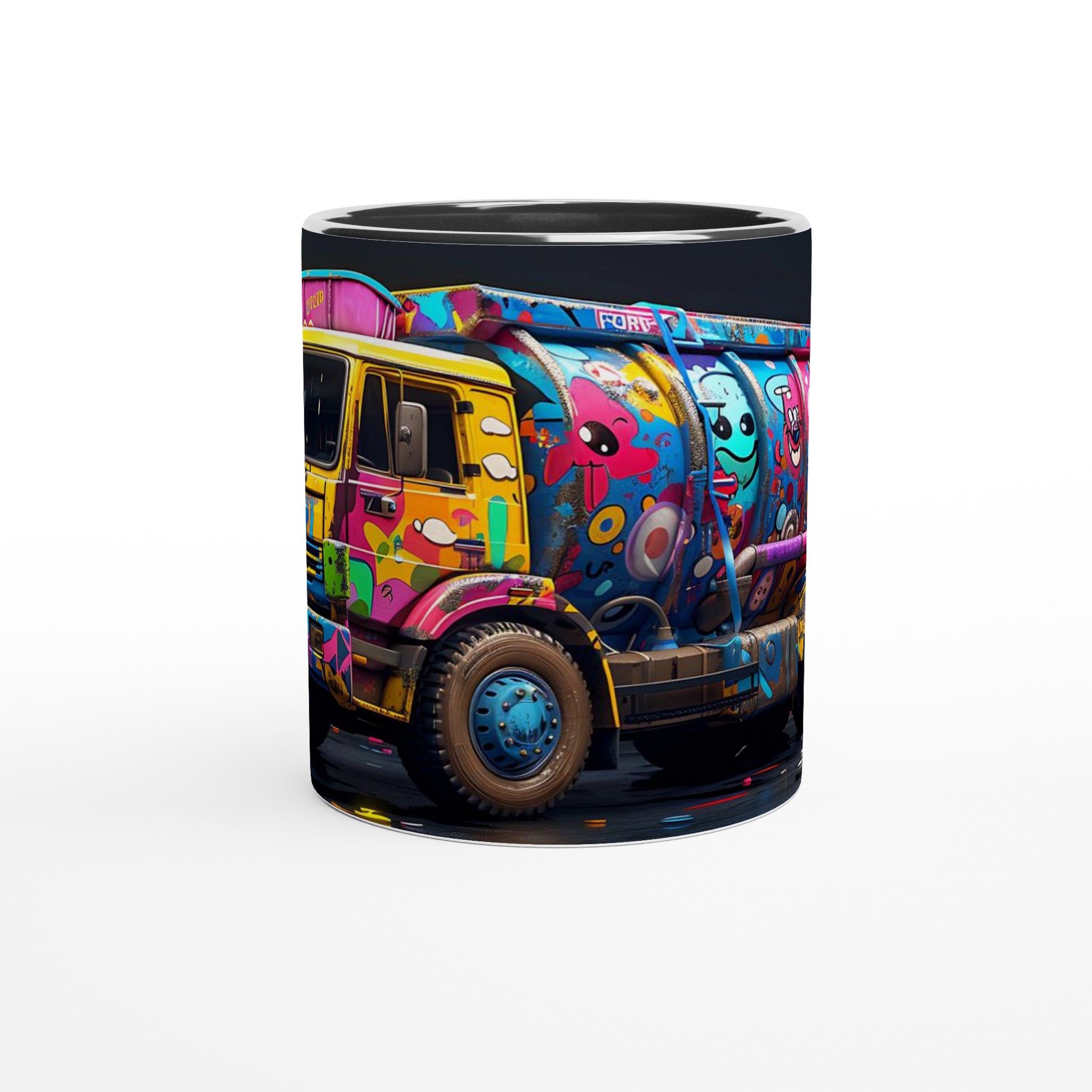 Den blanka vita ytan på denna 11 oz (ca 3,25 dl) mugg är den perfekta duken för det detaljerade och färgstarka ”Pop Art Graffiti Truck”-trycket. Designen framträder med en oslagbar klarhet, vilket gör denna mugg till en sann konversationsstartare och en glädjefylld detalj i ditt hem eller på kontoret. Välj din favorit bland en palett av sju härliga keramiska färger: klassiskt Vit, solig Gul, charmigt Rosa, naturligt Grön, passionerat Röd, elegant Svart eller lugnande Blå för att matcha din personliga stil eller som en perfekt present.
