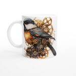Låt dig inspireras varje dag av denna unika keramiska mugg med sitt fascinerande motiv av en livfull fågel elegant balanserad bland intrikata kugghjul och delikata blommor. Denna design förenar naturens skönhet med mekanikens komplexitet, skapad med akvarellens mjuka estetik och steampunkens detaljrikedom. Det är den perfekta muggen för att ge din morgonrutin en konstnärlig och tankeväckande touch, eller för att förgylla fikastunden med en kopp varm choklad eller te.