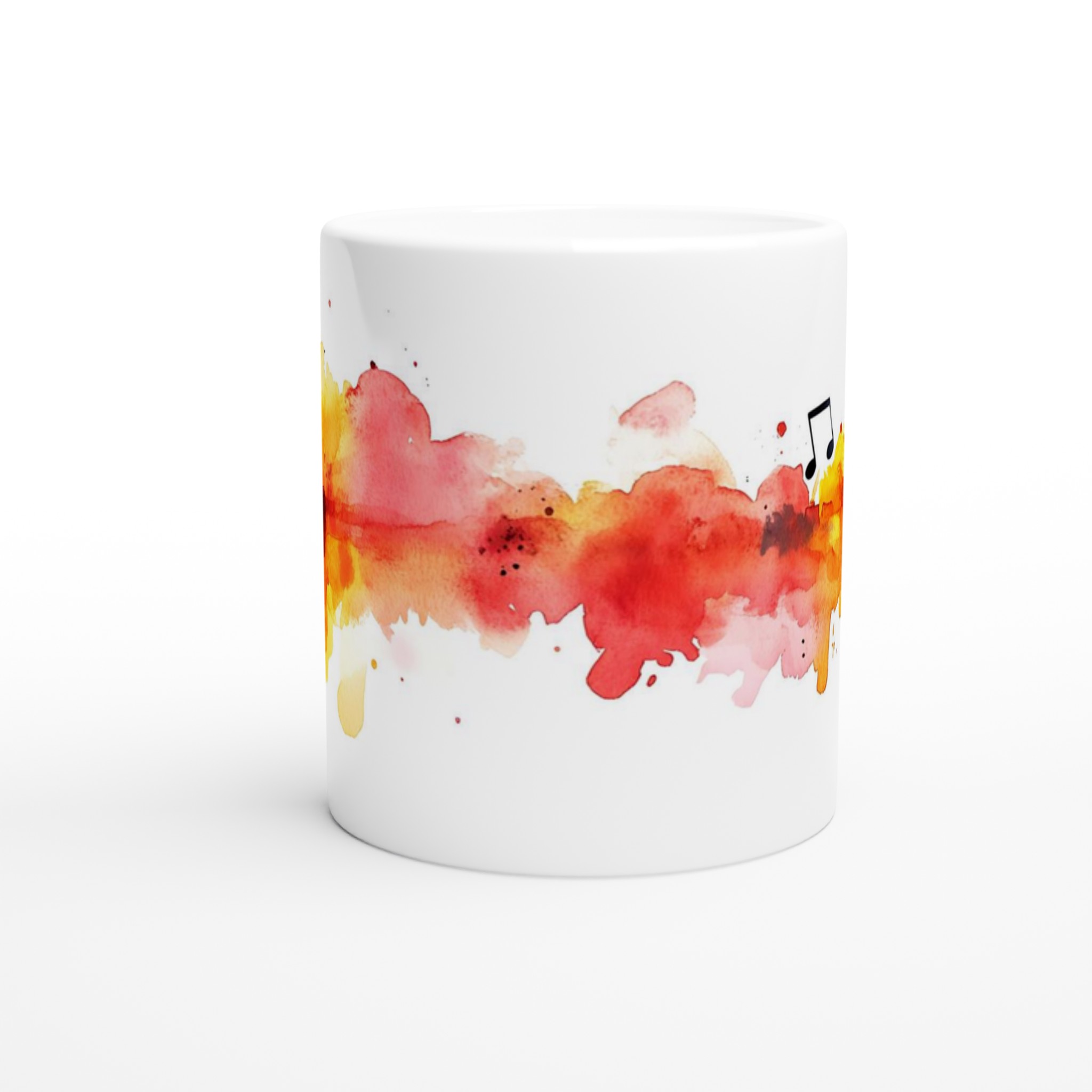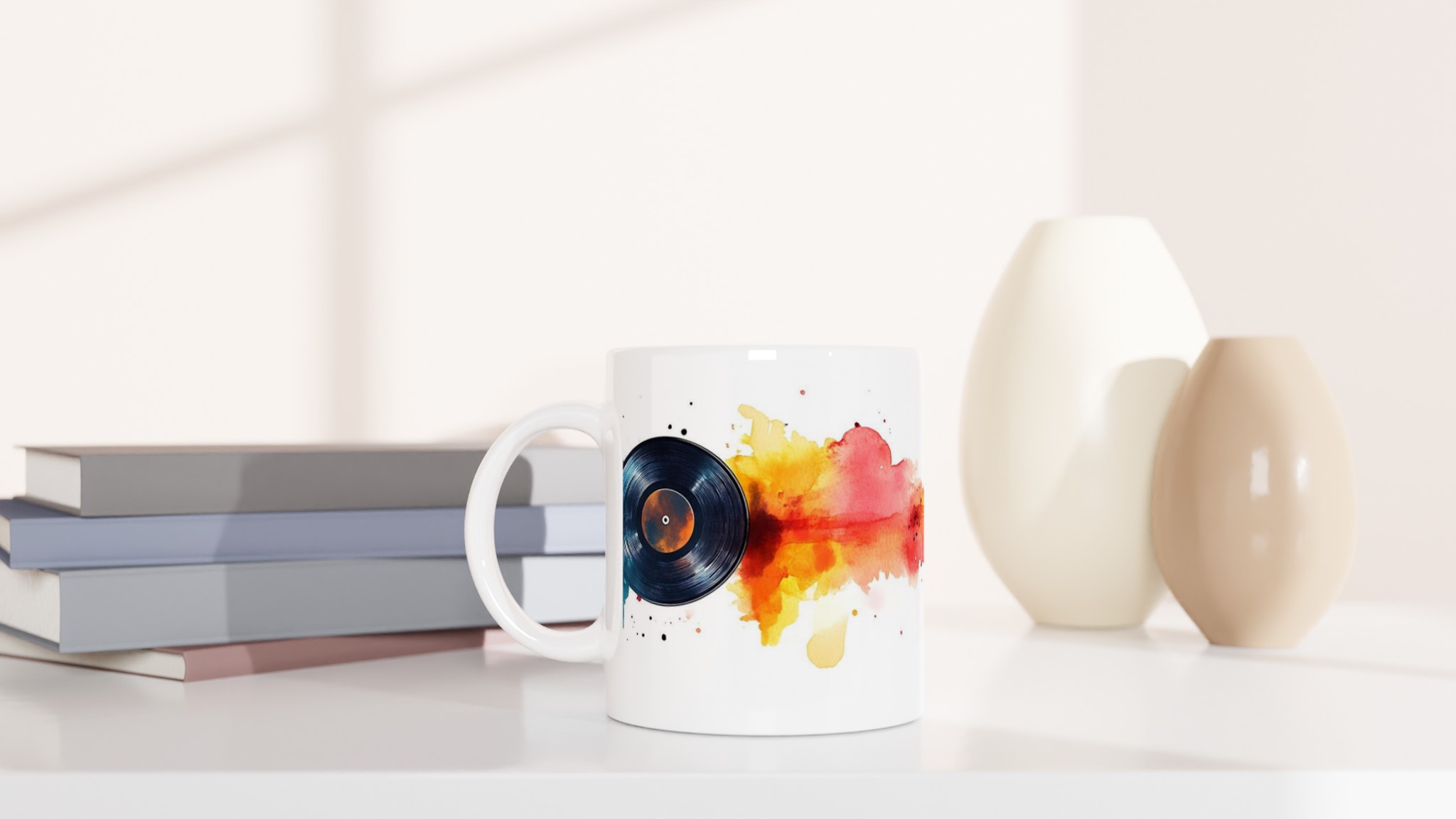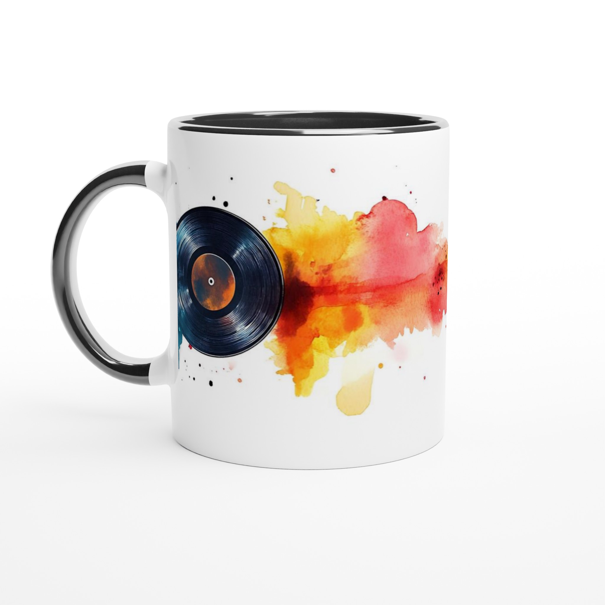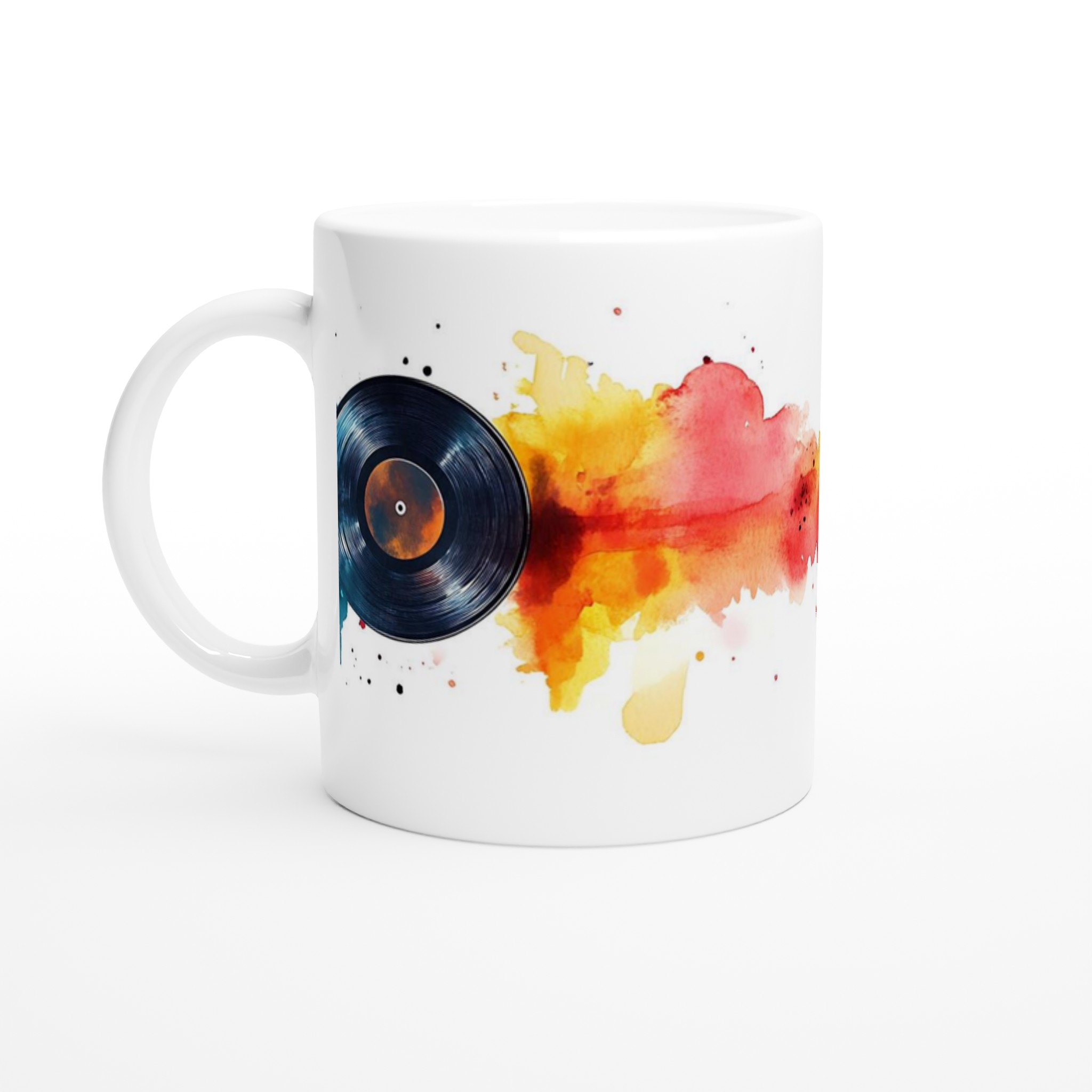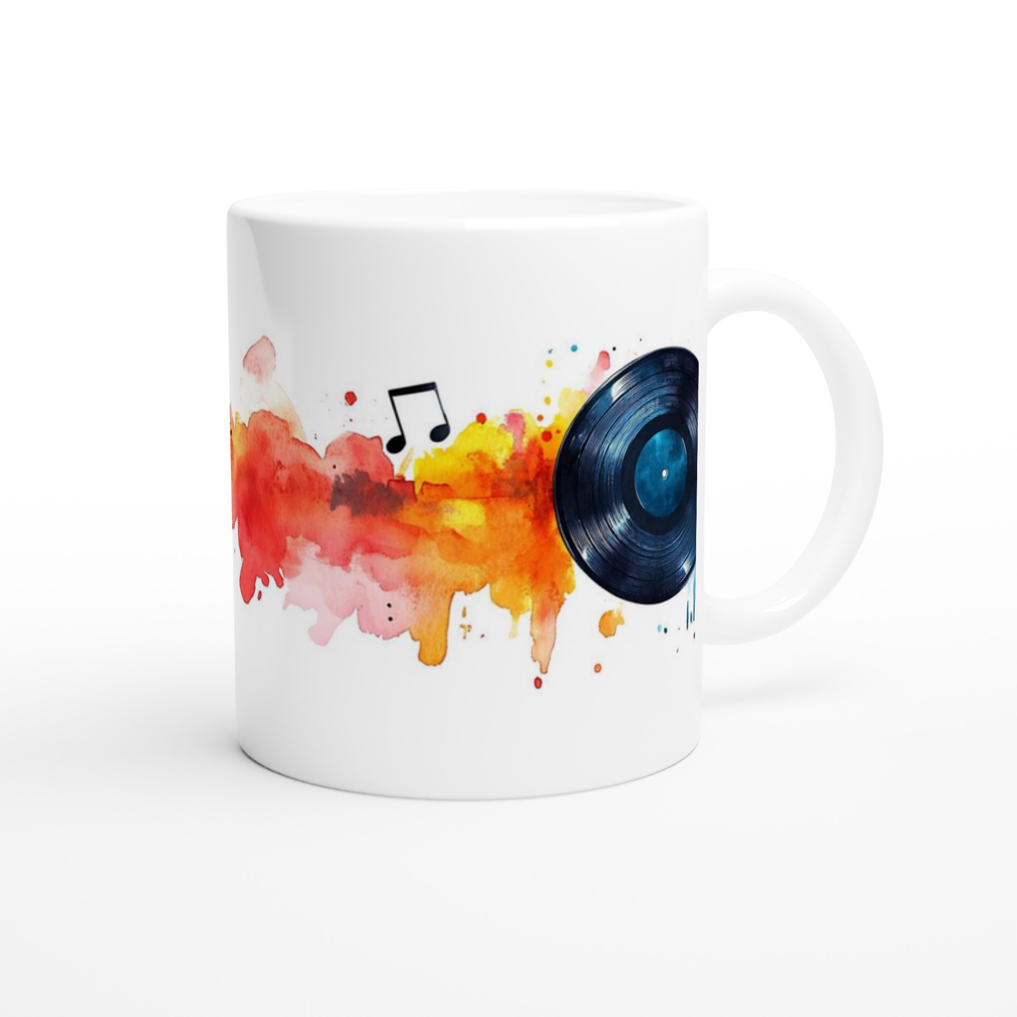 Låt din kärlek till musik och färg flöda med vår unika musikalisk akvarellmugg. Denna mugg fångar den dynamiska energin från två retro vinylskivor, smälter samman med livfulla stänk av akvarell i varma orangea, röda och gula toner samt lugnande blå nyanser. Med en ensam musiknot som svävar elegant, är den här designen perfekt för DJ:s, musikälskare eller alla som uppskattar konstnärliga uttryck i sin vardag.