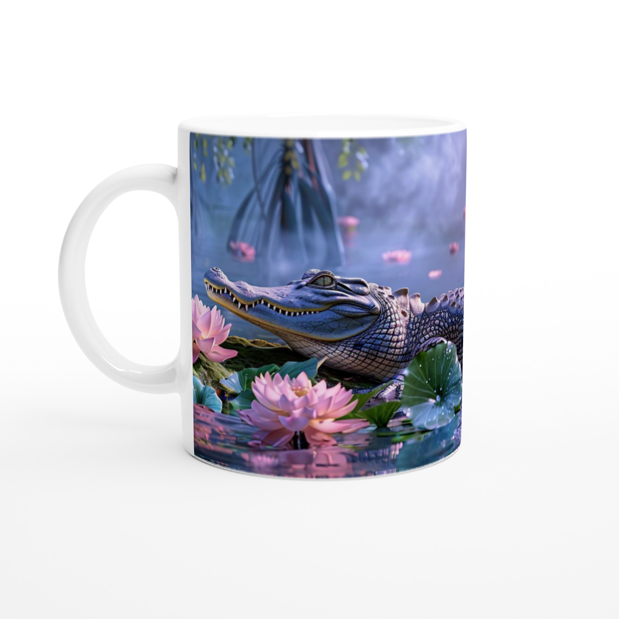 Lyft varje kaffestund med vår premium keramikmugg – stilren, hållbar och skapad för att låta ditt motiv glänsa. Denna mugg fångar den mystiska skönheten hos en alligator omgiven av dimrosa lotusblommor och lila skymningsnyanser, precis som den drömlika scenen i bilden.