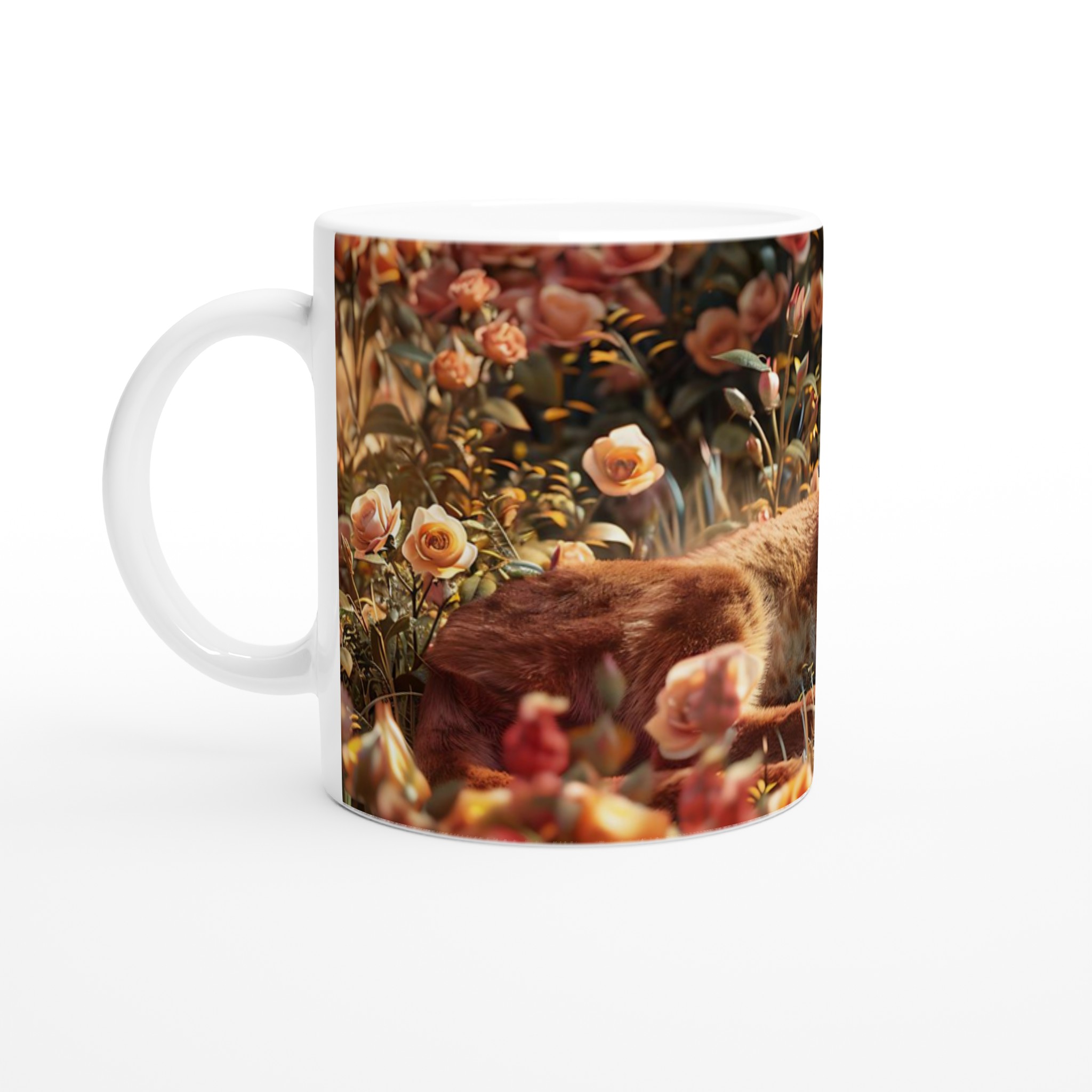 Inspirerad av den mystiska skönheten hos en karakal vilande bland gyllene rosor, fångar denna mugg en drömsk och förtrollande atmosfär. Den blanka vita ytan ger ett skarpt och levande tryck som verkligen sticker ut, oavsett om det är en personlig design, ett roligt citat eller en present till någon du tycker om.